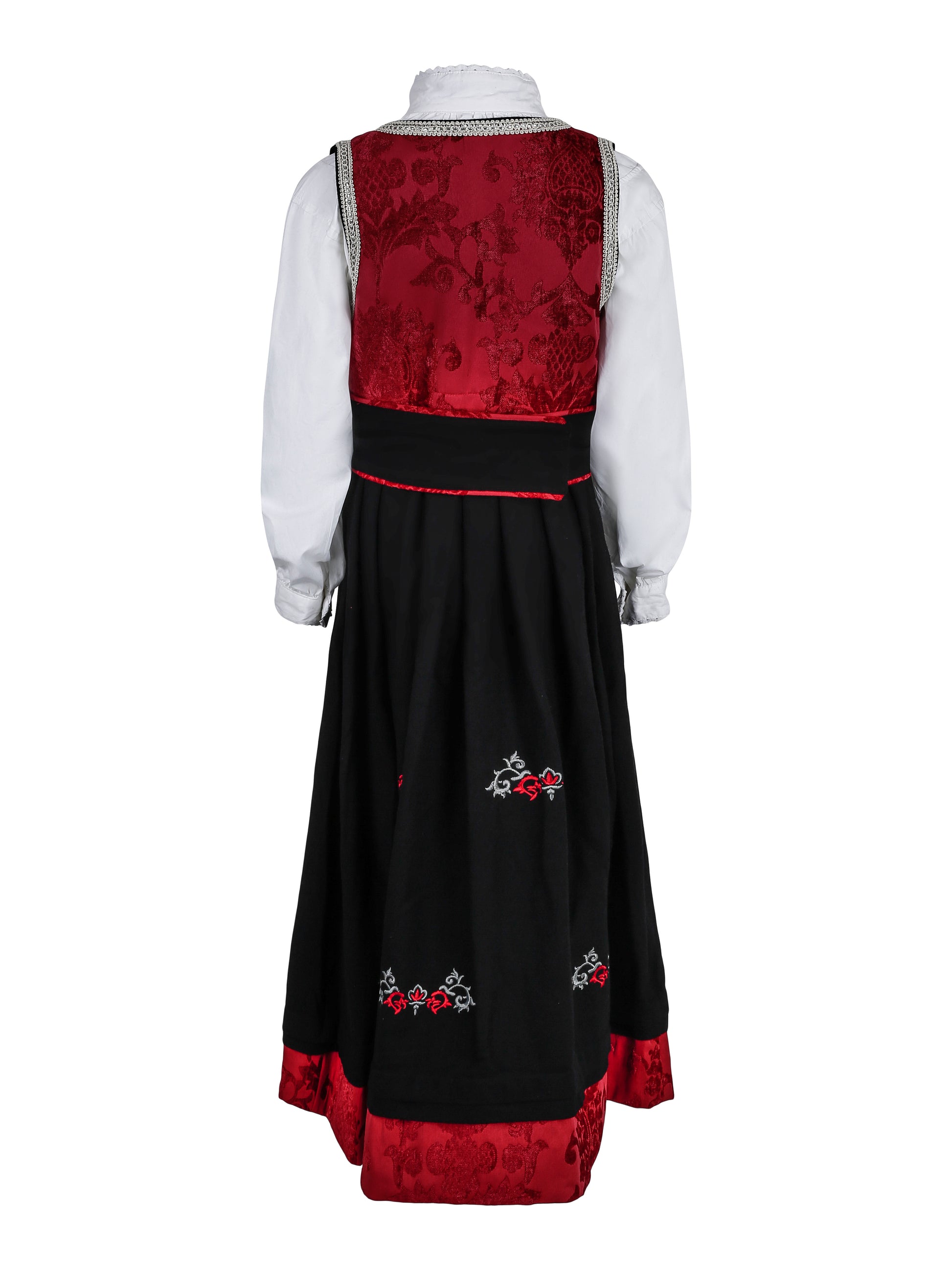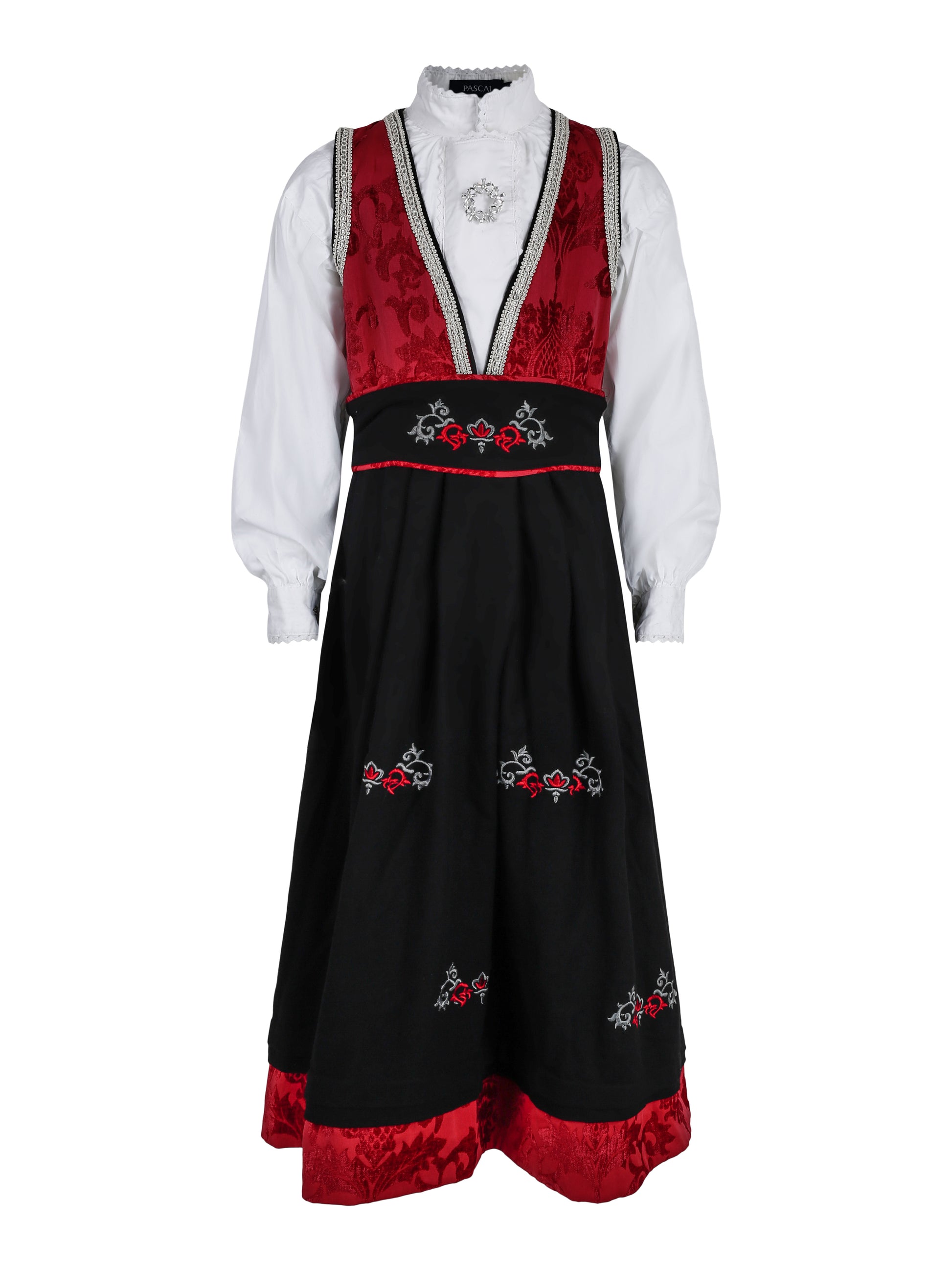Nydelig rød festdrakt / bunad til jenter fra norske Pascal. Med hvit bunadsskjorte.