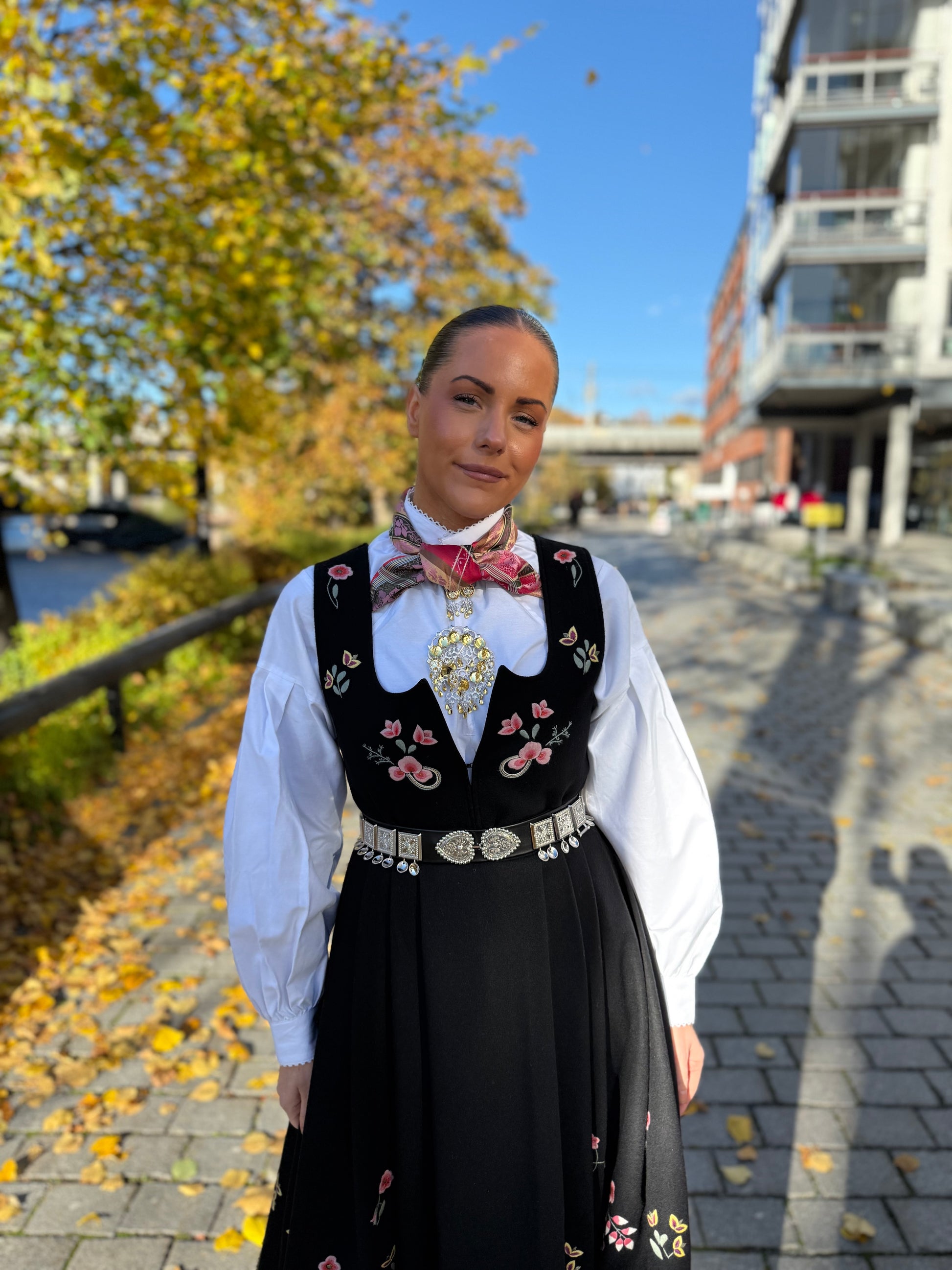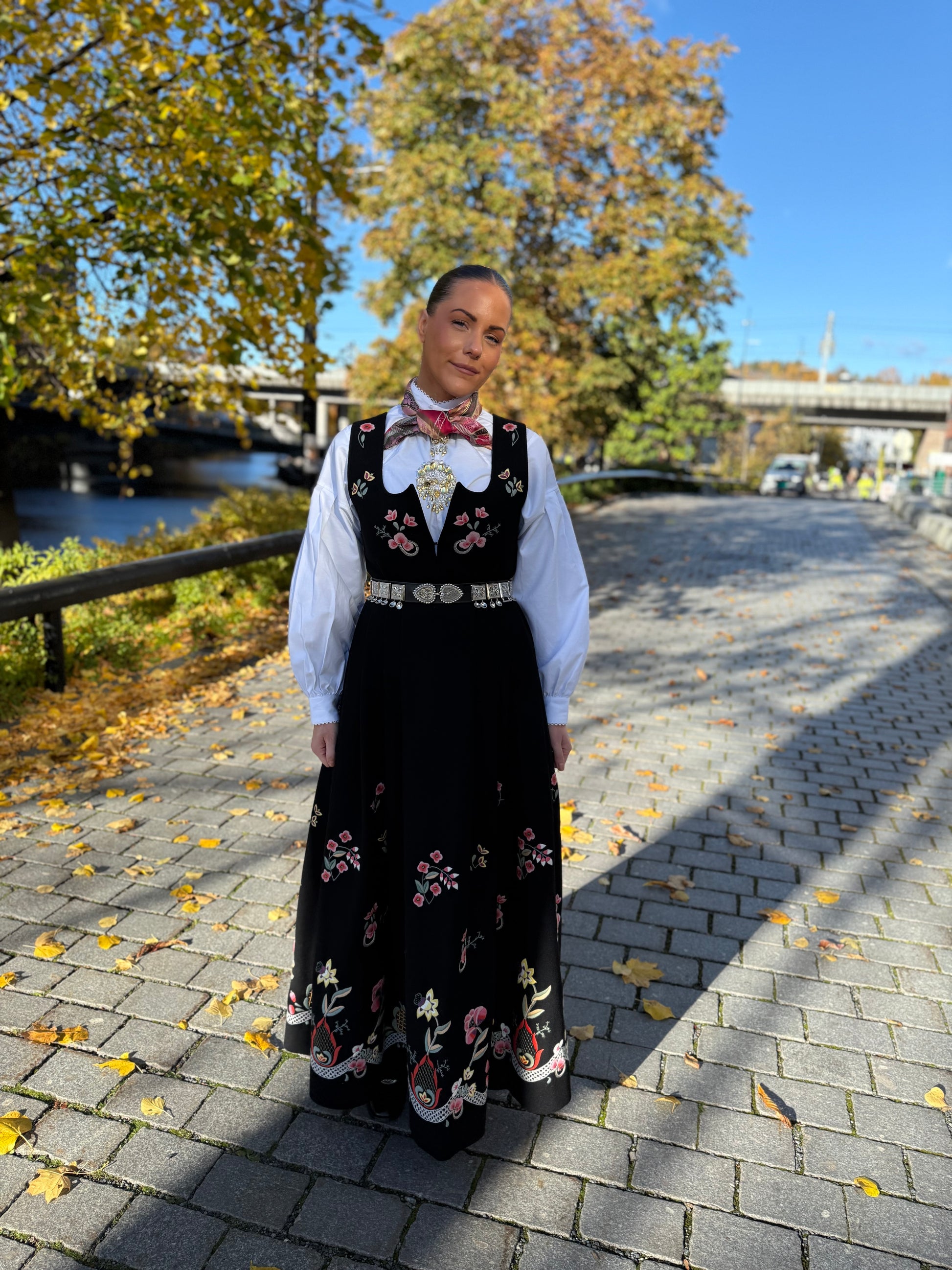 - Bunadsveske med broderier (uten veskelås). Vesken er lik stakken i kvalitet og farge.
