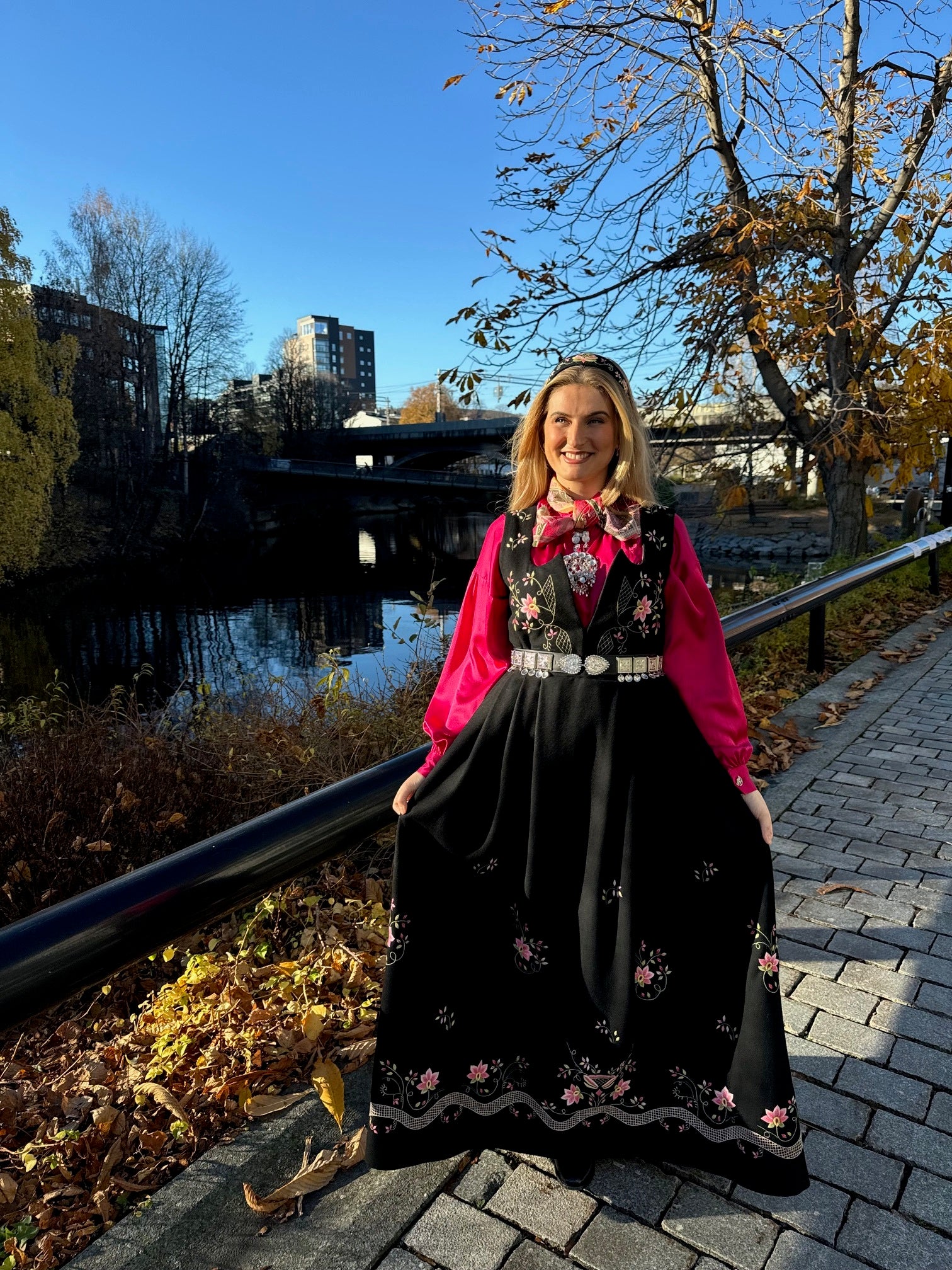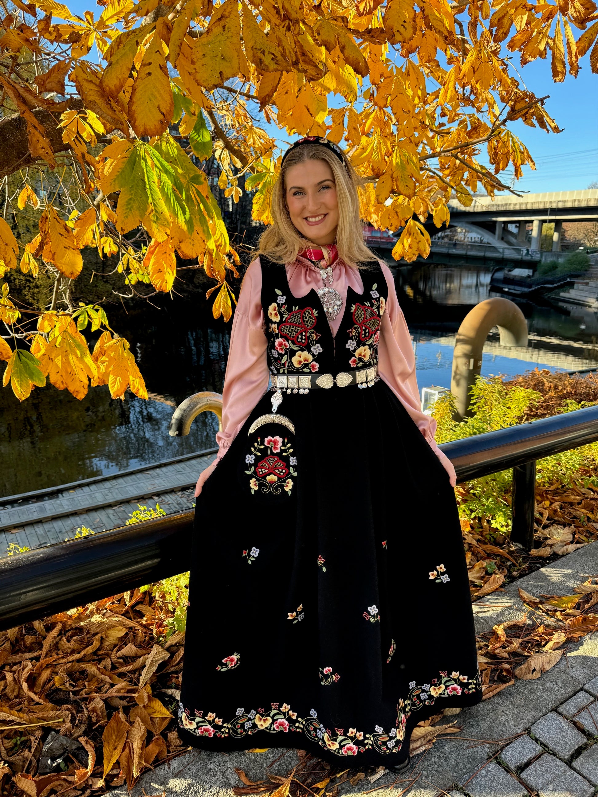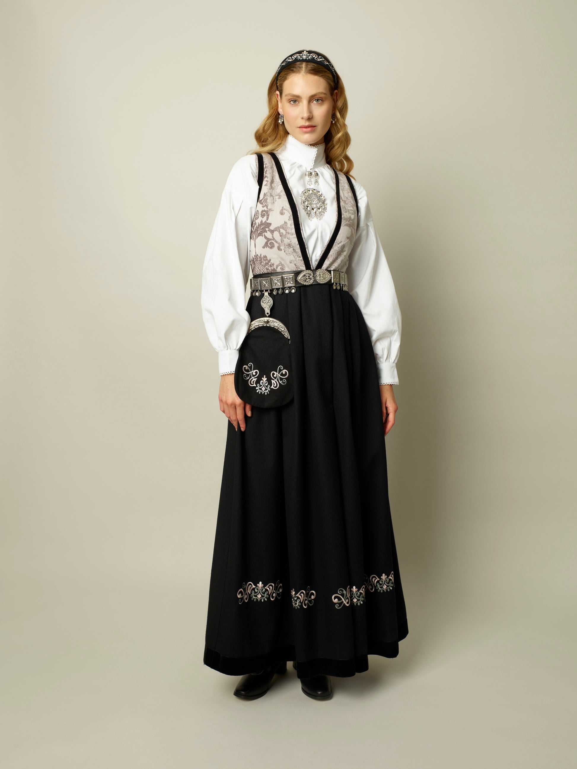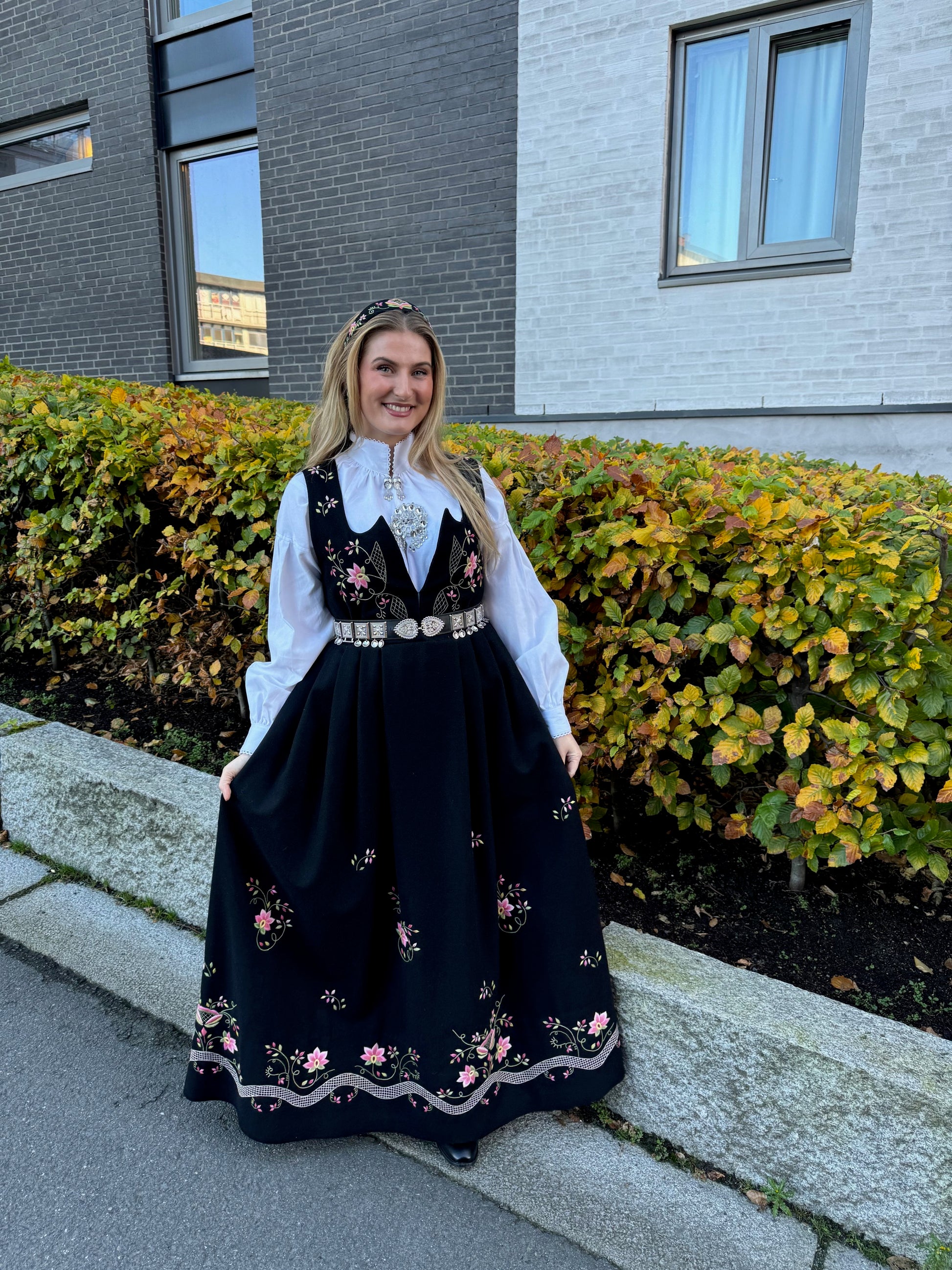 Nydelig bunadsbelte i skinn med metallspenner i bunadsmønster.