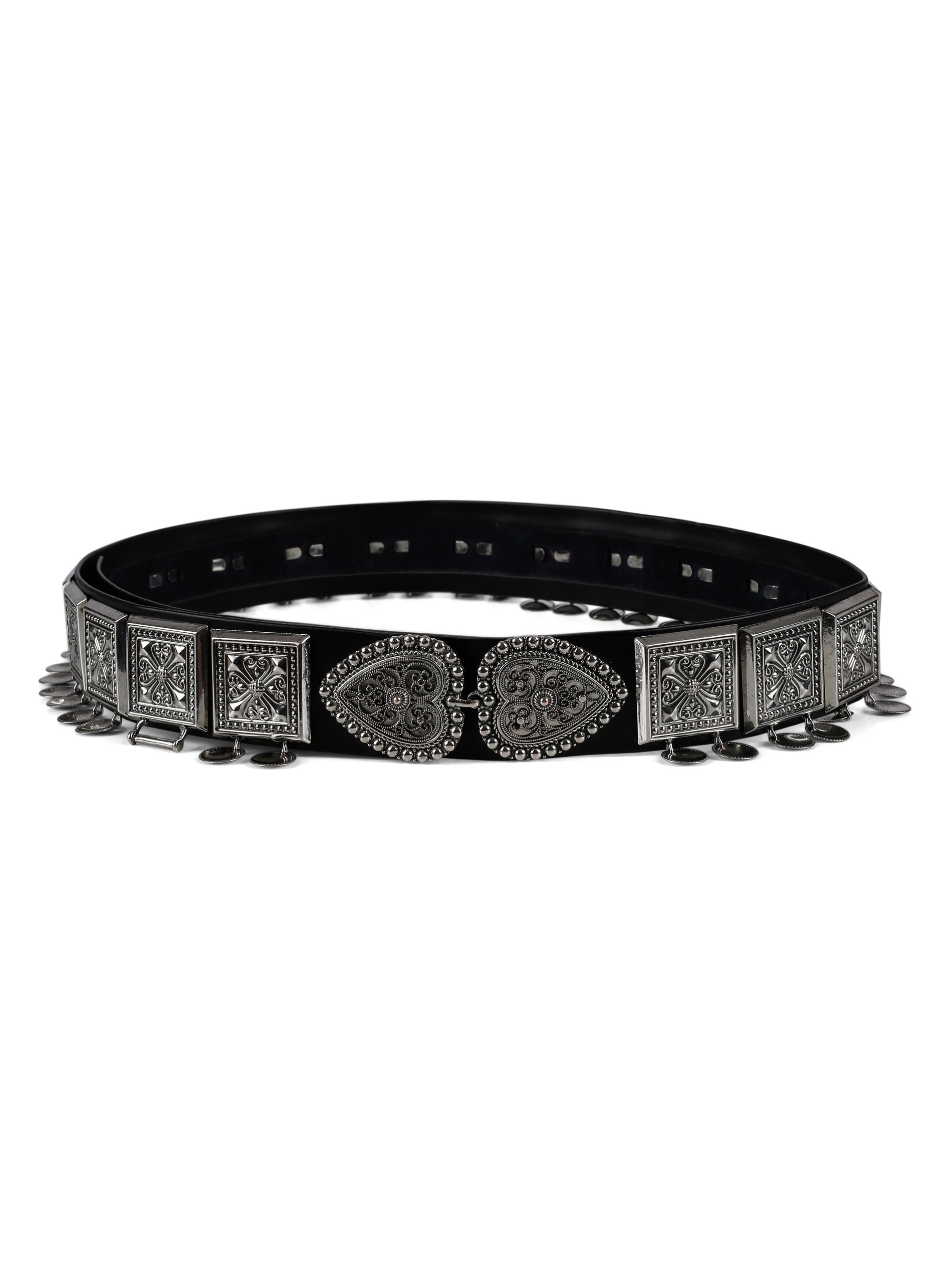 Beltet kan justeres opp og ned i størrelse. Søljene er ikke i ekte sølv.