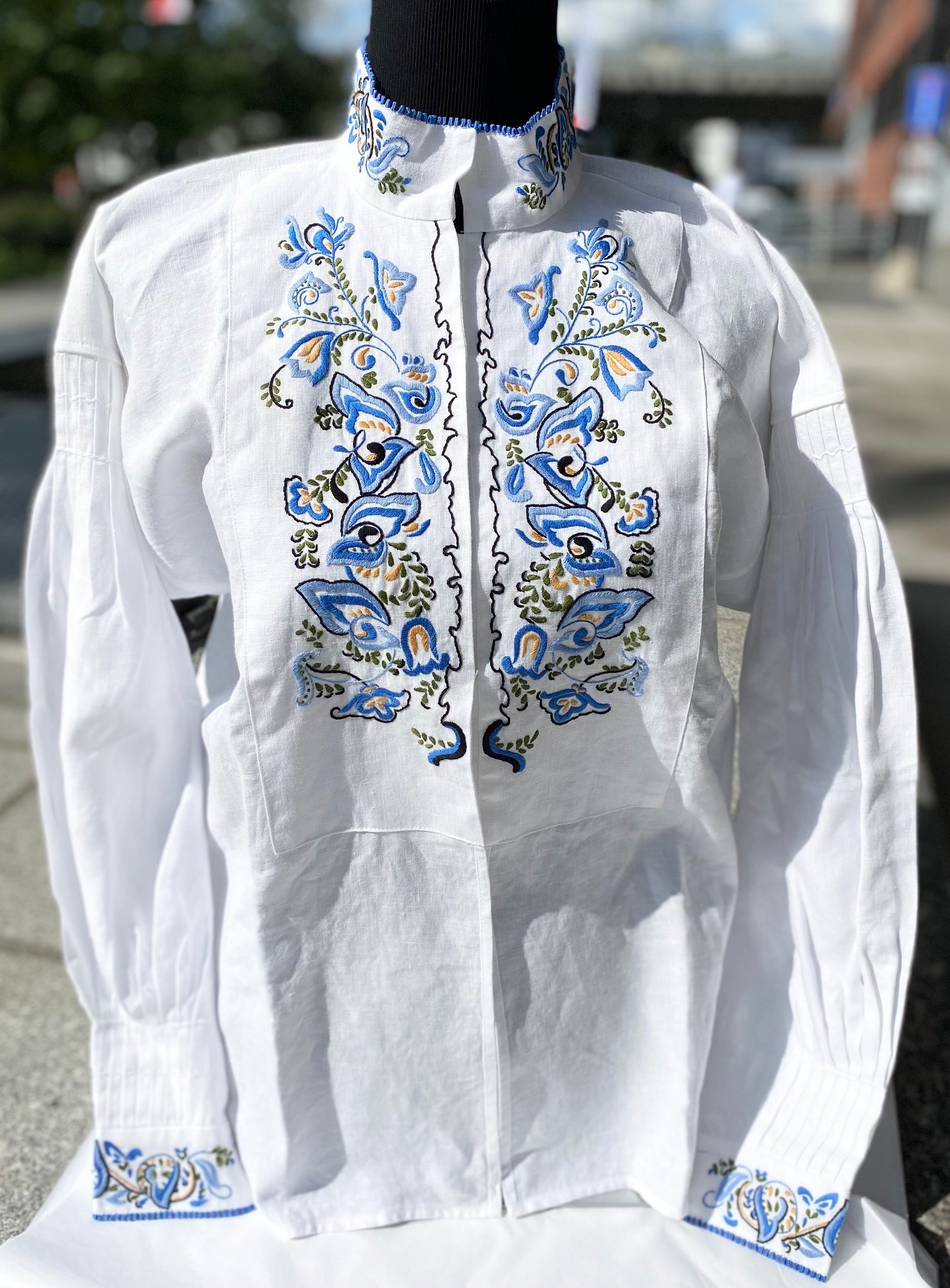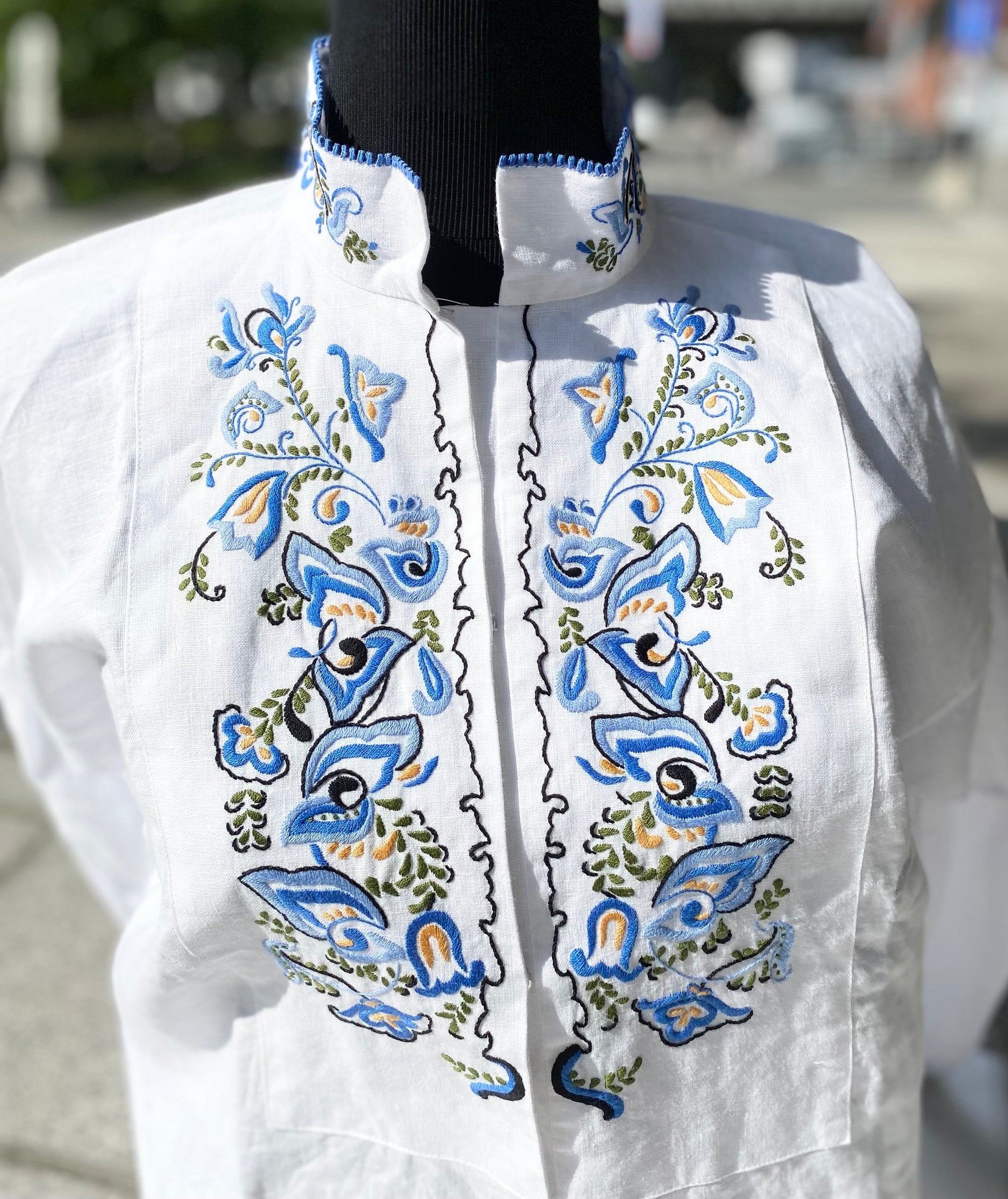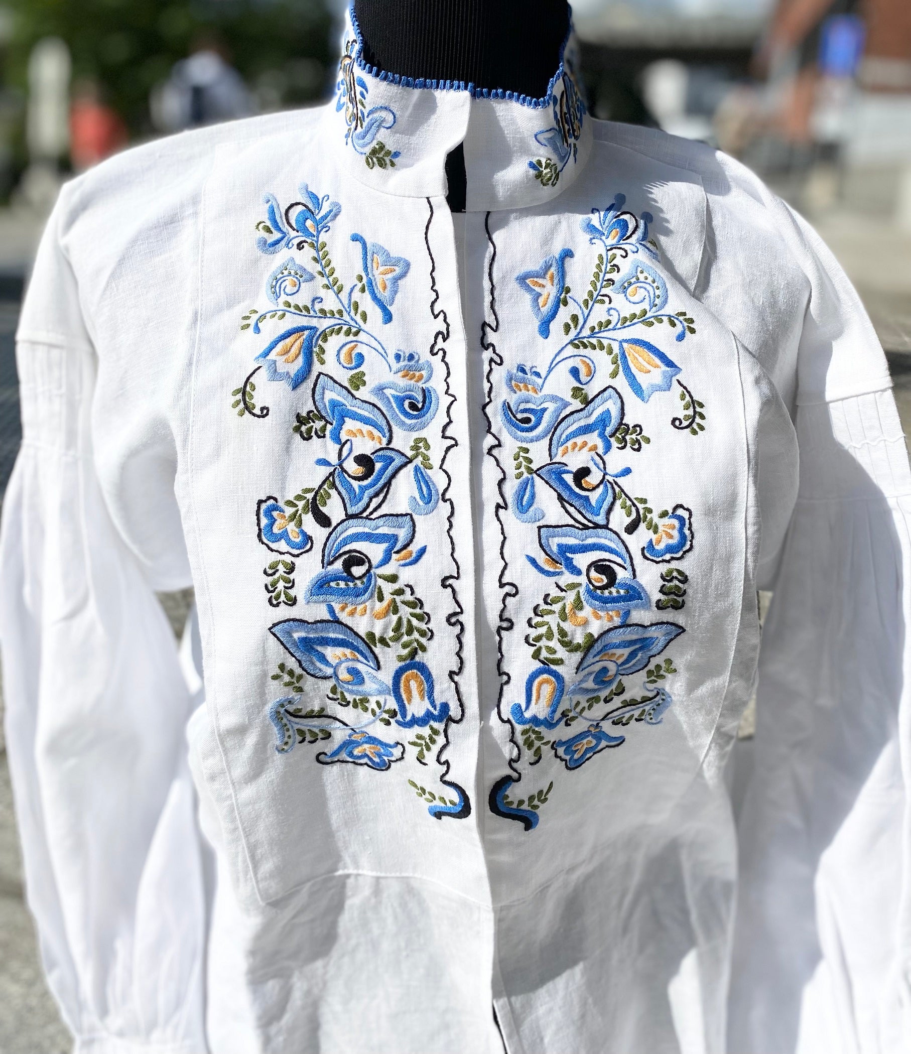 Broderiene er brodert for hånd. Oppgi din høyde, brystmål, halsmål, armlengde og omkrets håndledd.
