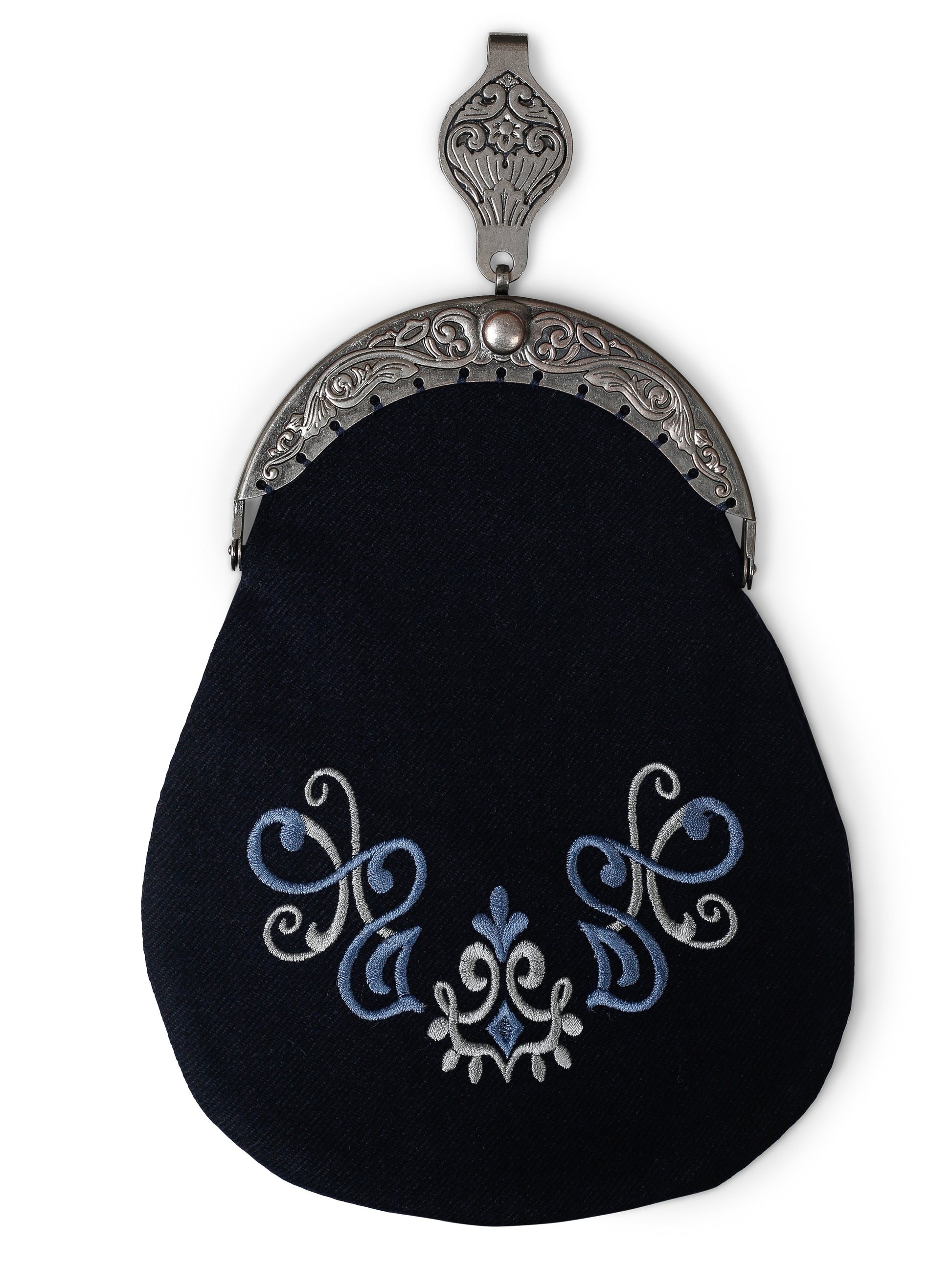 Justerebar skinnbelte med metallspenne i bunadsmønster. Matchende bunadsveske inkludert i prisen.