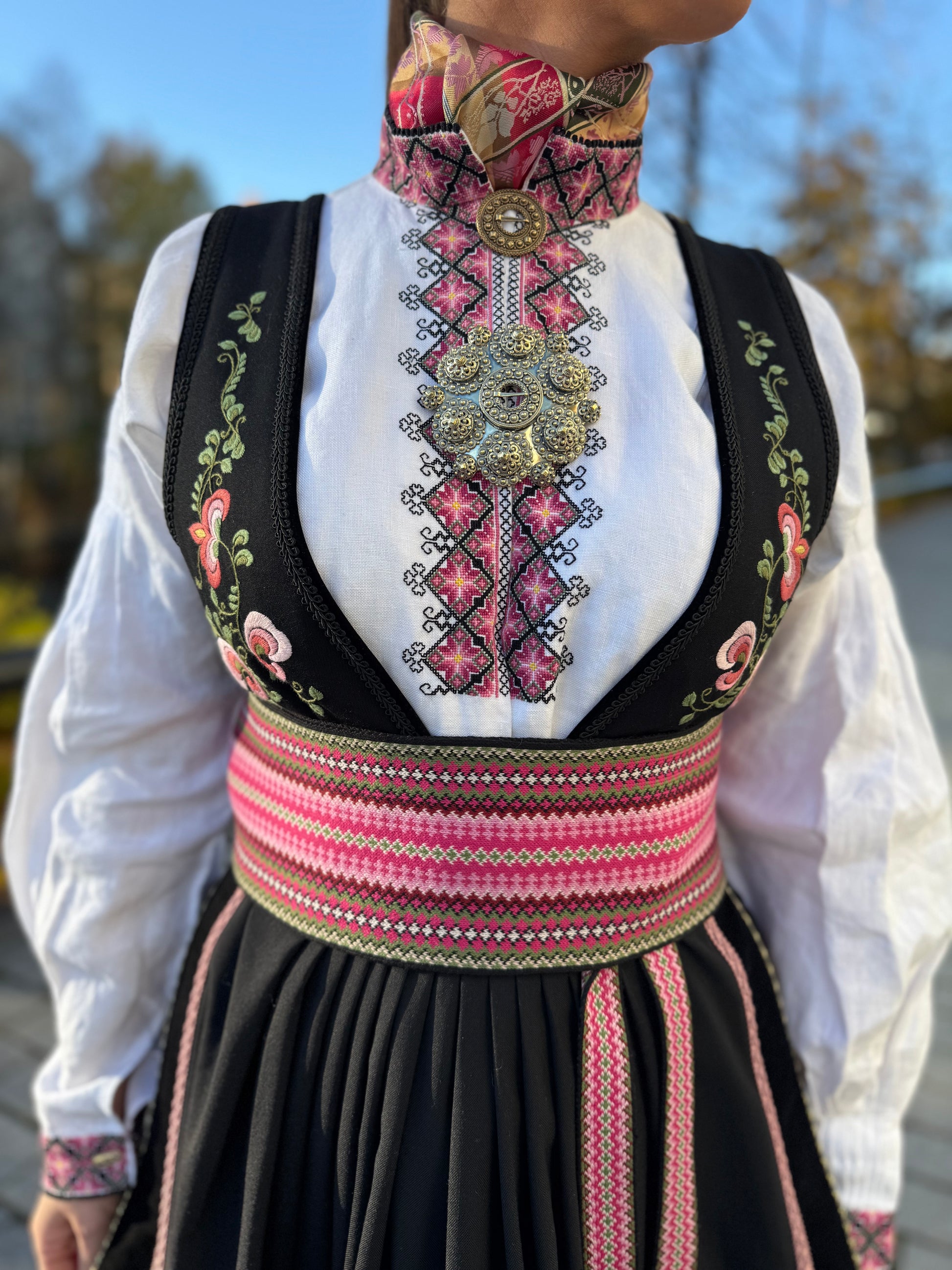 Broderiene på vesten og forklet er håndbrodert.