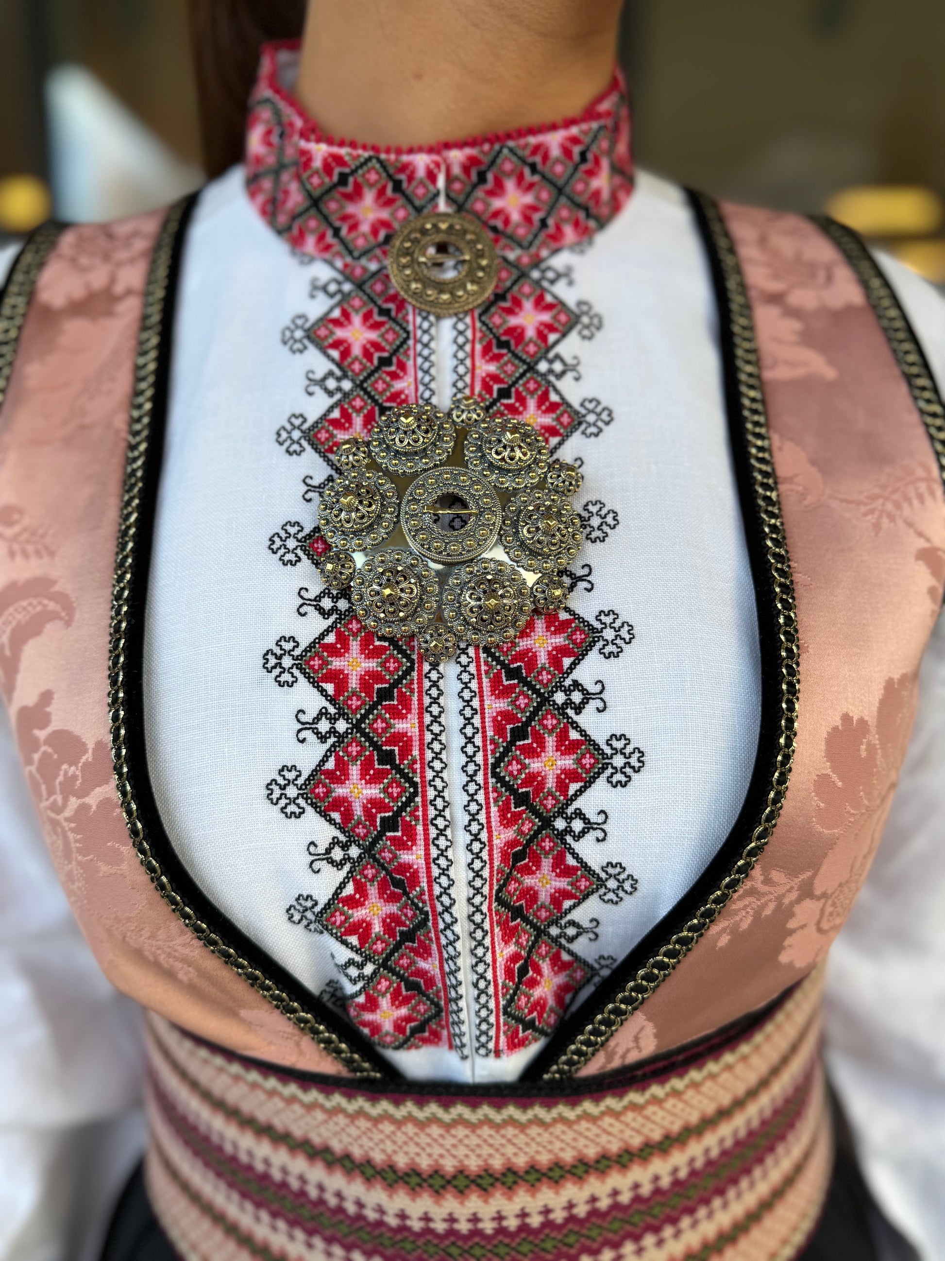 Bunadskjorten er i lin med korssting broderier i vakre fargekombinasjoner.