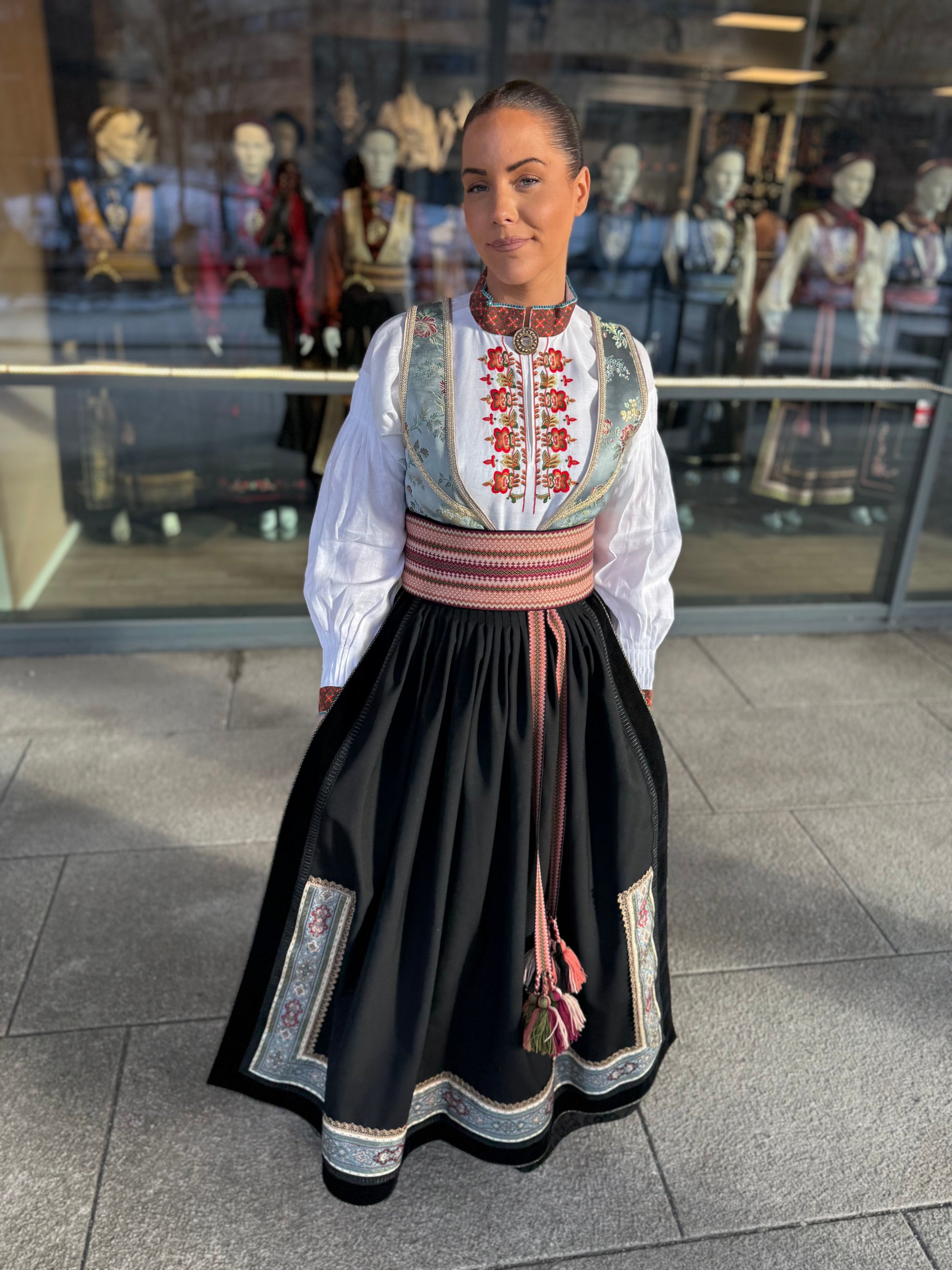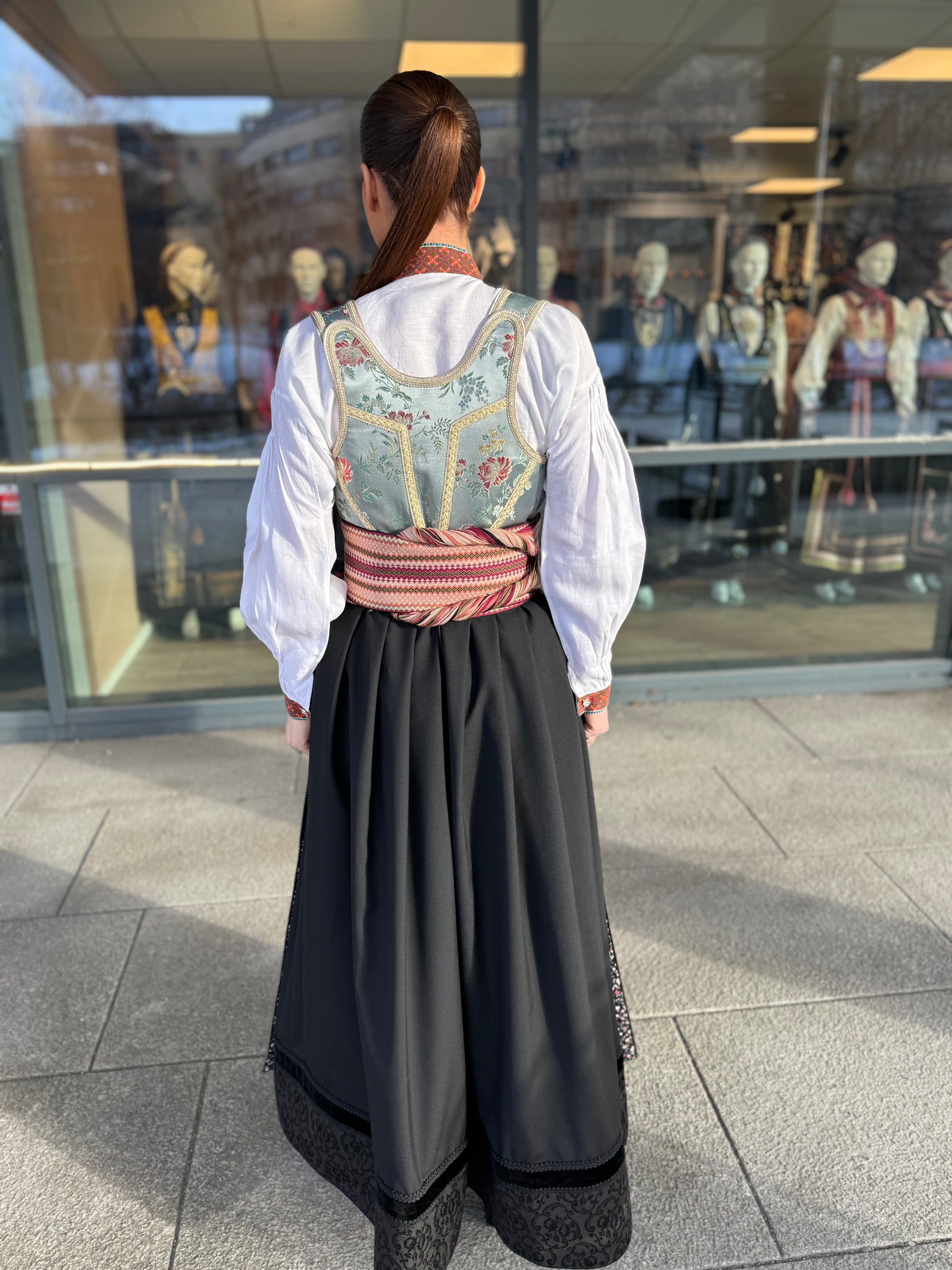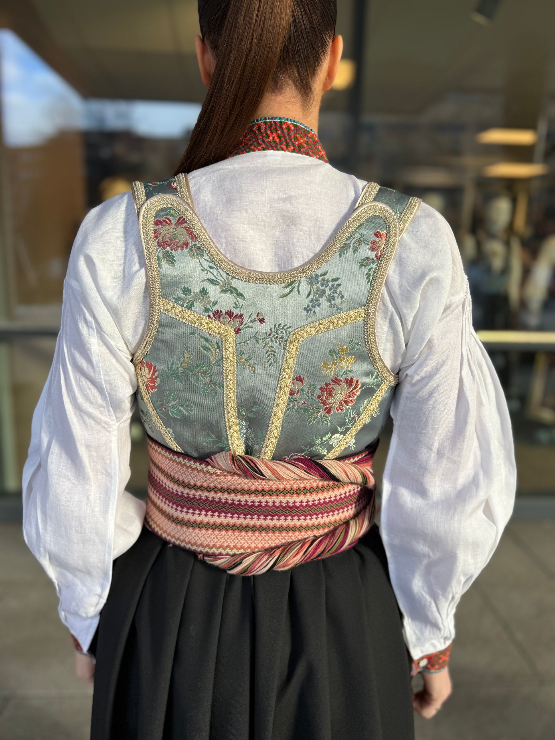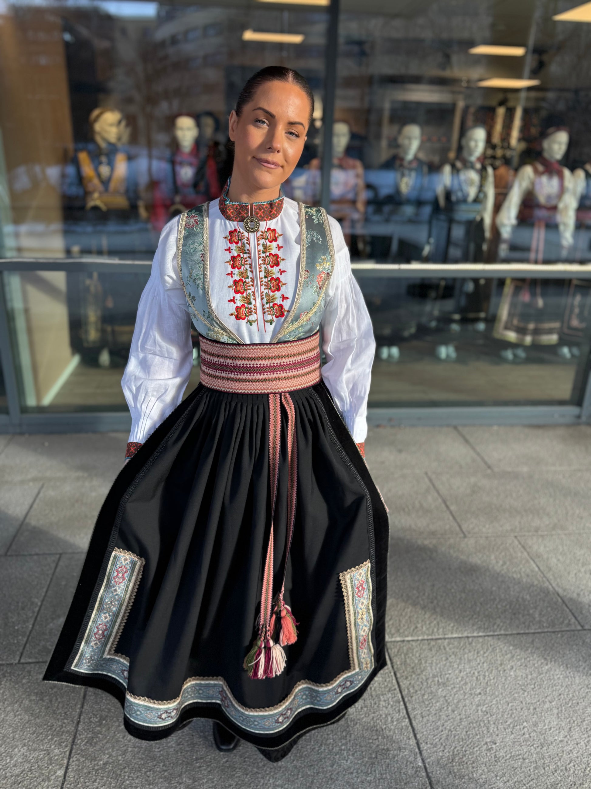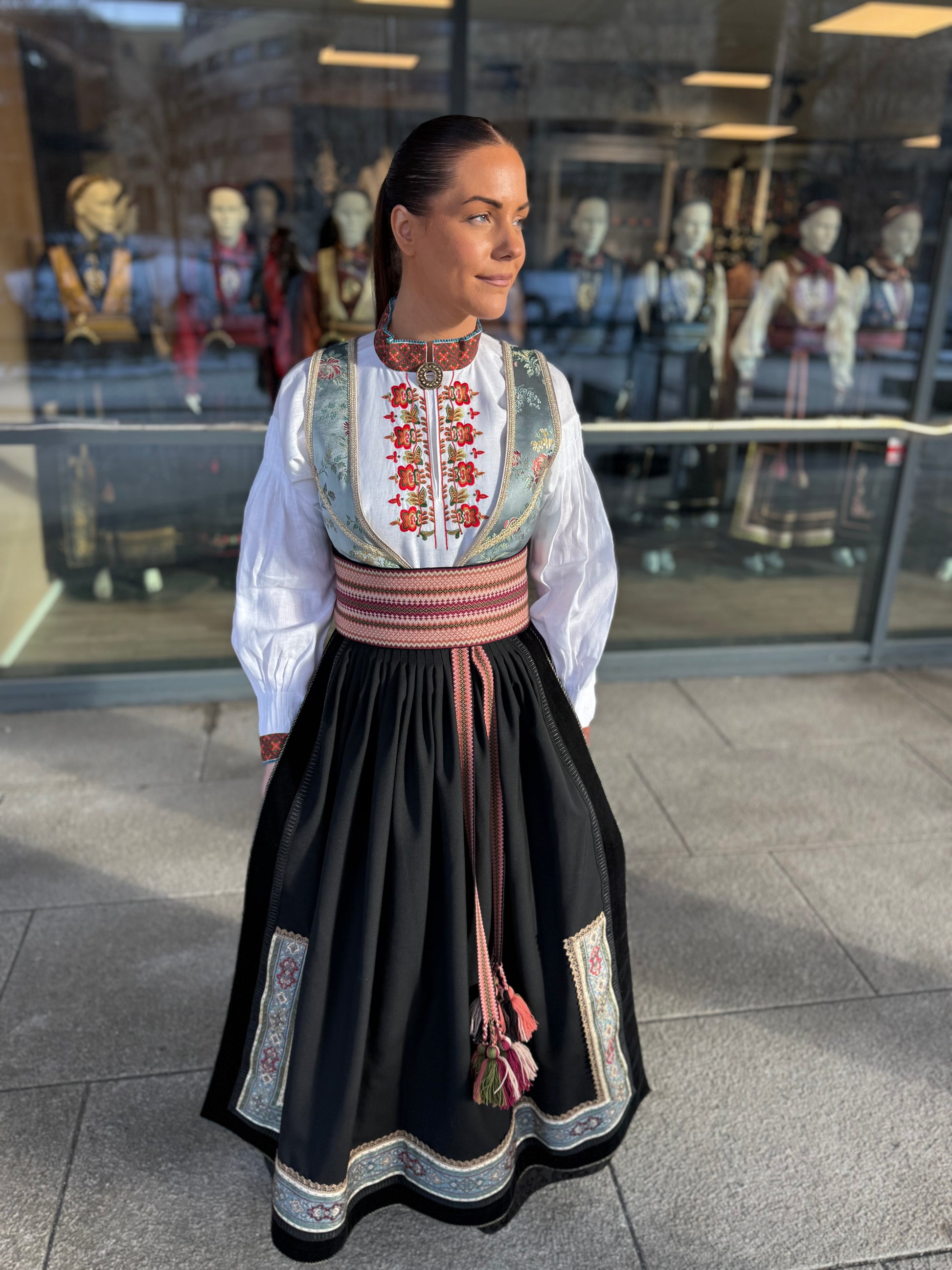 Bunadskjorten er i lin med korssting broderier i vakre fargekombinasjoner.