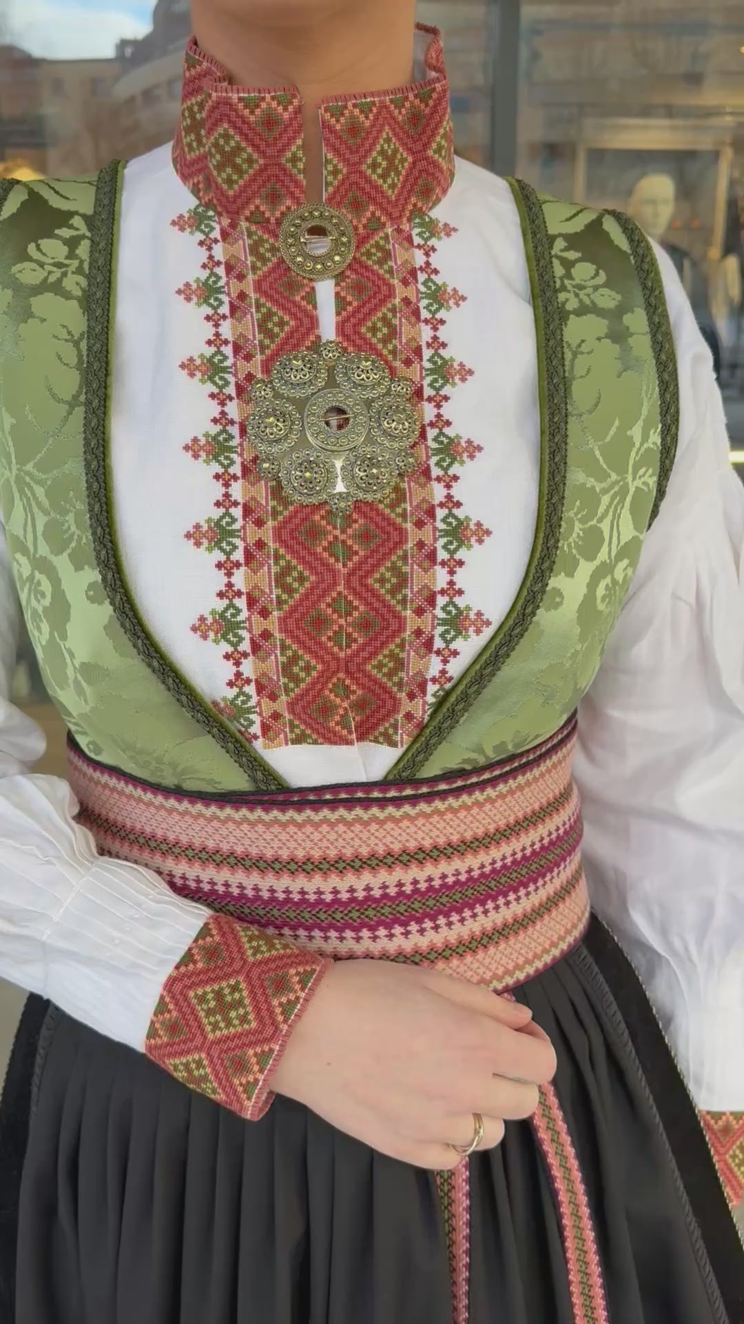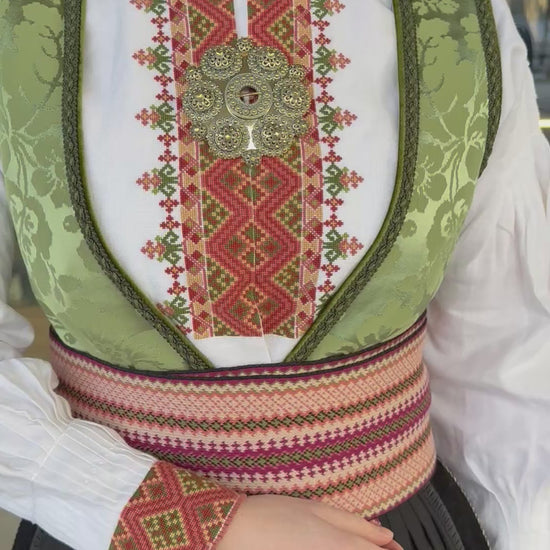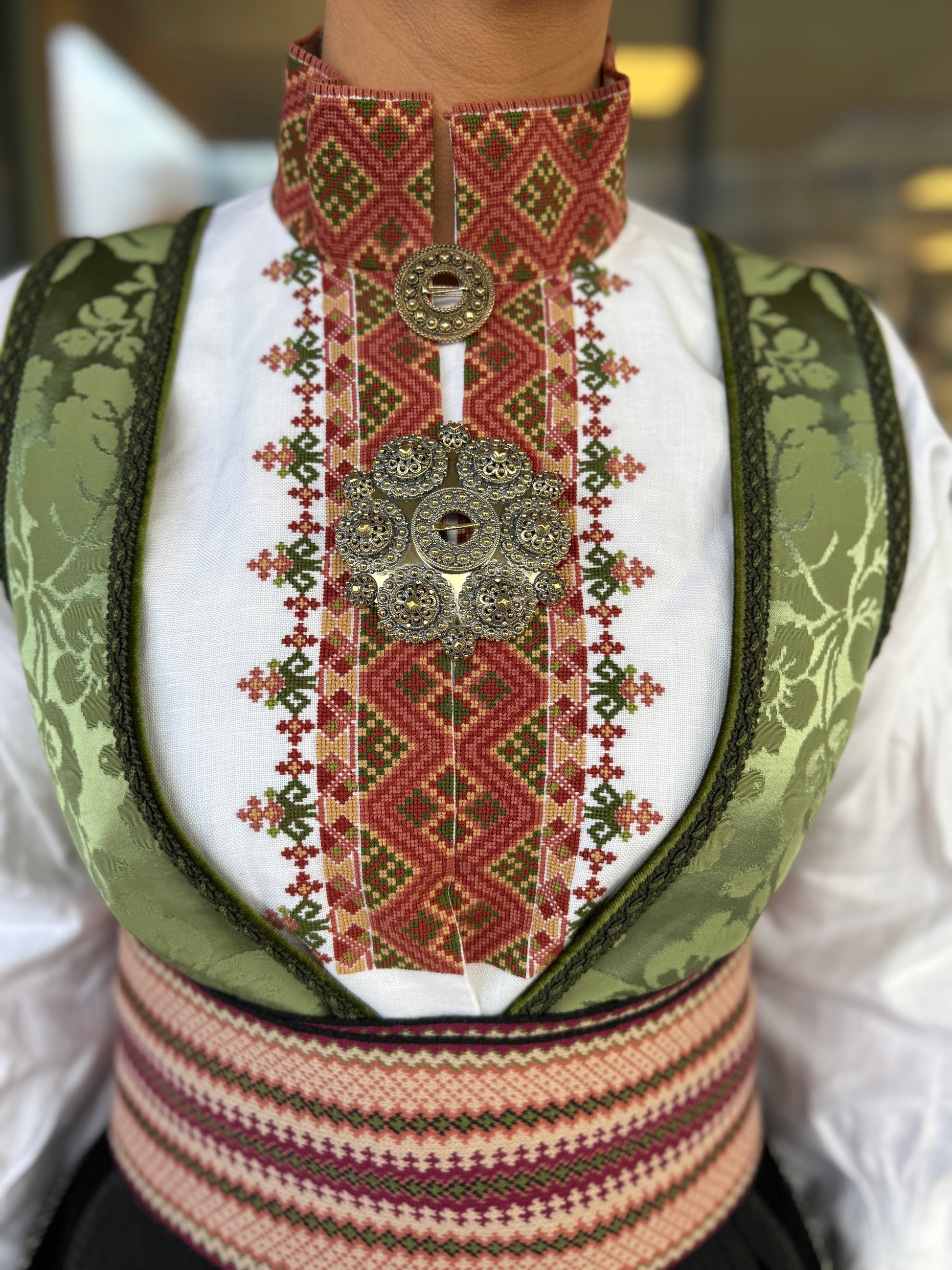 Bunadskjorten er i lin med korssting broderier i vakre fargekombinasjoner.
