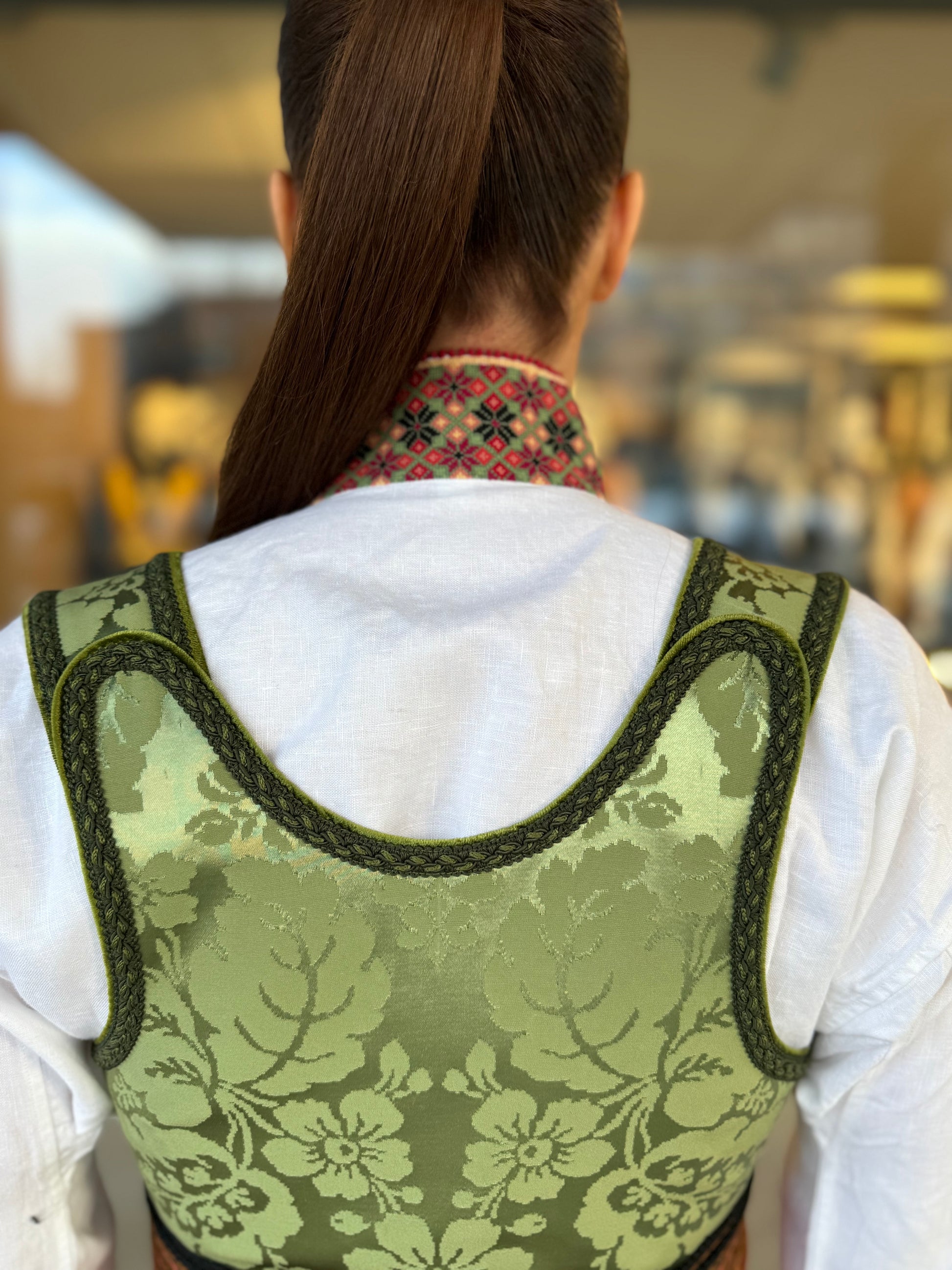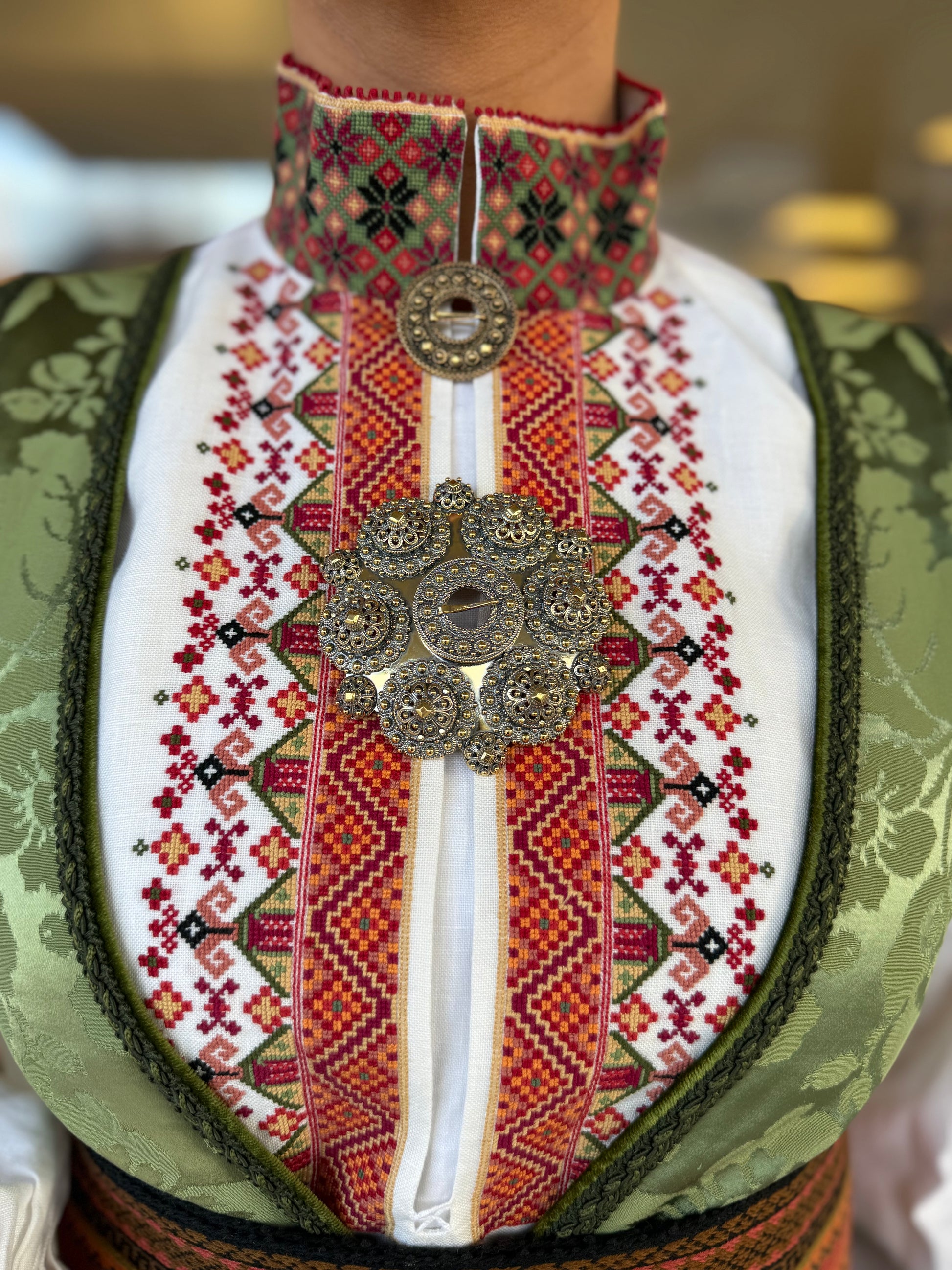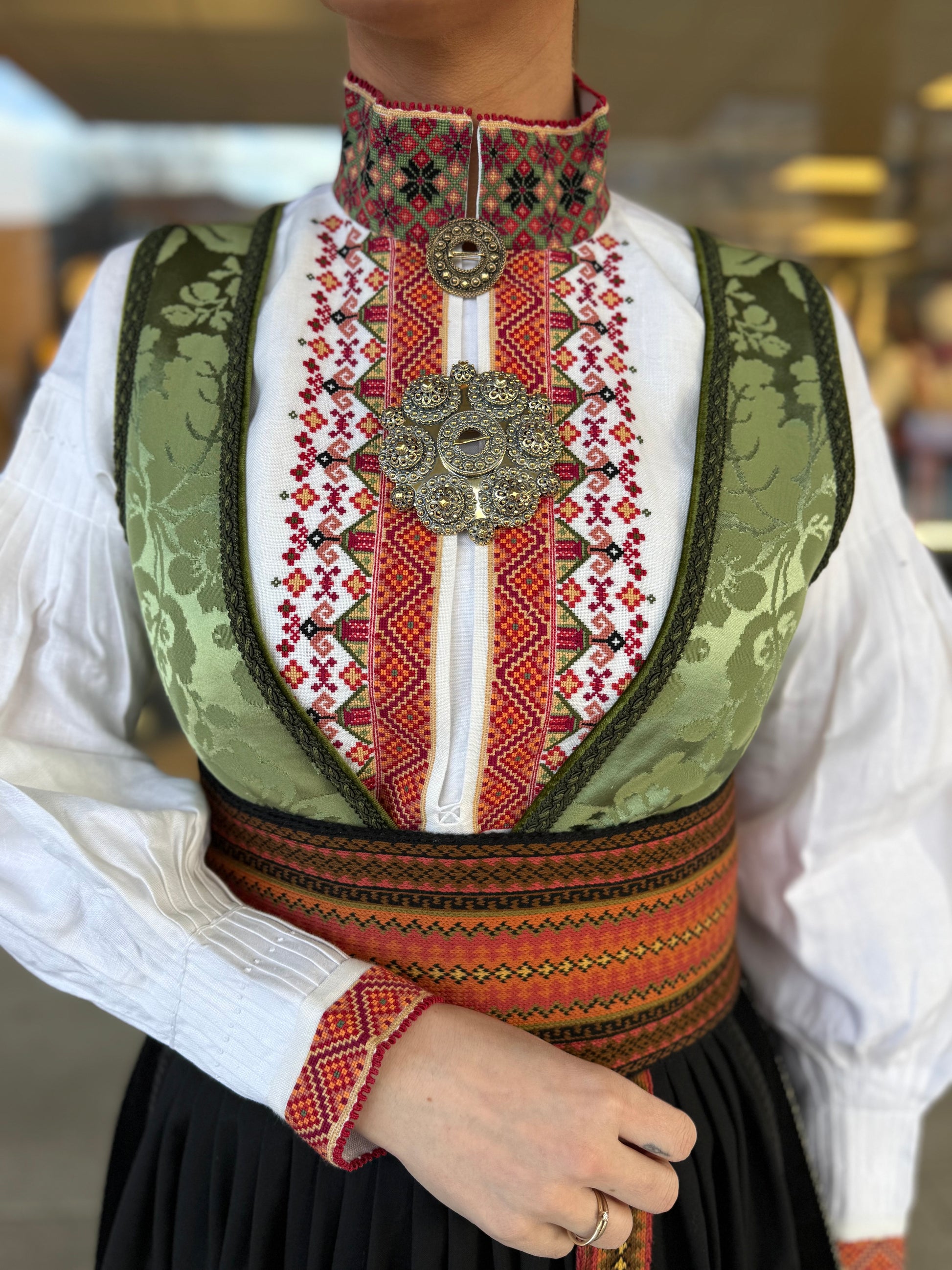 Bunadskjorten er i lin med broderier i vakre fargekombinasjoner.