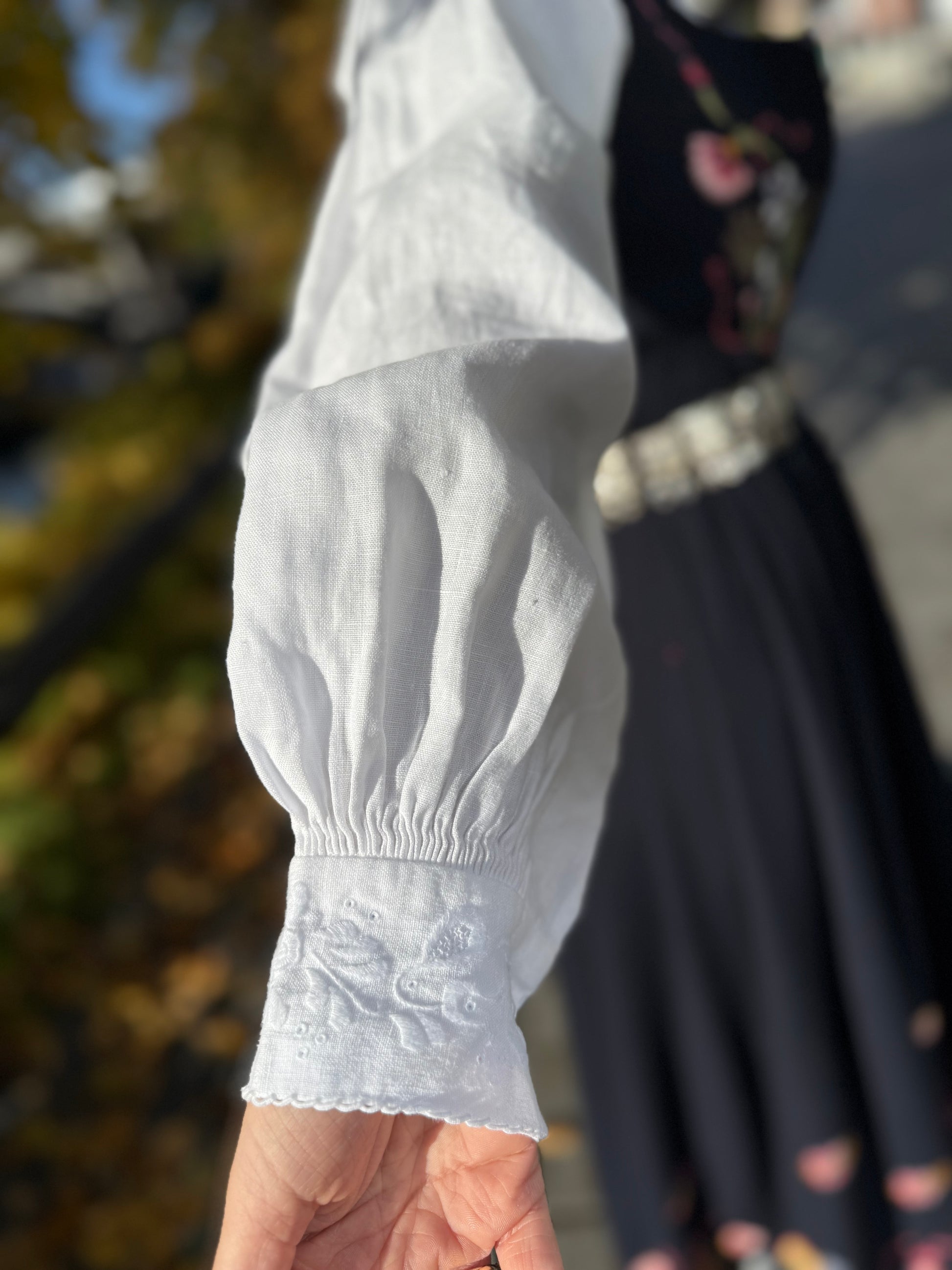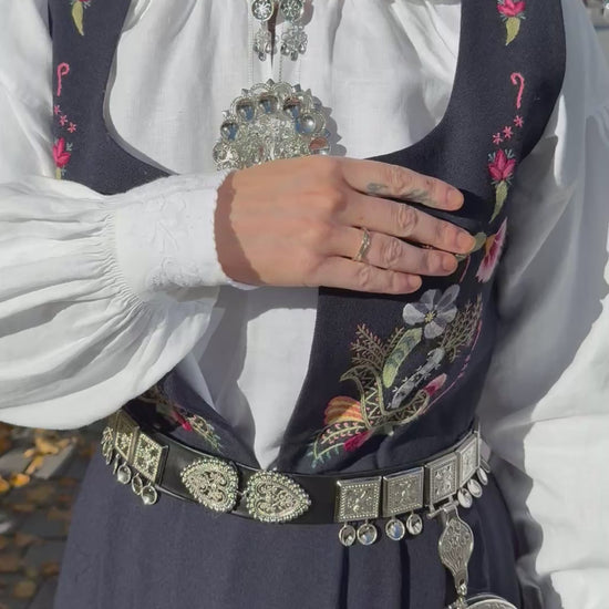 Bunadskjorten er i lin med broderier i hvitsøm. Fine broderier på kragen og ermene.