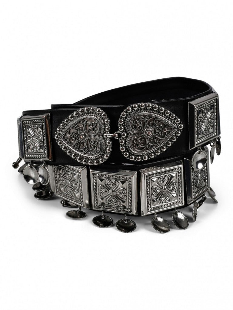Justerebar skinnbelte med metallspenne i bunadsmønster. Søljer rundt beltet er inkludert i prisen. (ikke ekte sølv) Beltestøl rundt hele og en veskestøl til å henge vesken på.