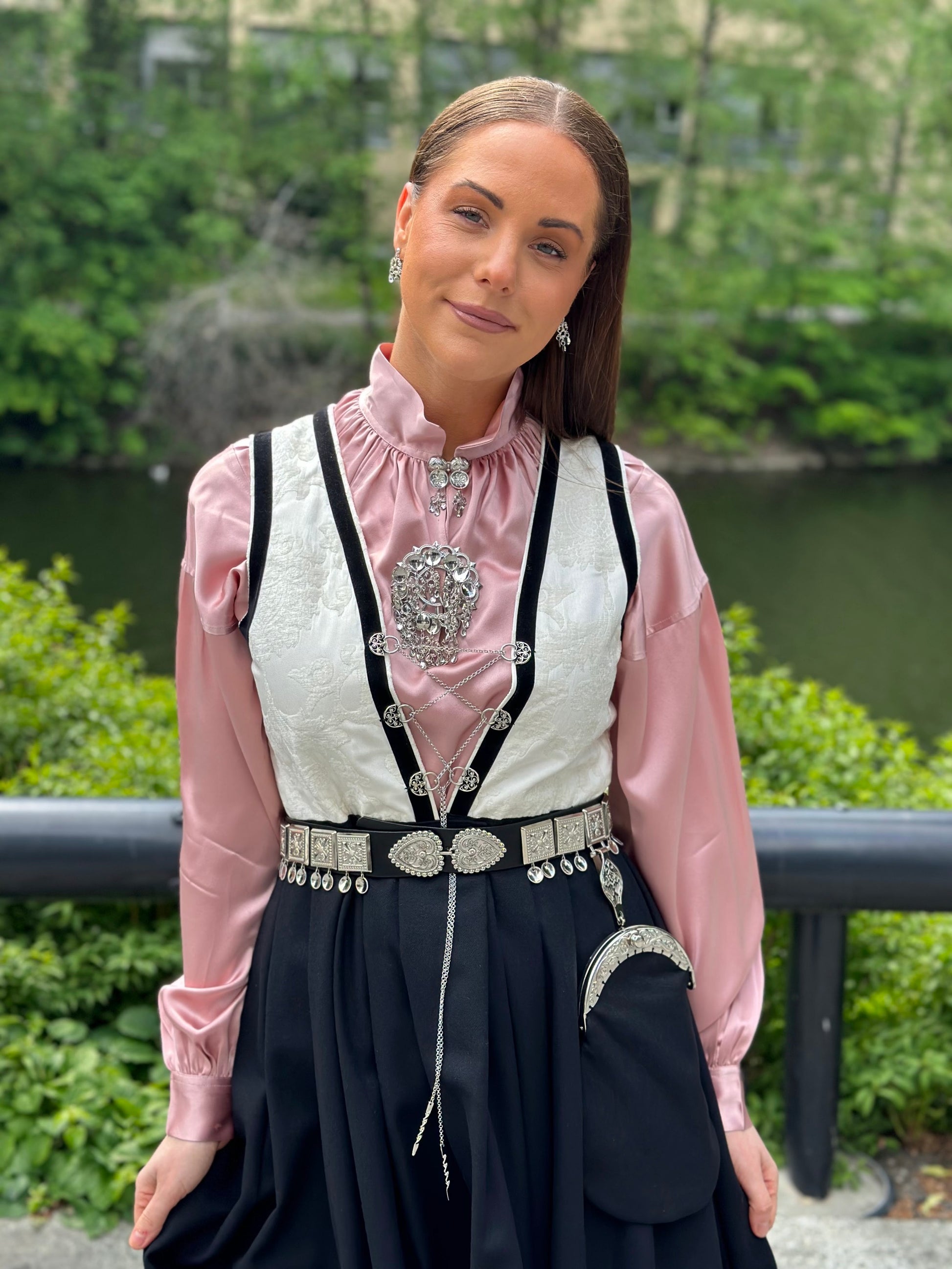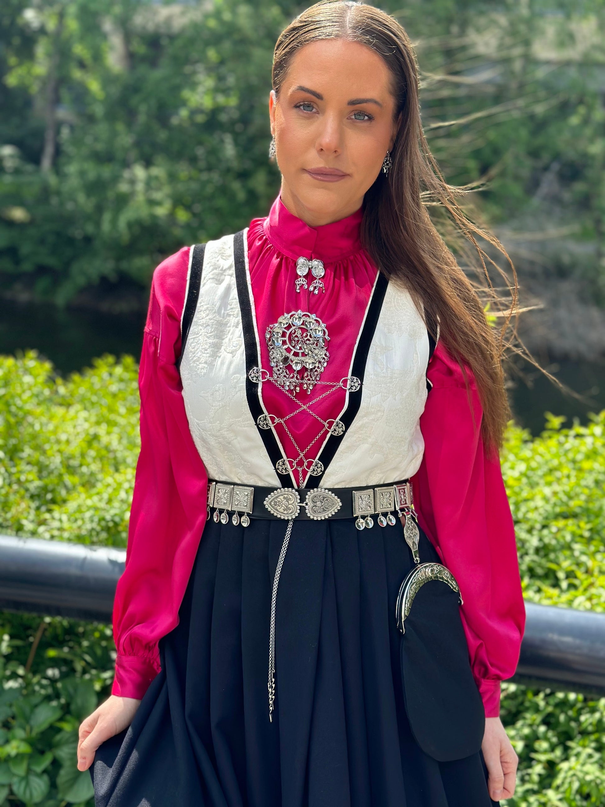 Offwhite festdrakt med silkekjorte. Man kan velge valgfri farge på silkeskjorten. Påsydde maljer med spyd og svart bunadsveske er inkludert.