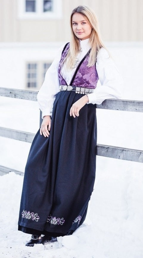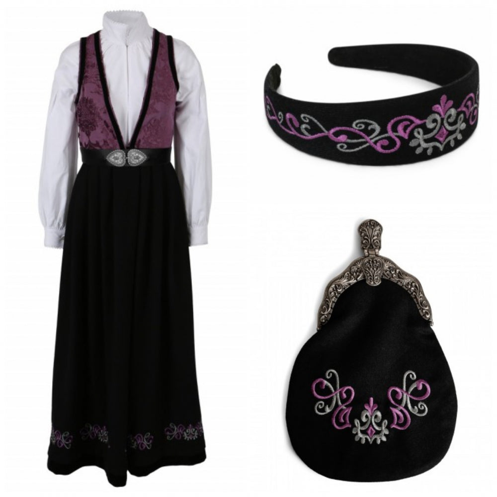 Nydelig lilla festdrakt / bunad med bunadsveske og bunadshårbøyle til damer fra norske Pascal.