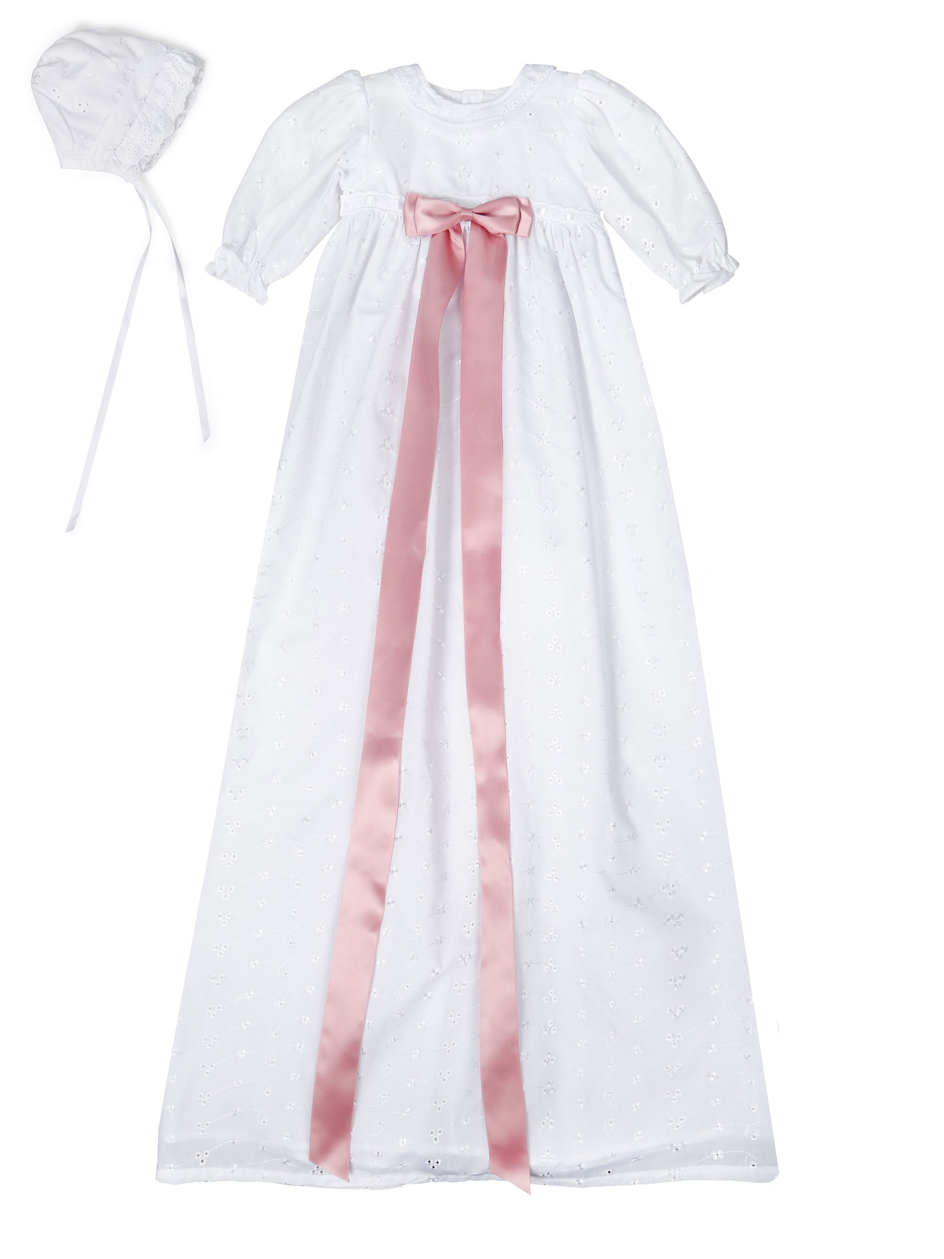 Dåpskjole i engelsk blonde jente med mellomrosa bånd