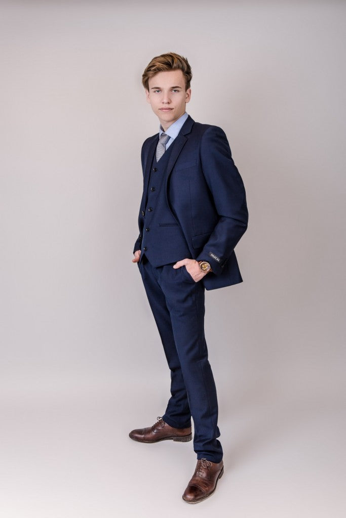 Pen blå dress som består av bukse, jakke og vest. Nydelig blåfarge. Fin, smal passform. Slimfit. Flott kvalitet.