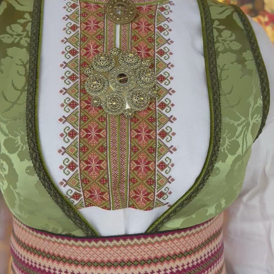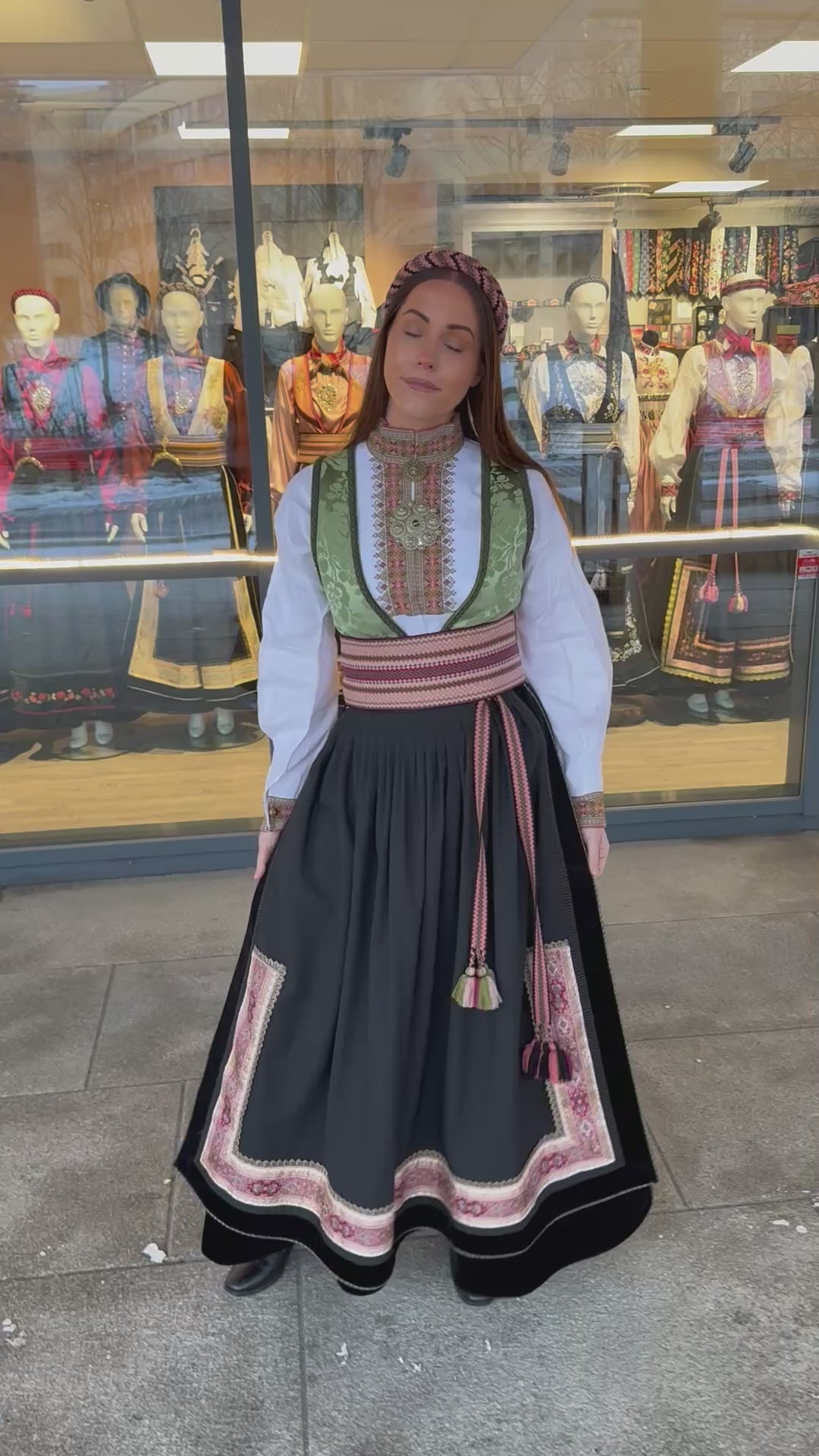 Denne pakken inneholder: Skjorte (hvit) , stakk, vest, belte, forkle og hårvippe. Skjorte i andre farger eller med broderier kan kjøpes i tillegg hvis man ønsker det. Farge på vesten, belte, forkle og hårvippen kan man kombinere selv.