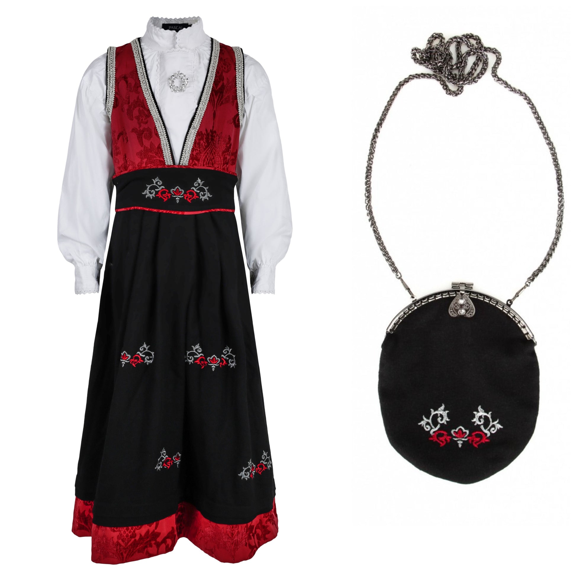 Nydelig rød festdrakt / bunad fra norske Pascal med matchende bunadsveske.
