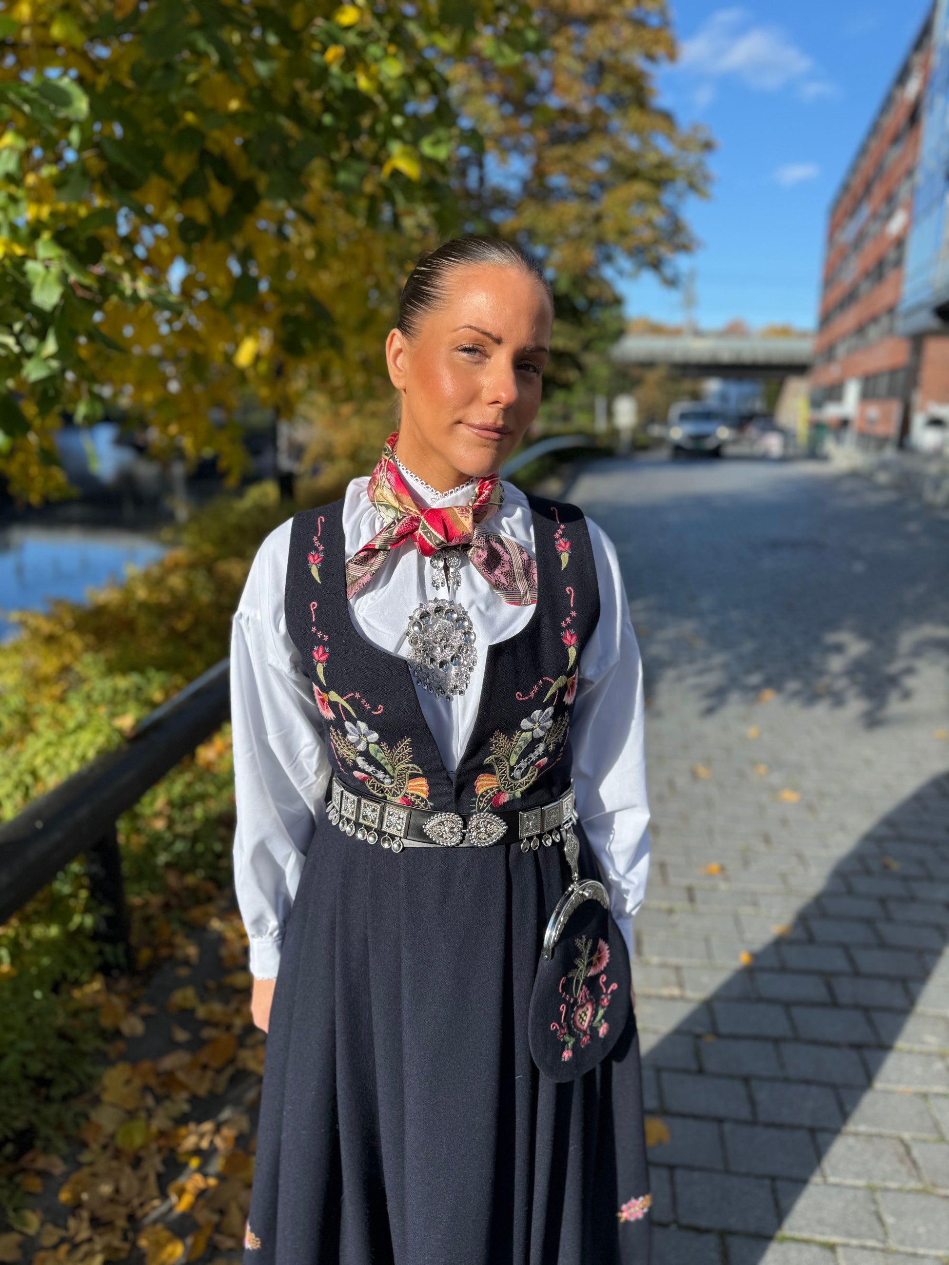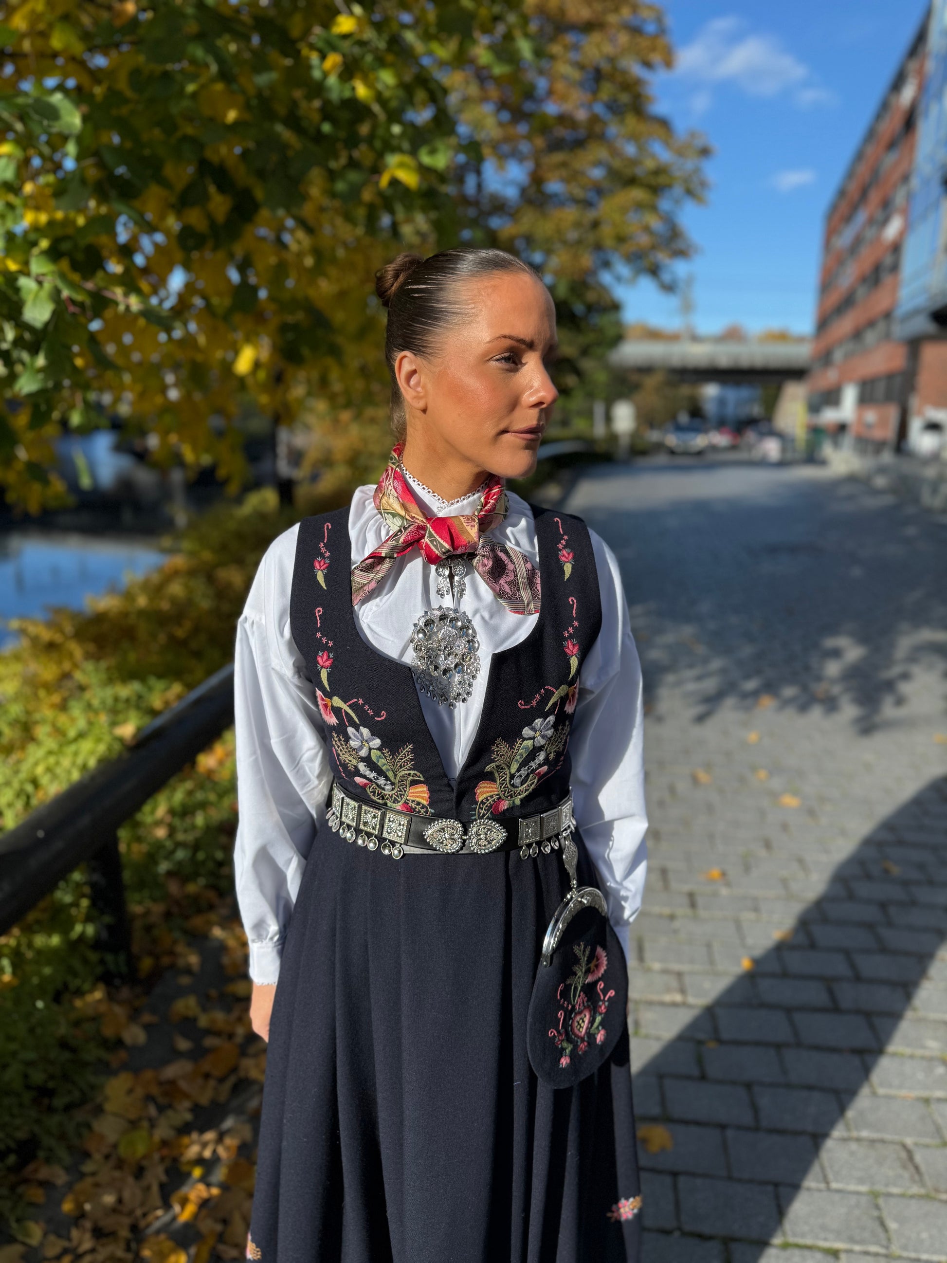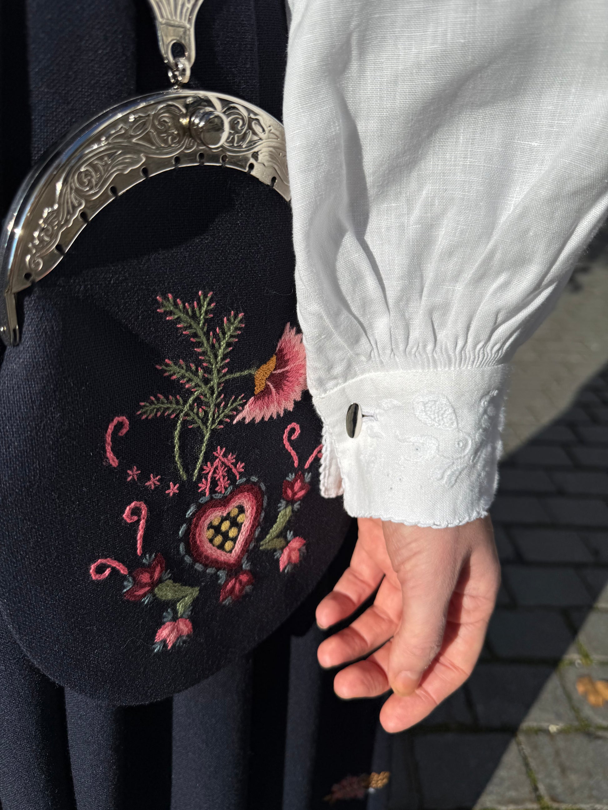 - Bunadsveske med broderier (uten veskelås). Vesken er lik stakken i kvalitet, farge og broderier.
