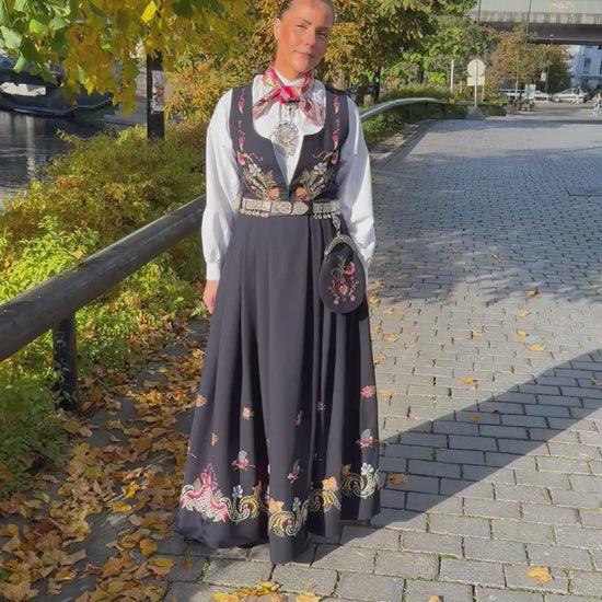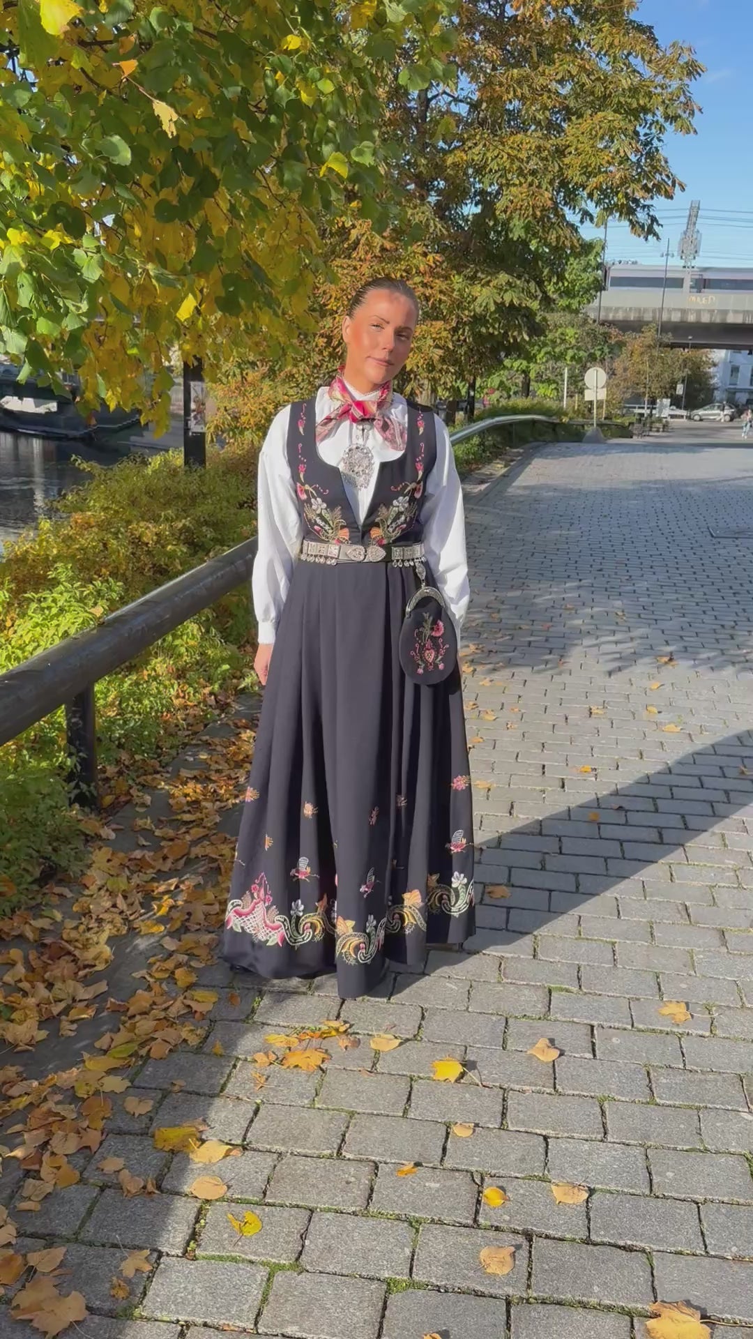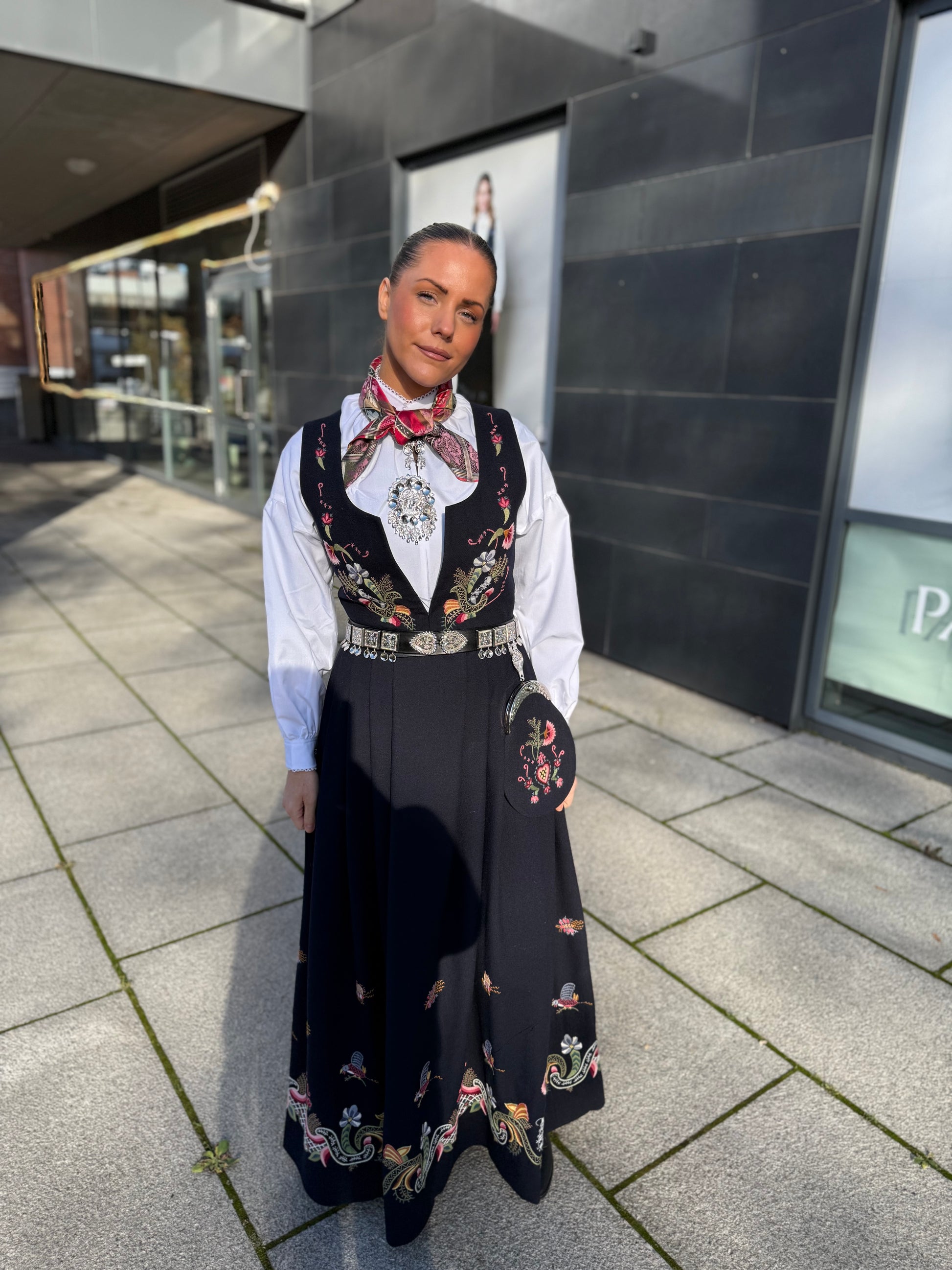 - Bunadsveske med broderier (uten veskelås). Vesken er lik stakken i kvalitet, farge og broderier.