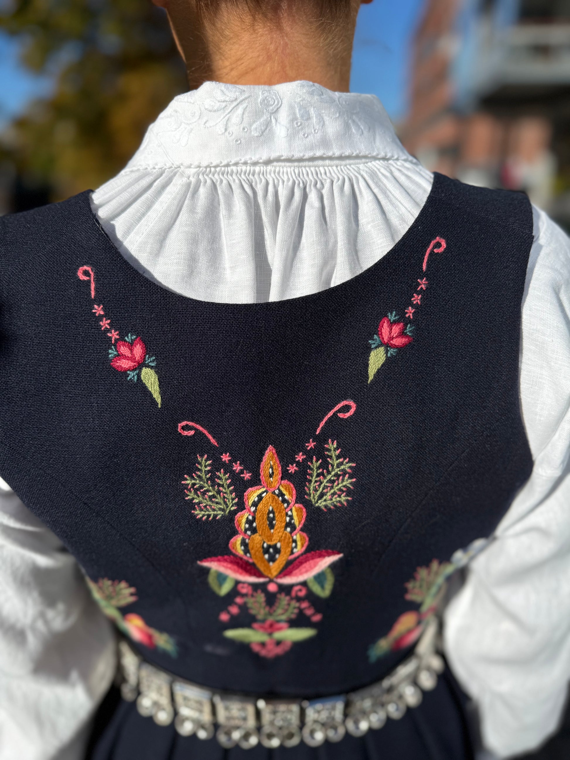 - Livet er i samme kvalitet og farge, og har en rund utrigning. Fremstykket og ryggen er håndbrodert med samme broderi som på stakken.