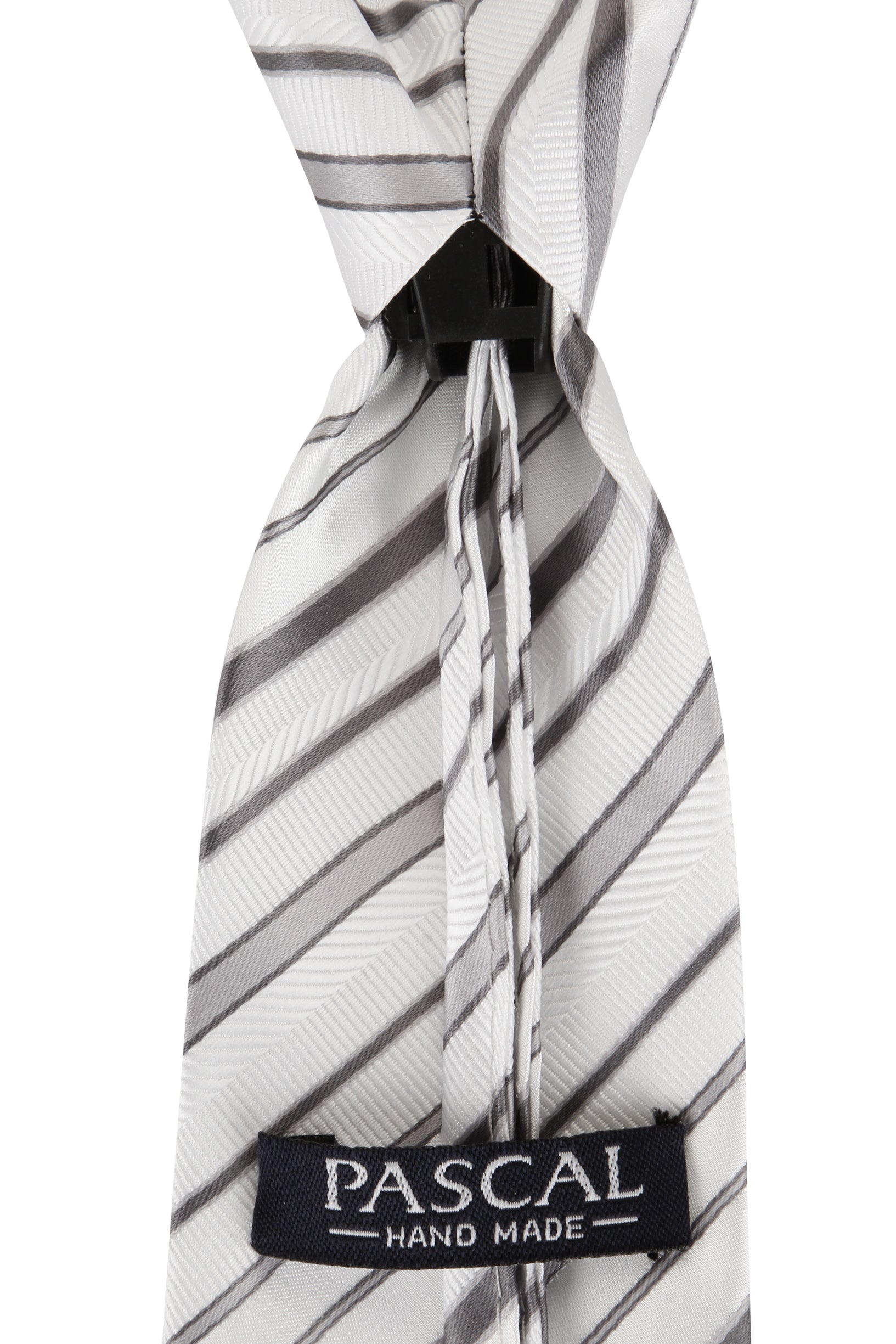 Pascal ferdigknyttet slips med en enkel justeringsmekanisme. Justeres ved å klemme på begge sider av knuten og dra i båndet.