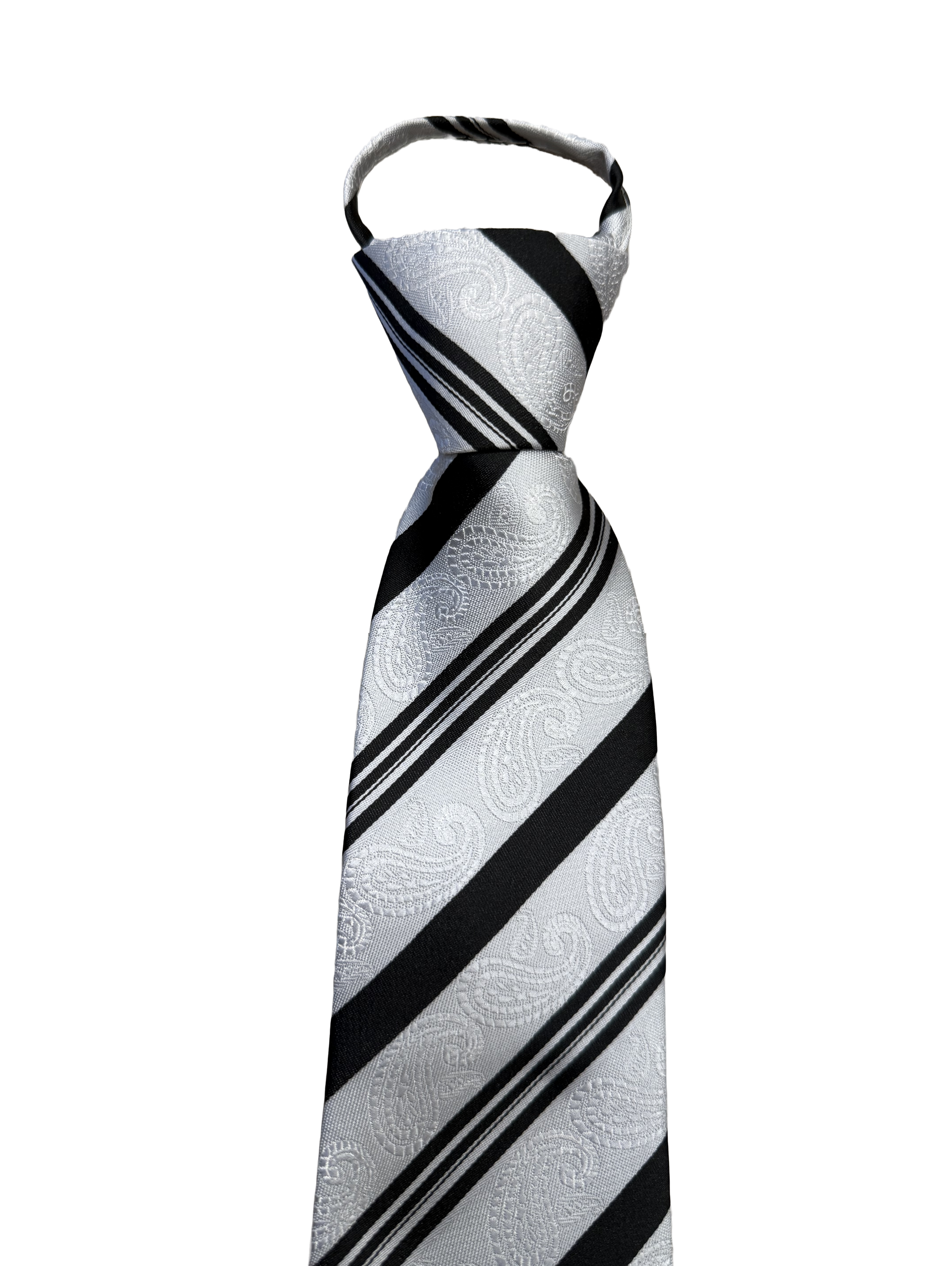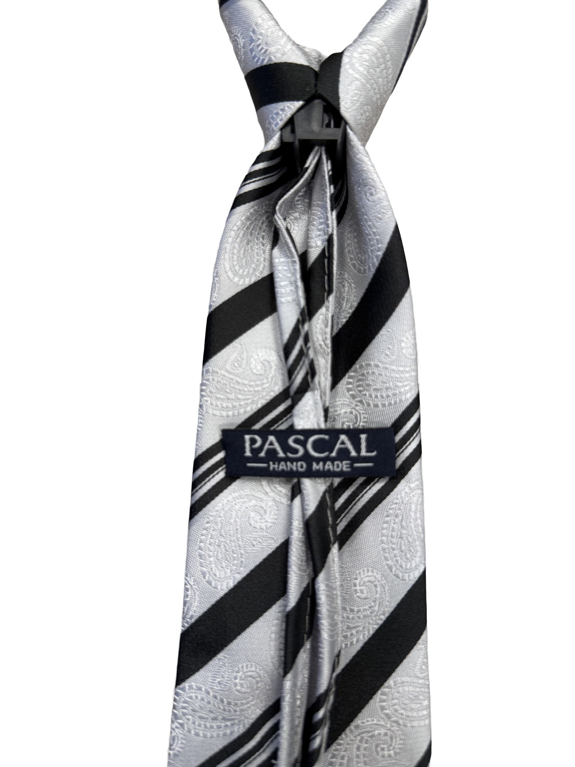 Pascal ferdigknyttet slips med en enkel justeringsmekanisme. Justeres ved å klemme på begge sider av knuten og dra i båndet.