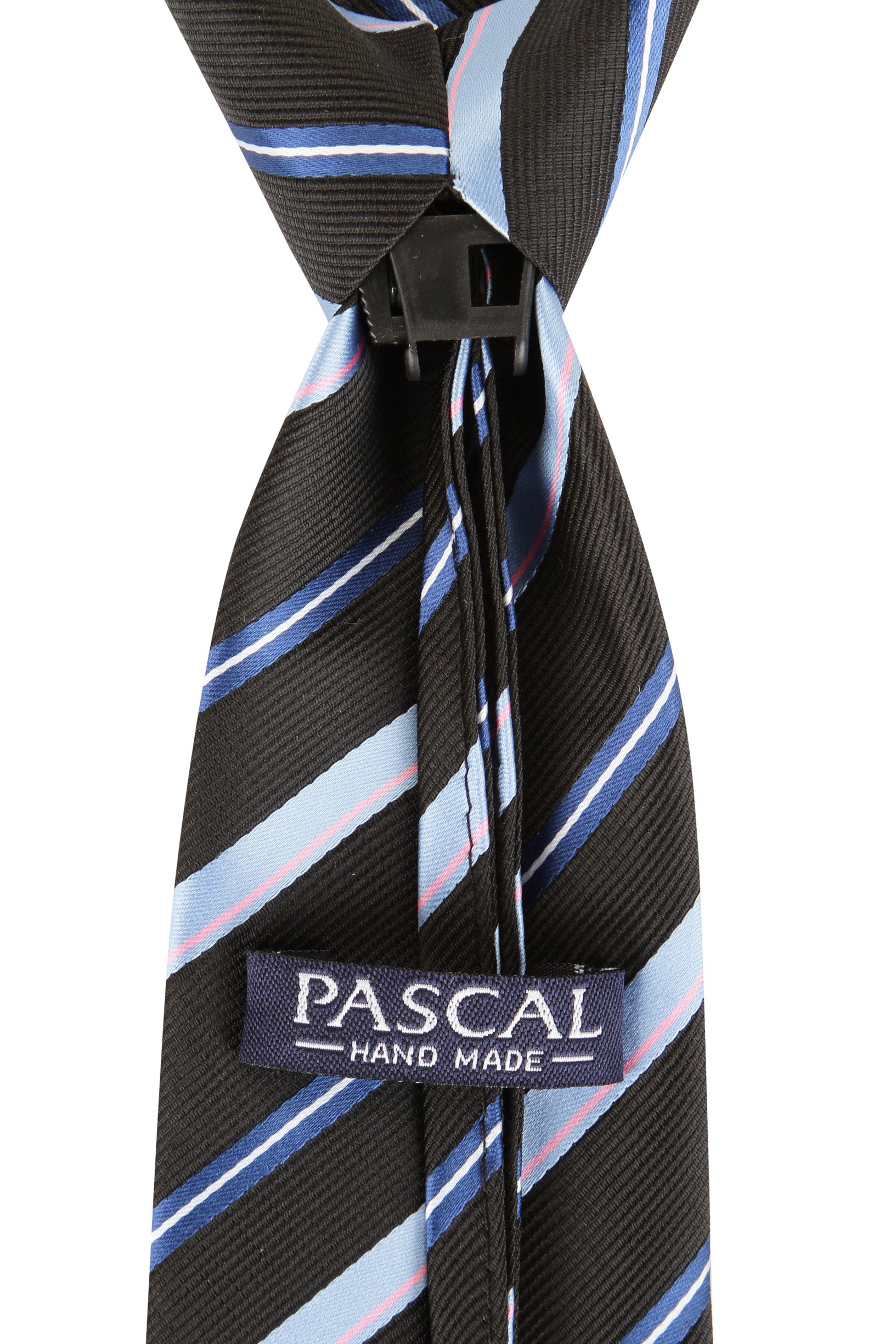 Pascal ferdigknyttet slips med en enkel justeringsmekanisme. Justeres ved å klemme på begge sider av knuten og dra i båndet.