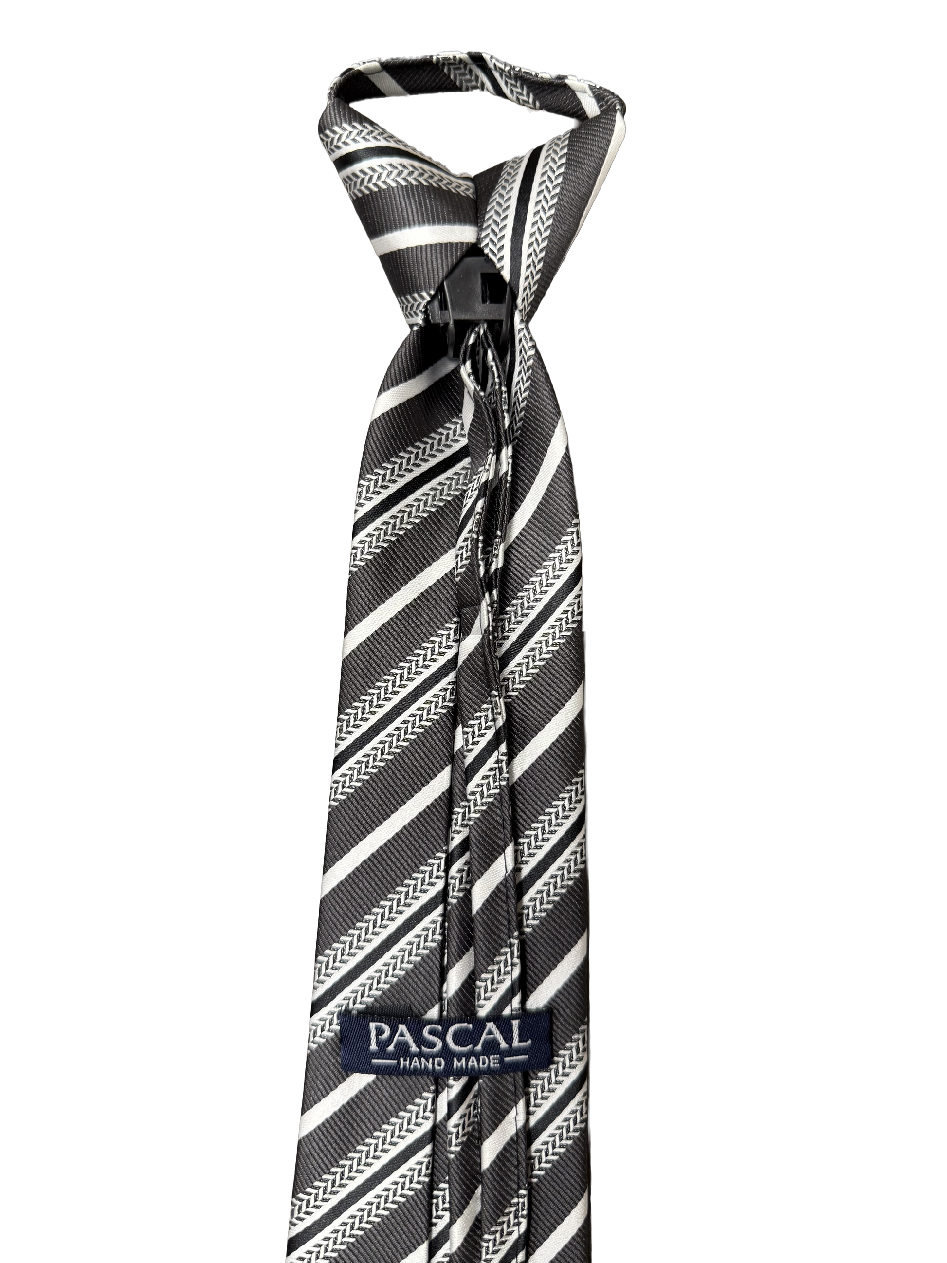 Pascal ferdigknyttet slips med en enkel justeringsmekanisme. Justeres ved å klemme på begge sider av knuten og dra i båndet.