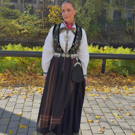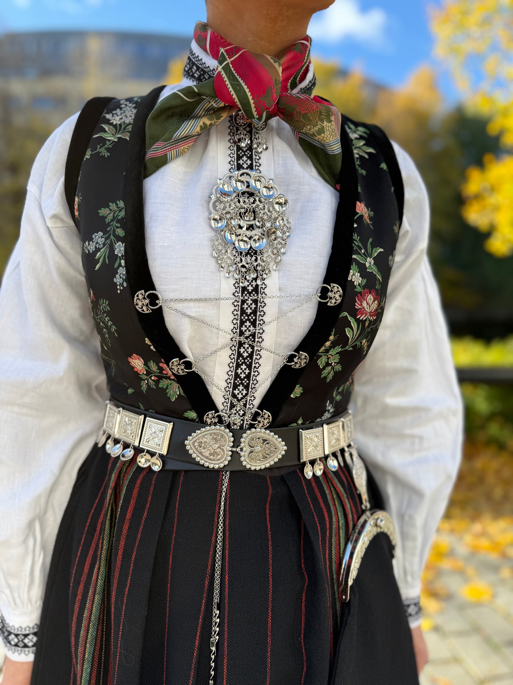 - Stakken er ull og fargen sort. Stakkekanten er brodert.