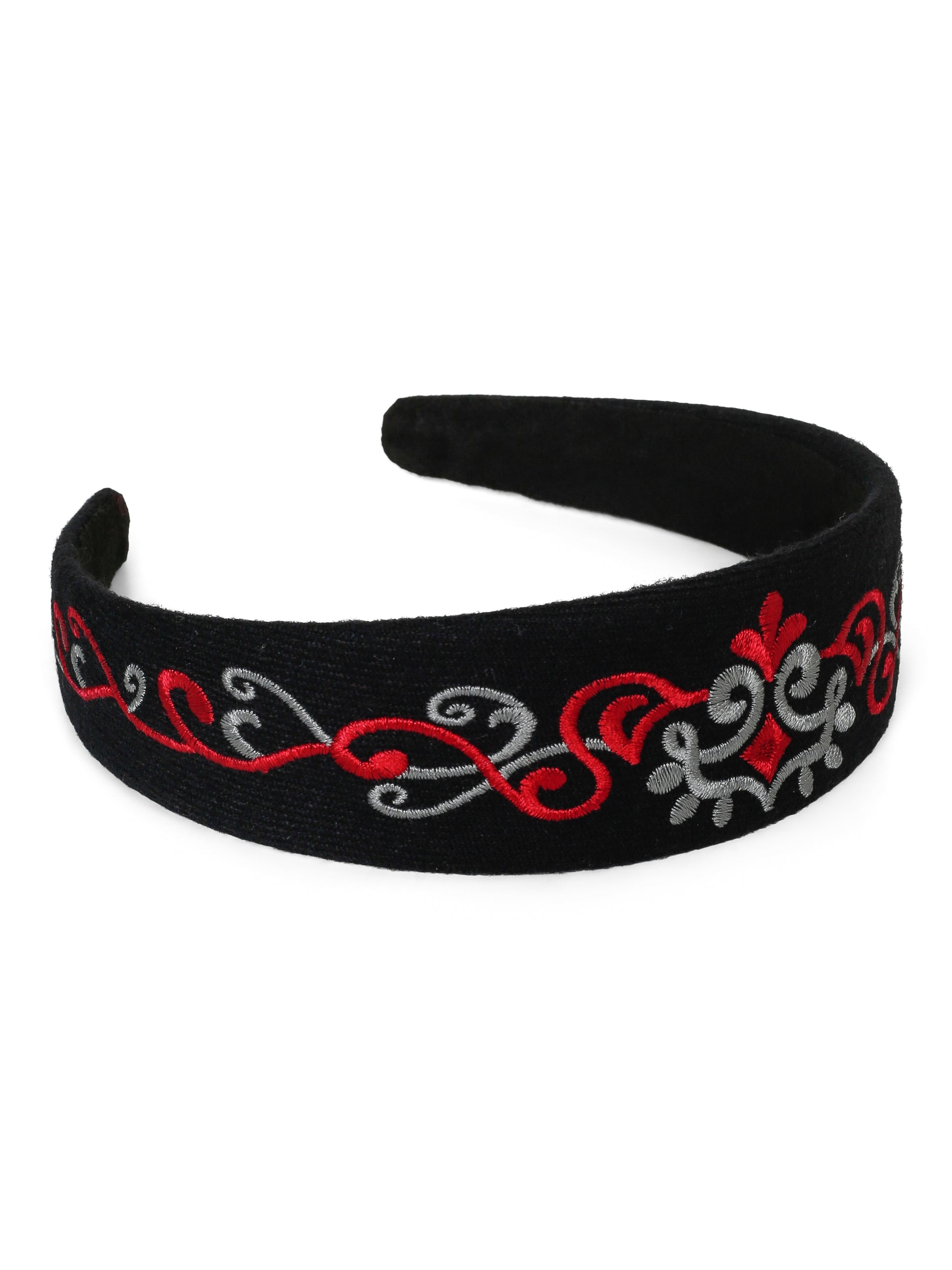 Nydelig bunadshårbøyle med rød og sølv broderier i bunadsmønster.