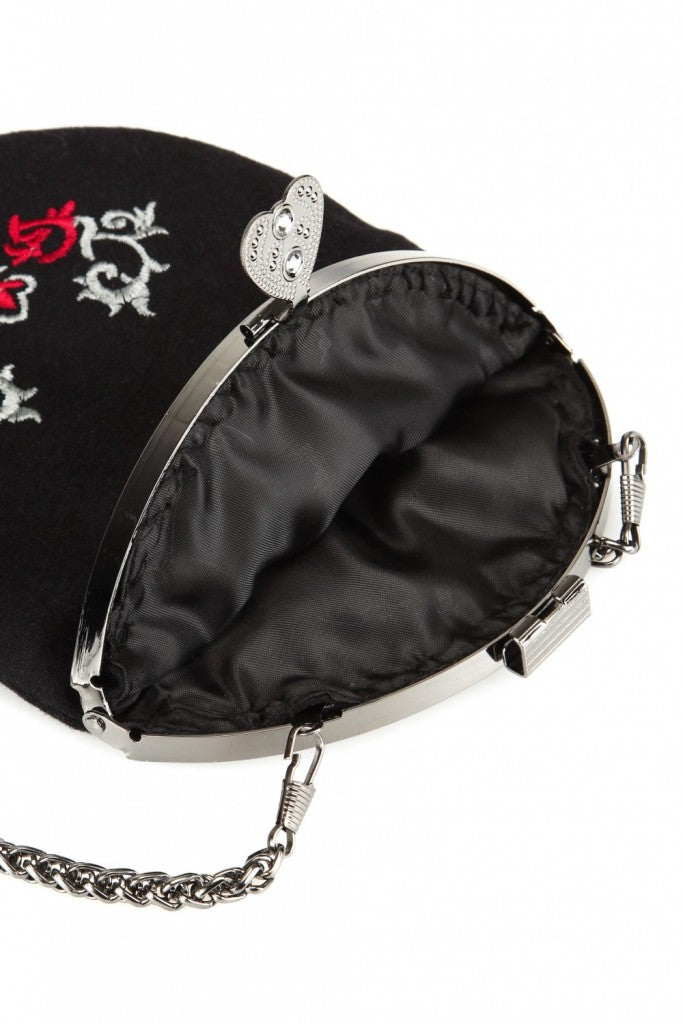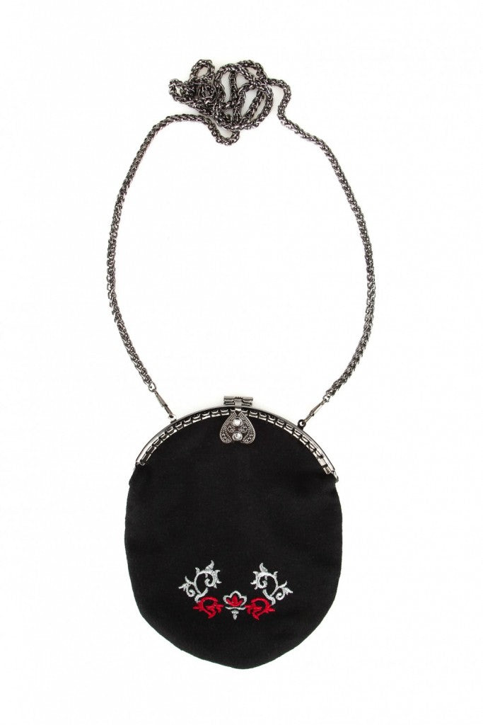 Nydelig bunadsveske i svart farge med rød og sølv broderier i bunadsmønster.