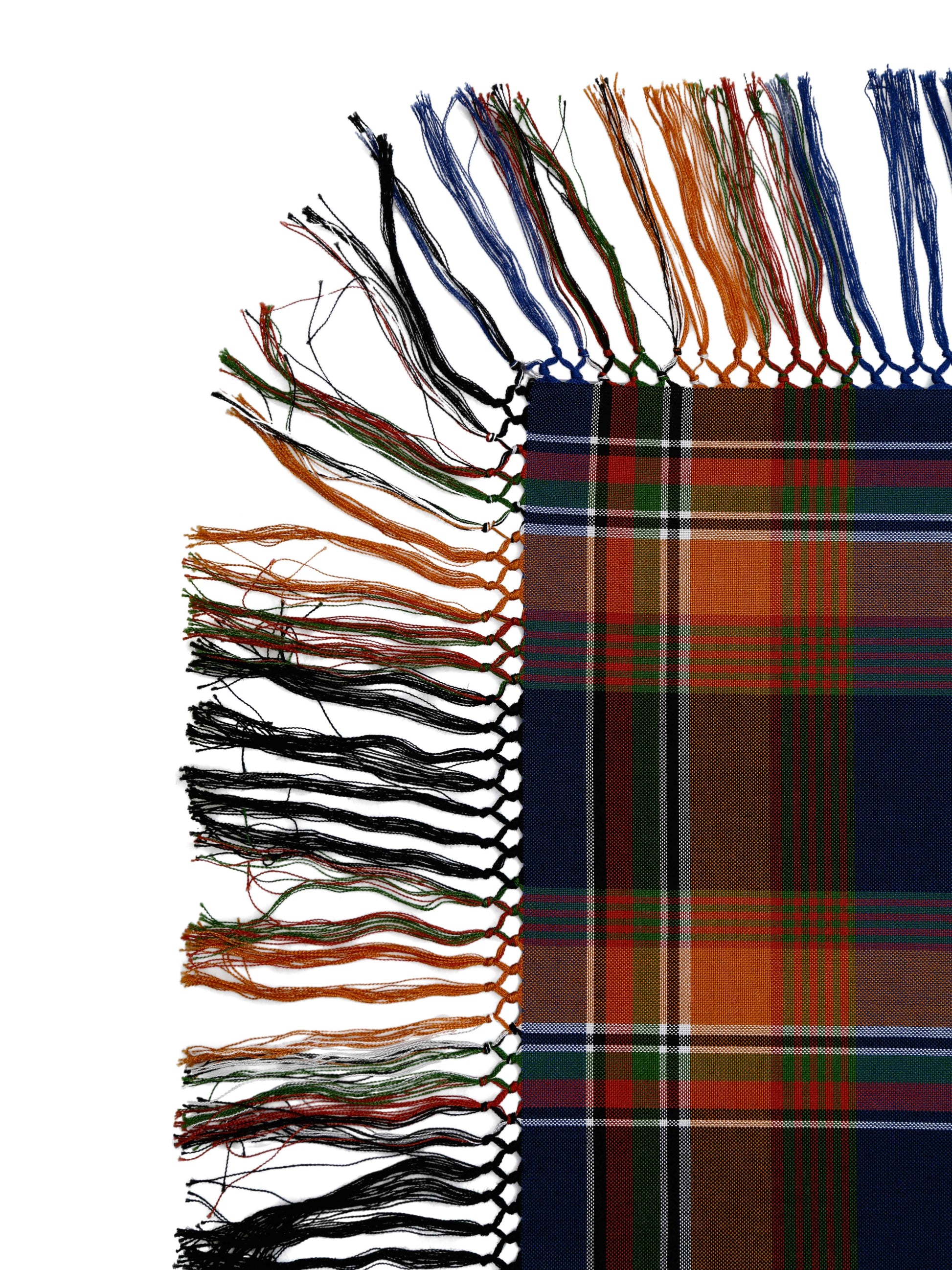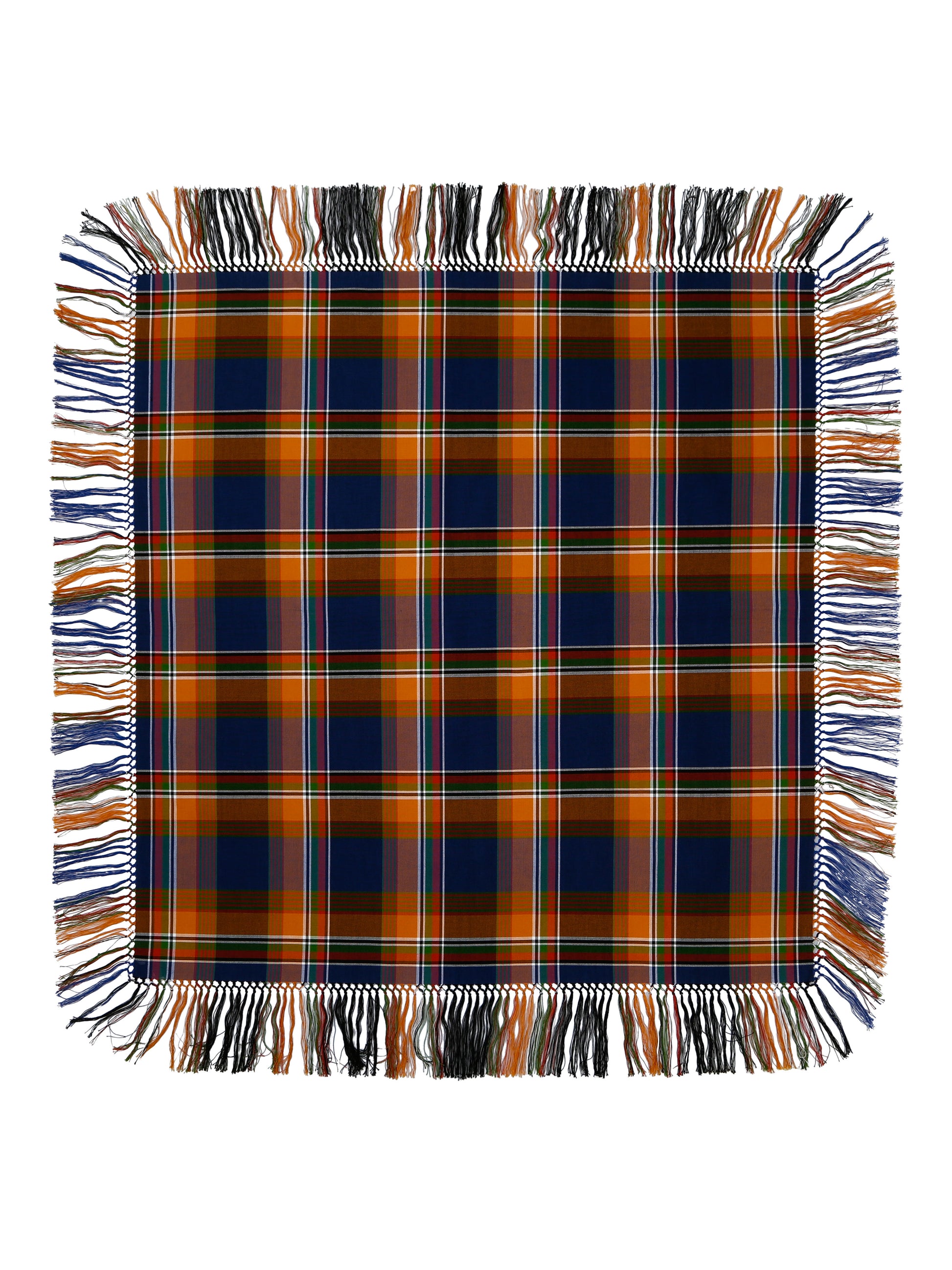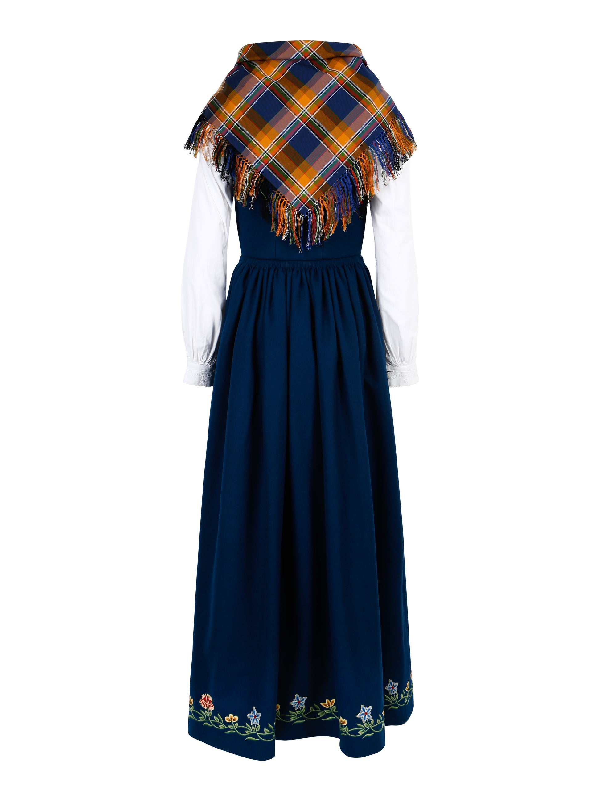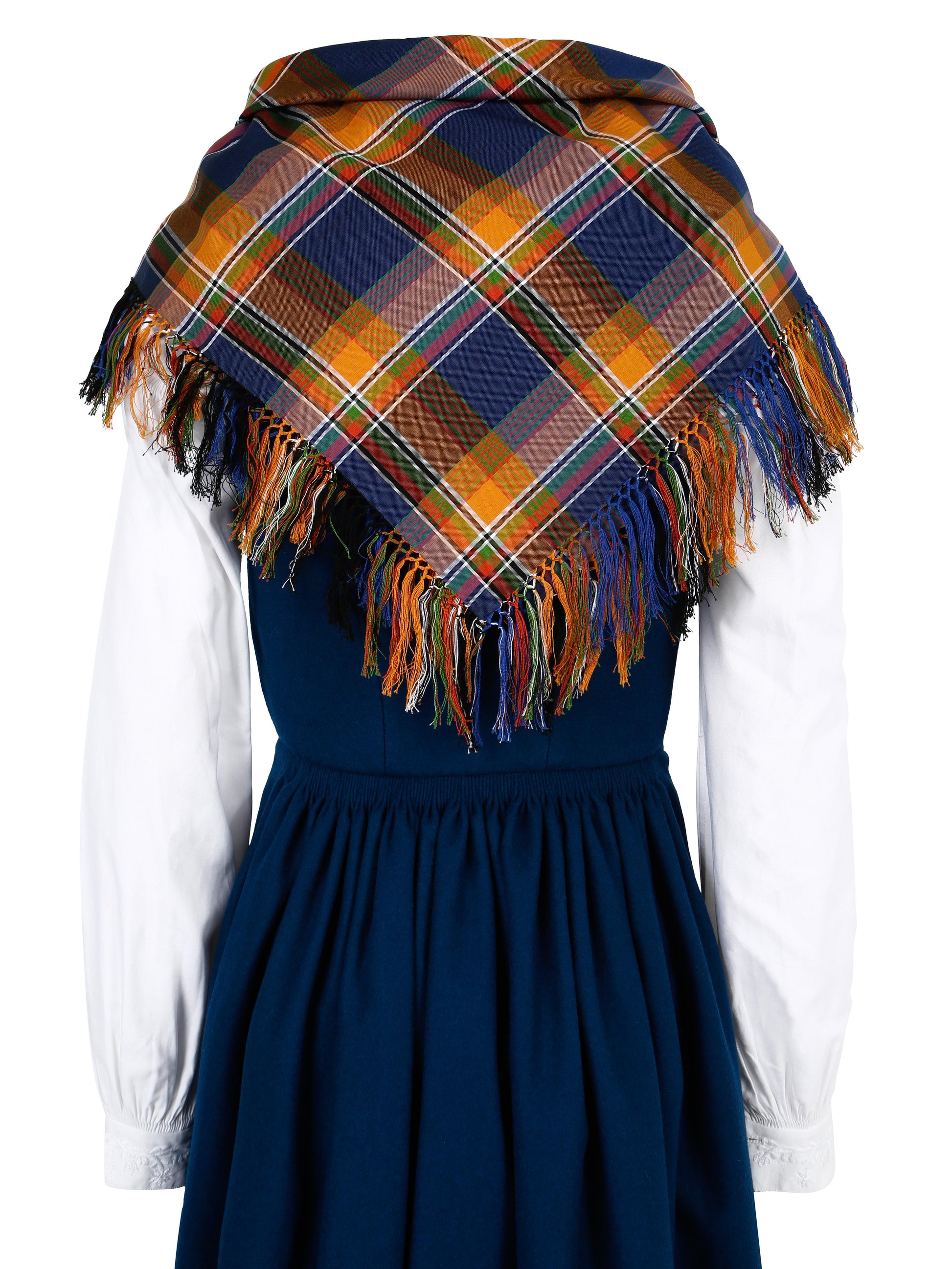 - Forkle og sjal i bomull, med rutet mønster med bunnfarge i blått til blå bunad.