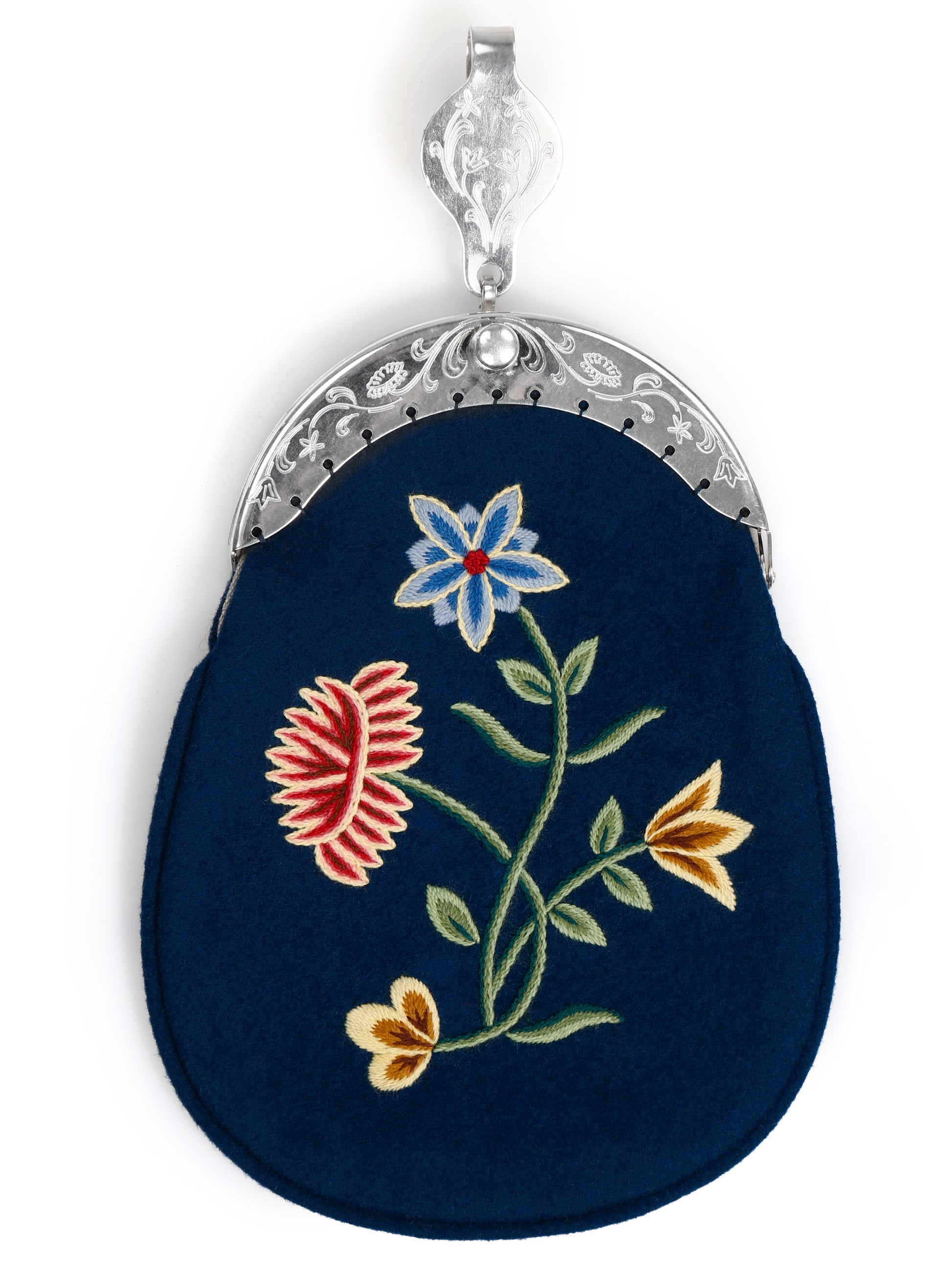 - Bunadsveske med broderier (uten veskelås). Vesken er i samme stoff som liv og stakk. (Både i kvalitet og farge)