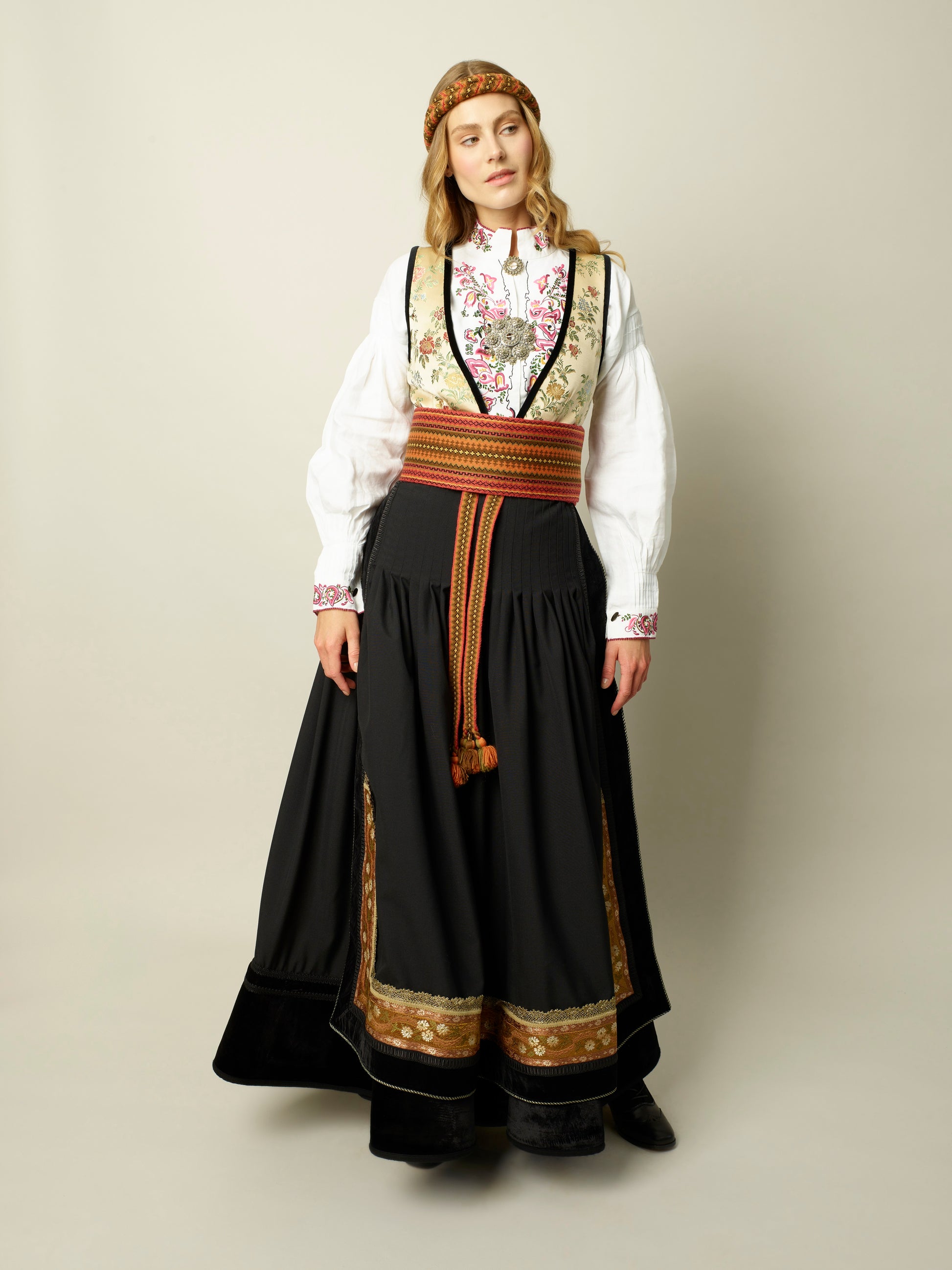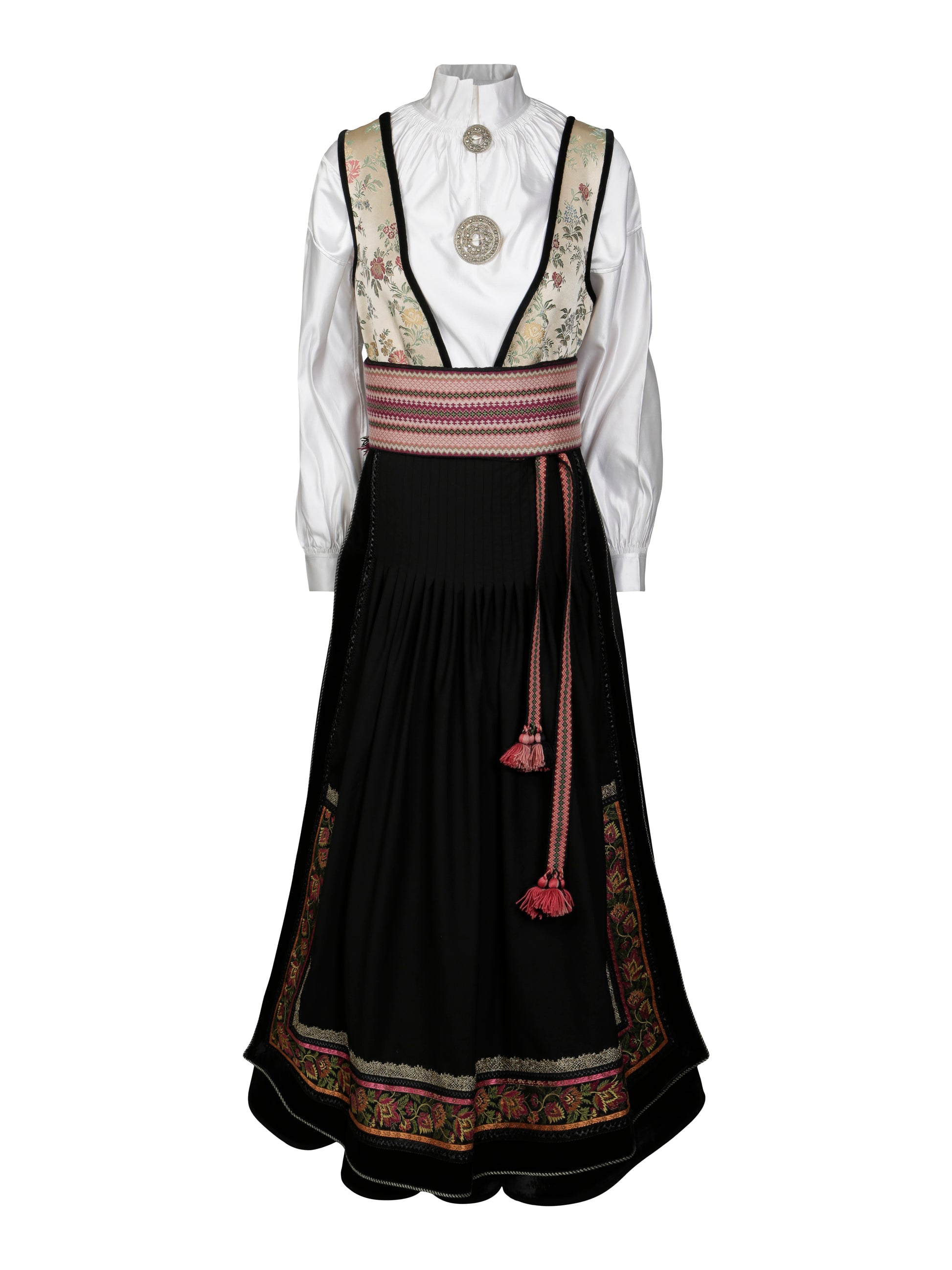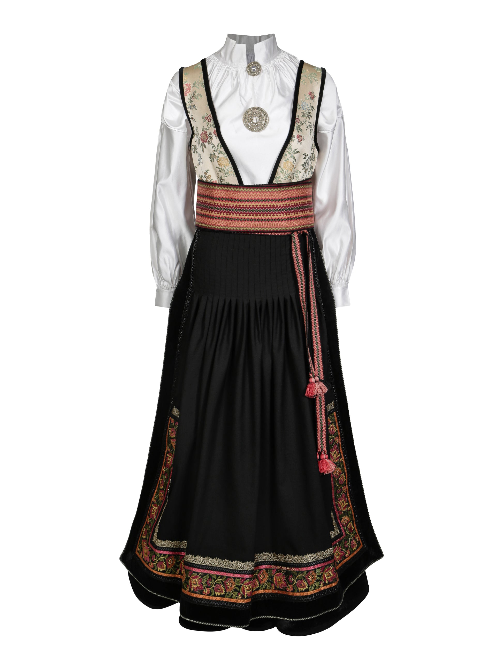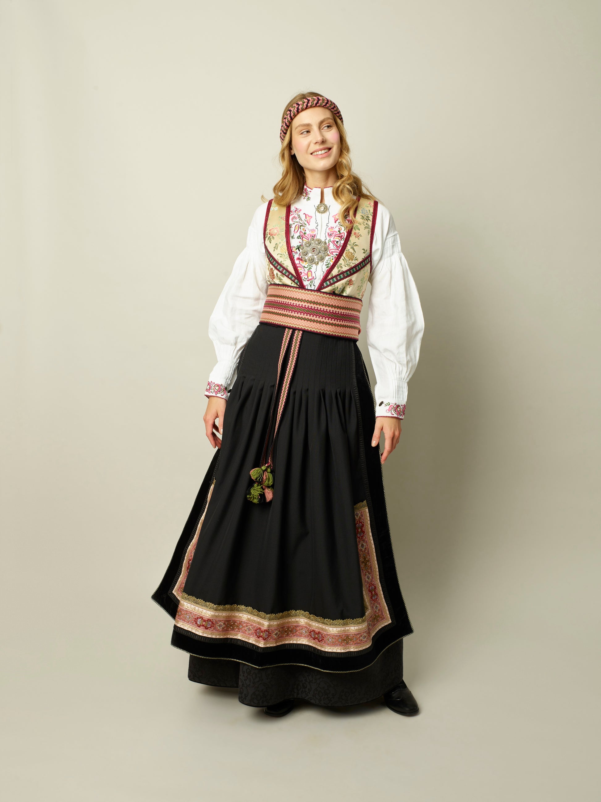 Denne pakken inneholder: Skjorte (hvit) , stakk, vest, belte, forkle og hårvippe. Skjorte i andre farger eller med broderier kan kjøpes i tillegg hvis man ønsker det. Farge på vesten, belte, forkle og hårvippen kan man kombinere selv.