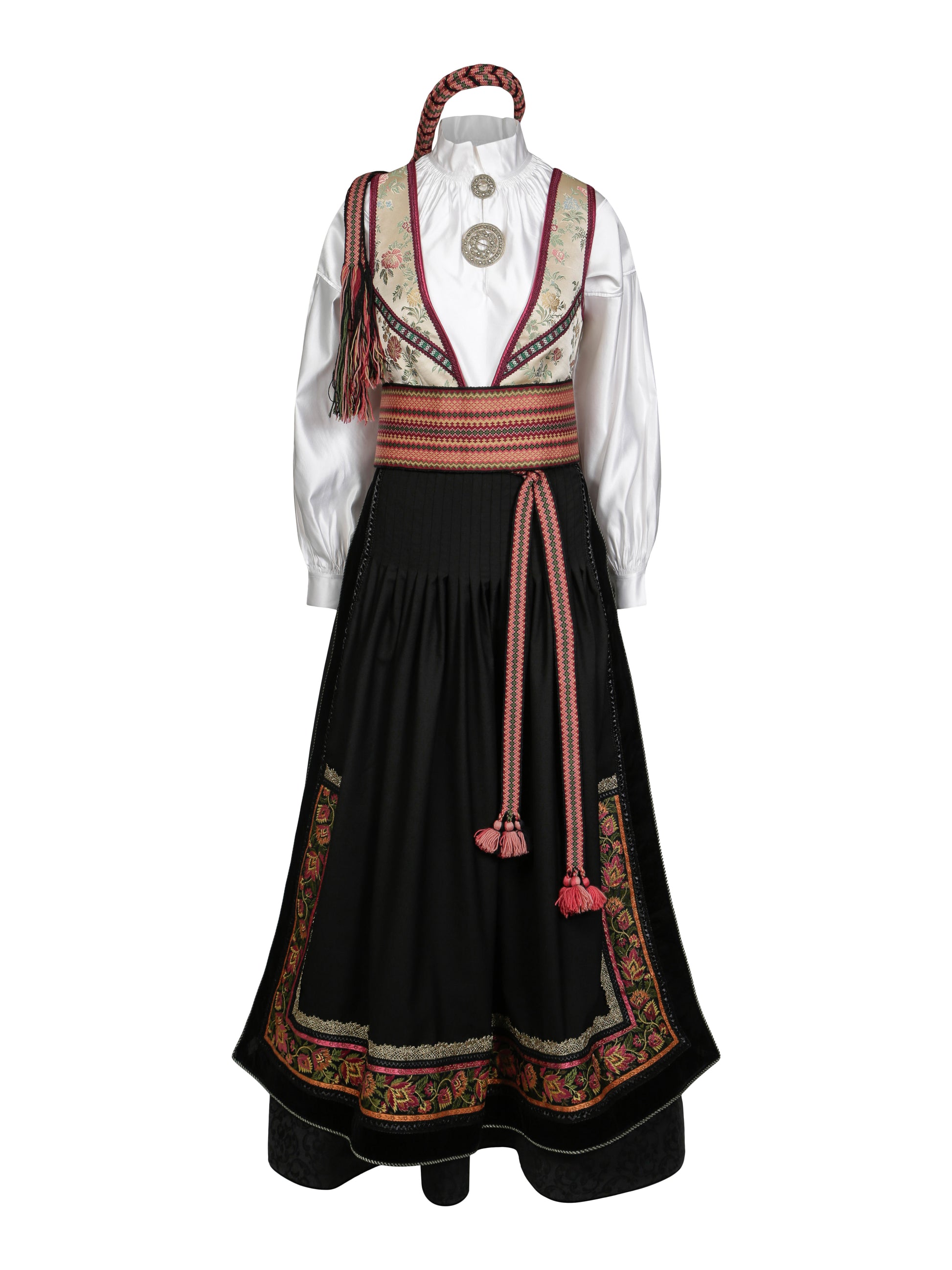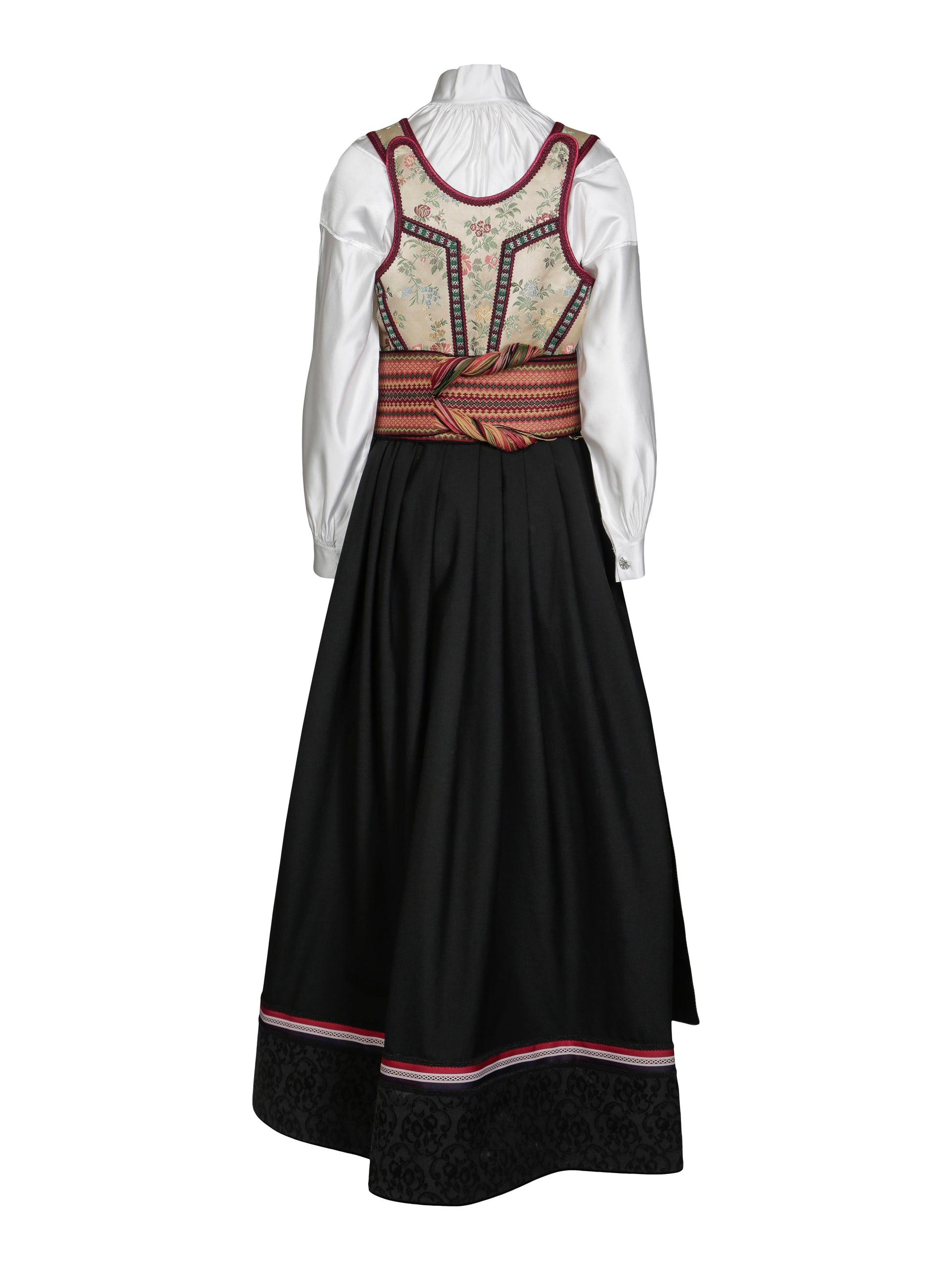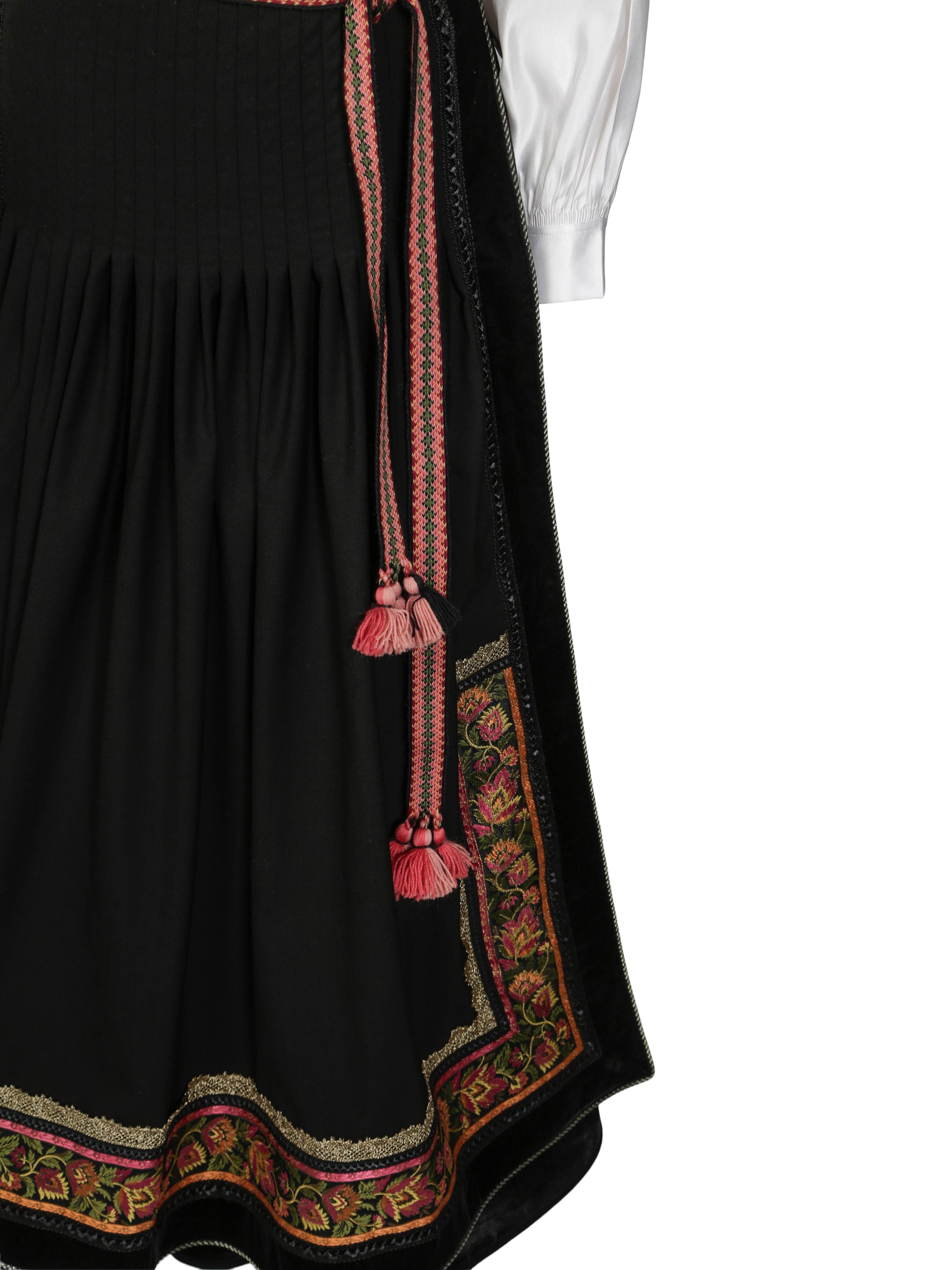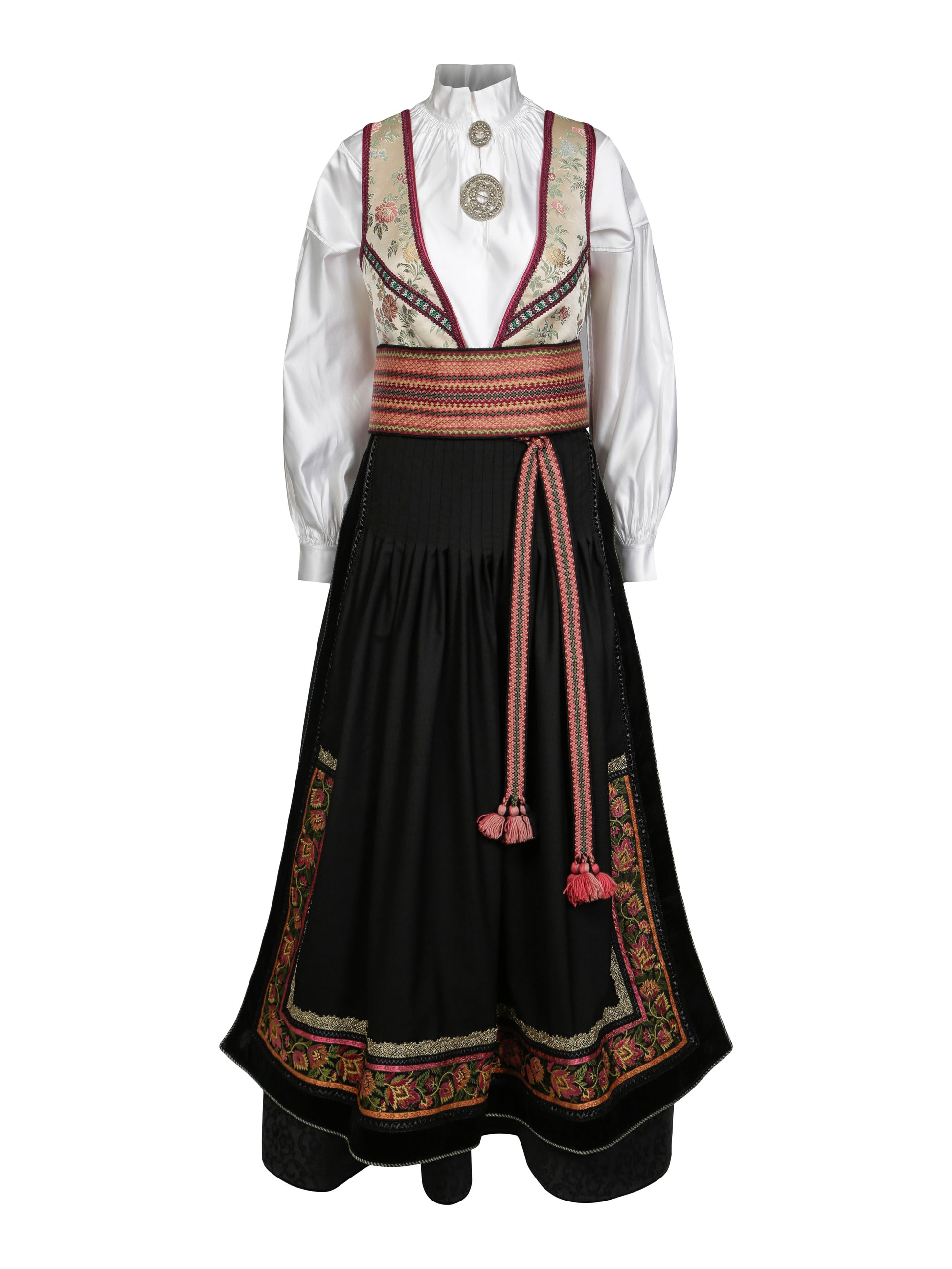Denne pakken inneholder: Skjorte (hvit) , stakk, vest, belte, forkle og hårvippe. Skjorte i andre farger eller med broderier kan kjøpes i tillegg hvis man ønsker det. Farge på vesten, belte, forkle og hårvippen kan man kombinere selv.