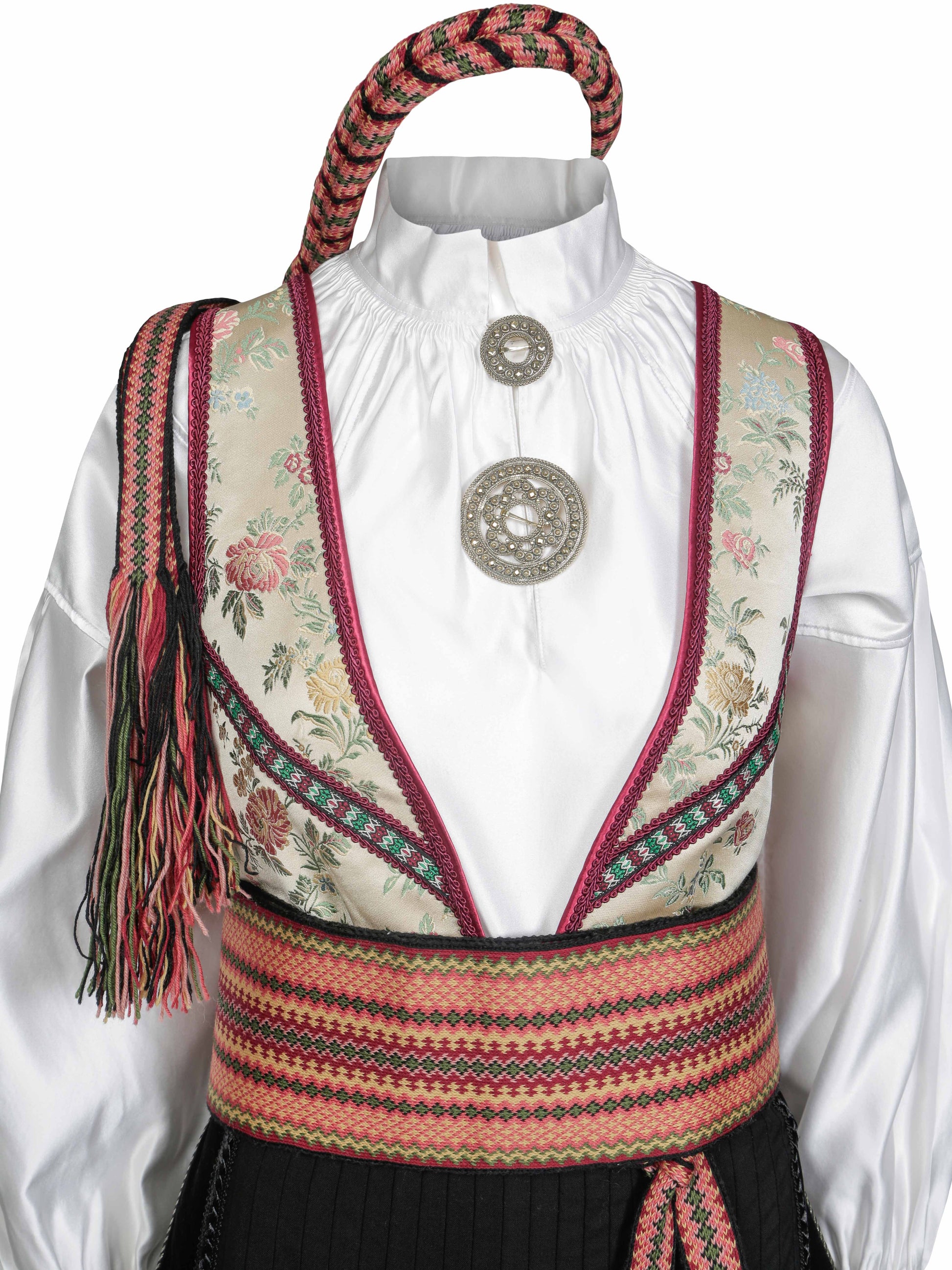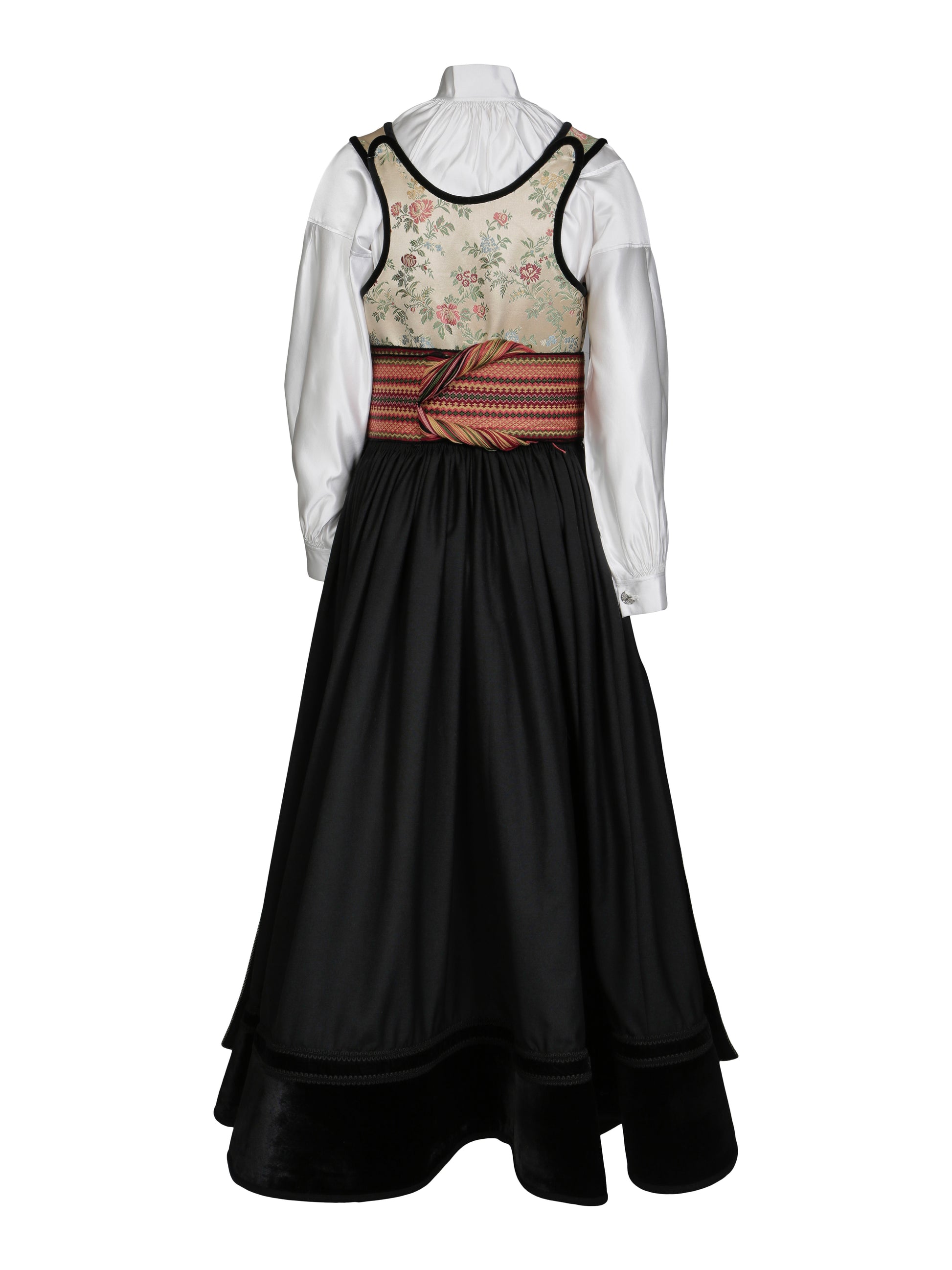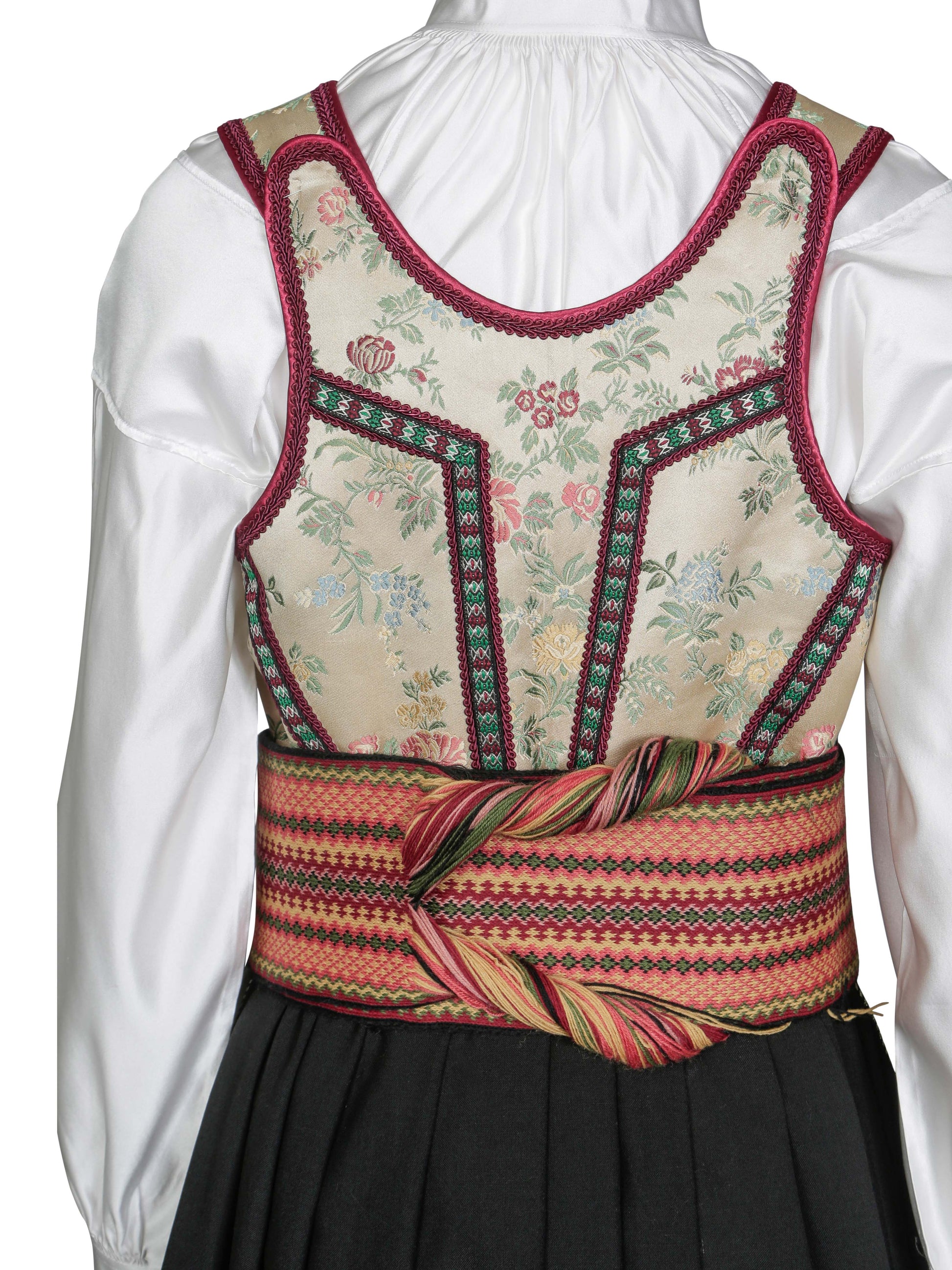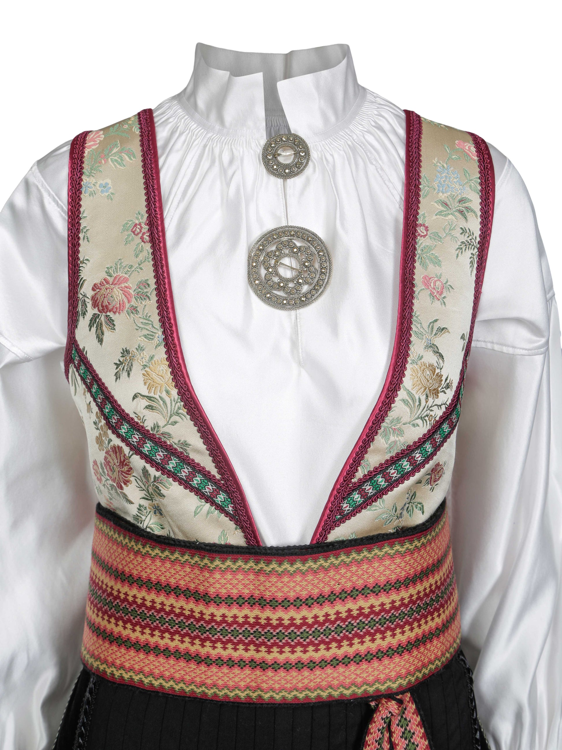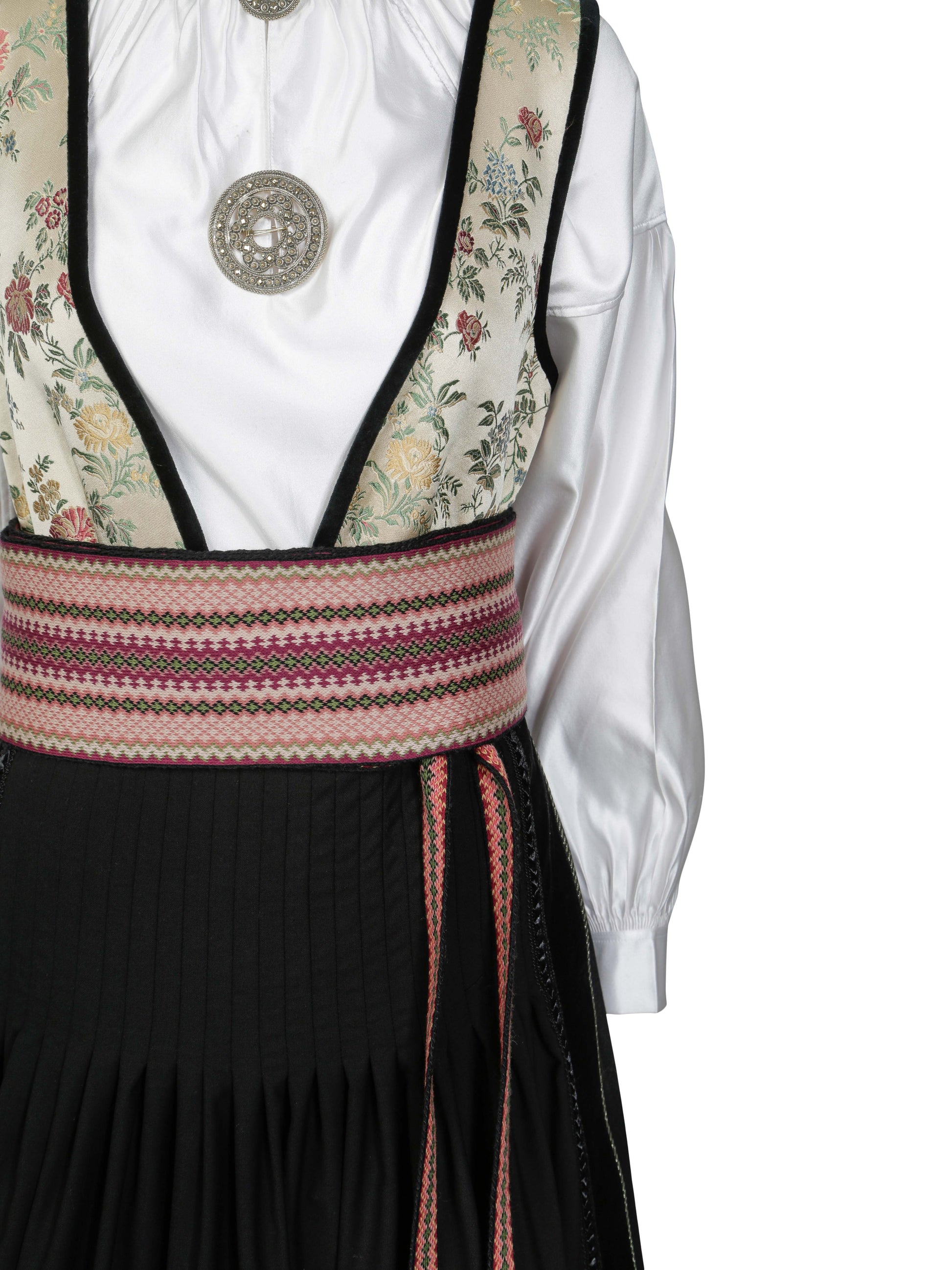 Denne pakken inneholder: Skjorte (hvit) , stakk, vest, belte, forkle og hårvippe. Skjorte i andre farger eller med broderier kan kjøpes i tillegg hvis man ønsker det. Farge på vesten, belte, forkle og hårvippen kan man kombinere selv.