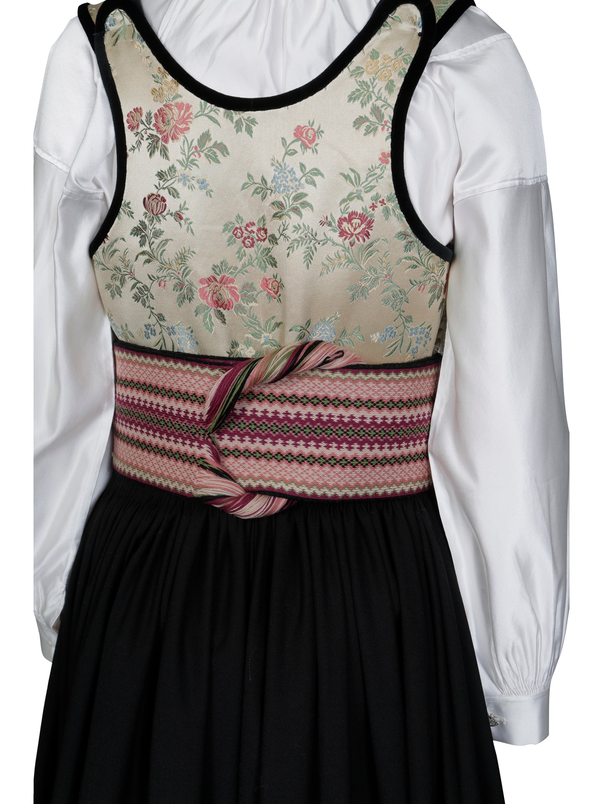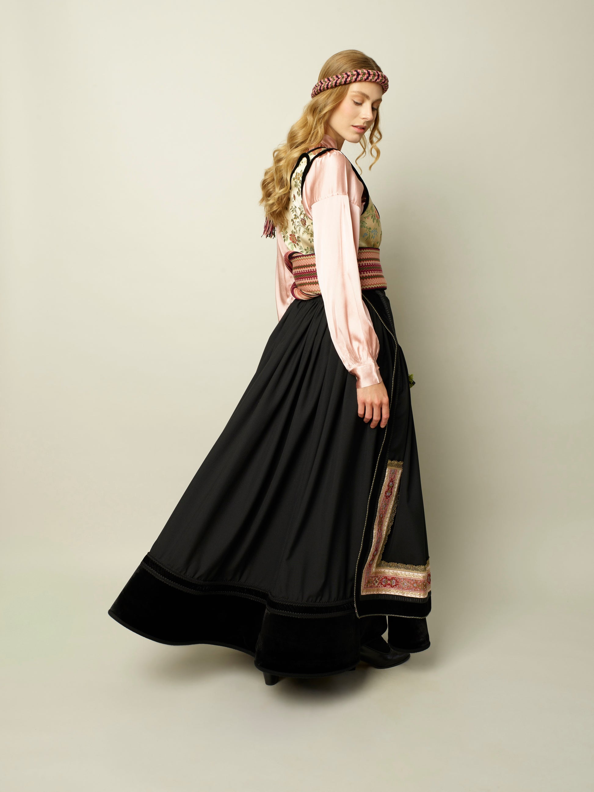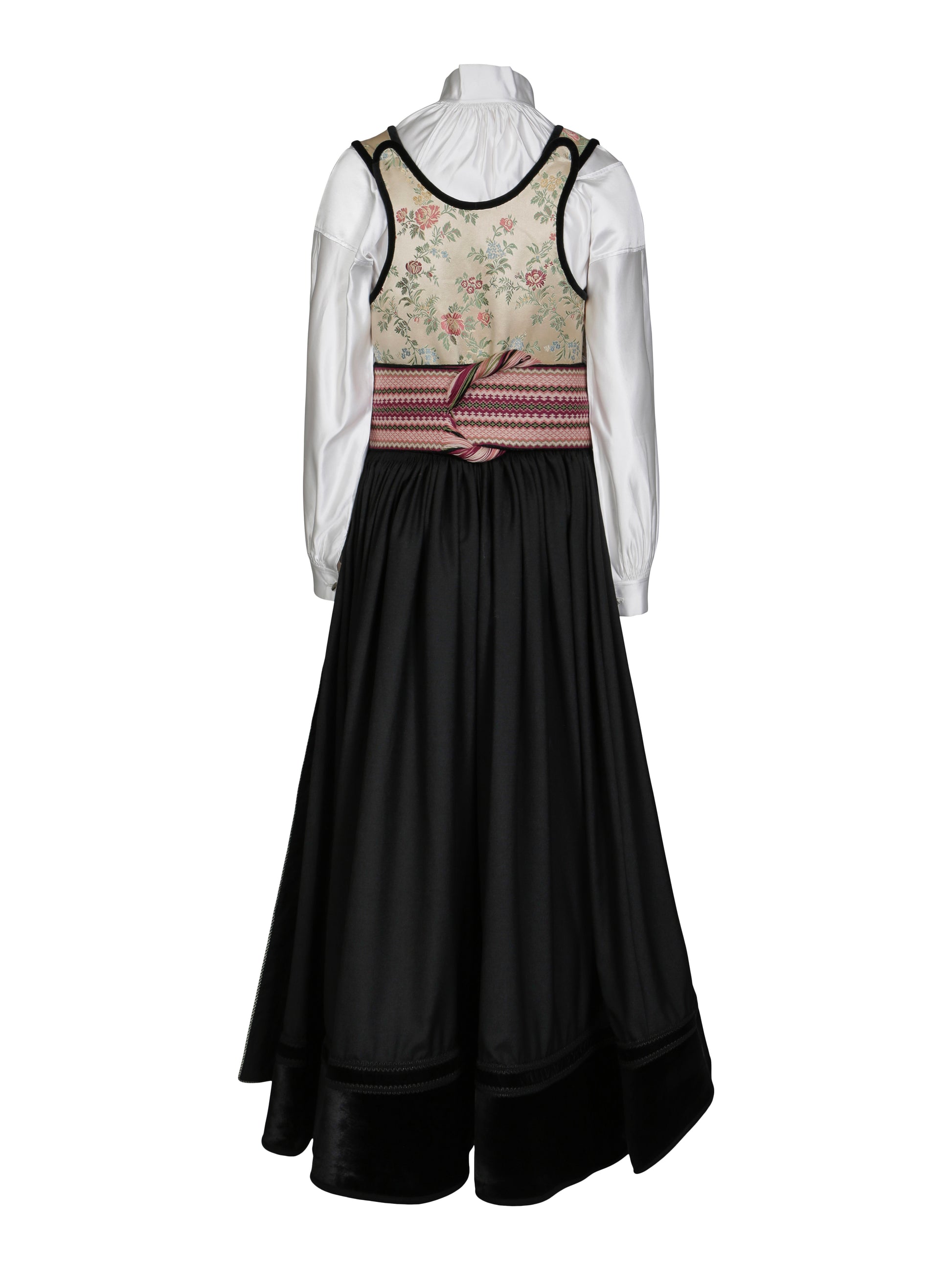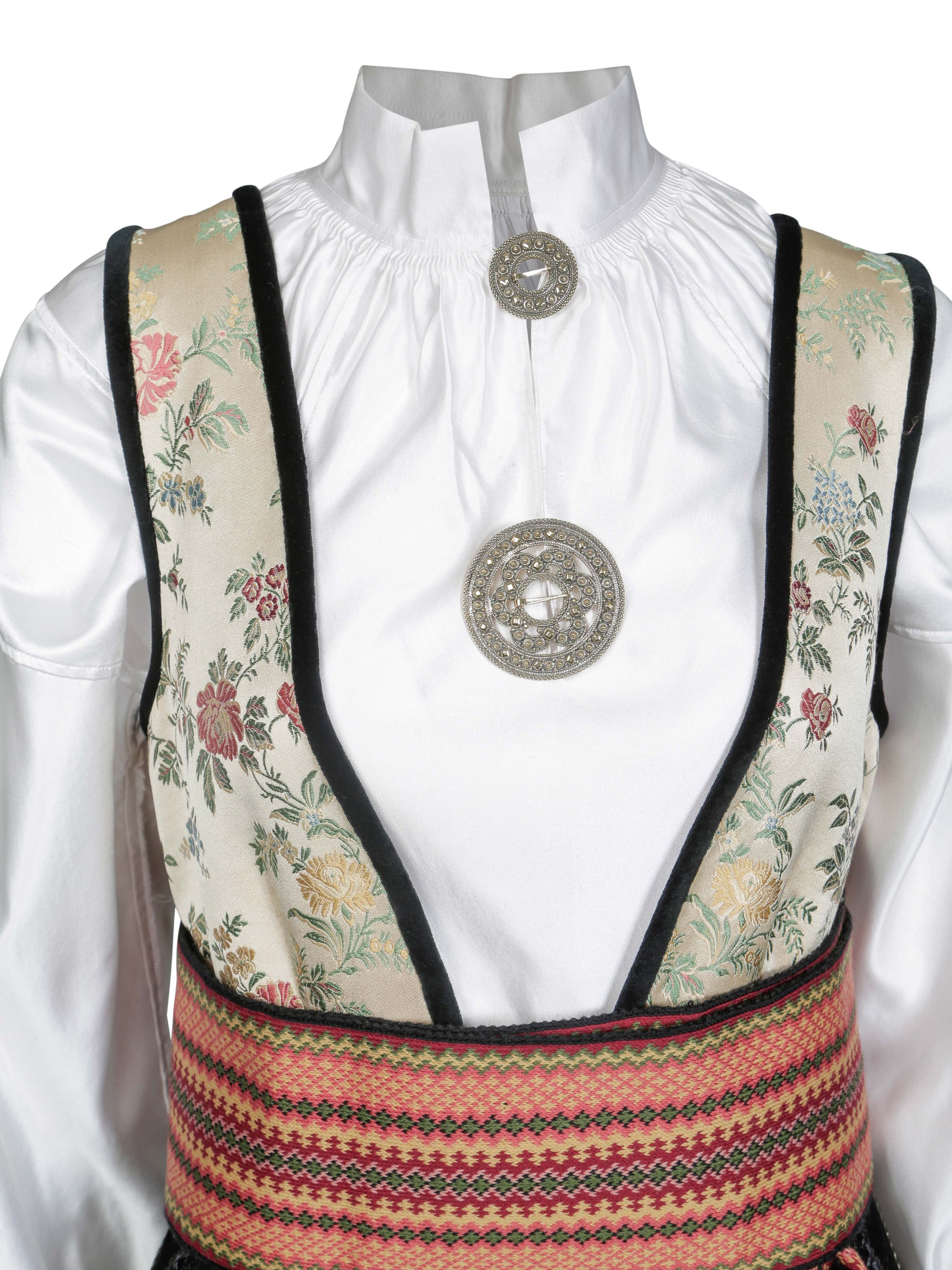 Denne pakken inneholder: Skjorte (hvit) , stakk, vest, belte, forkle og hårvippe. Skjorte i andre farger eller med broderier kan kjøpes i tillegg hvis man ønsker det. Farge på vesten, belte, forkle og hårvippen kan man kombinere selv.