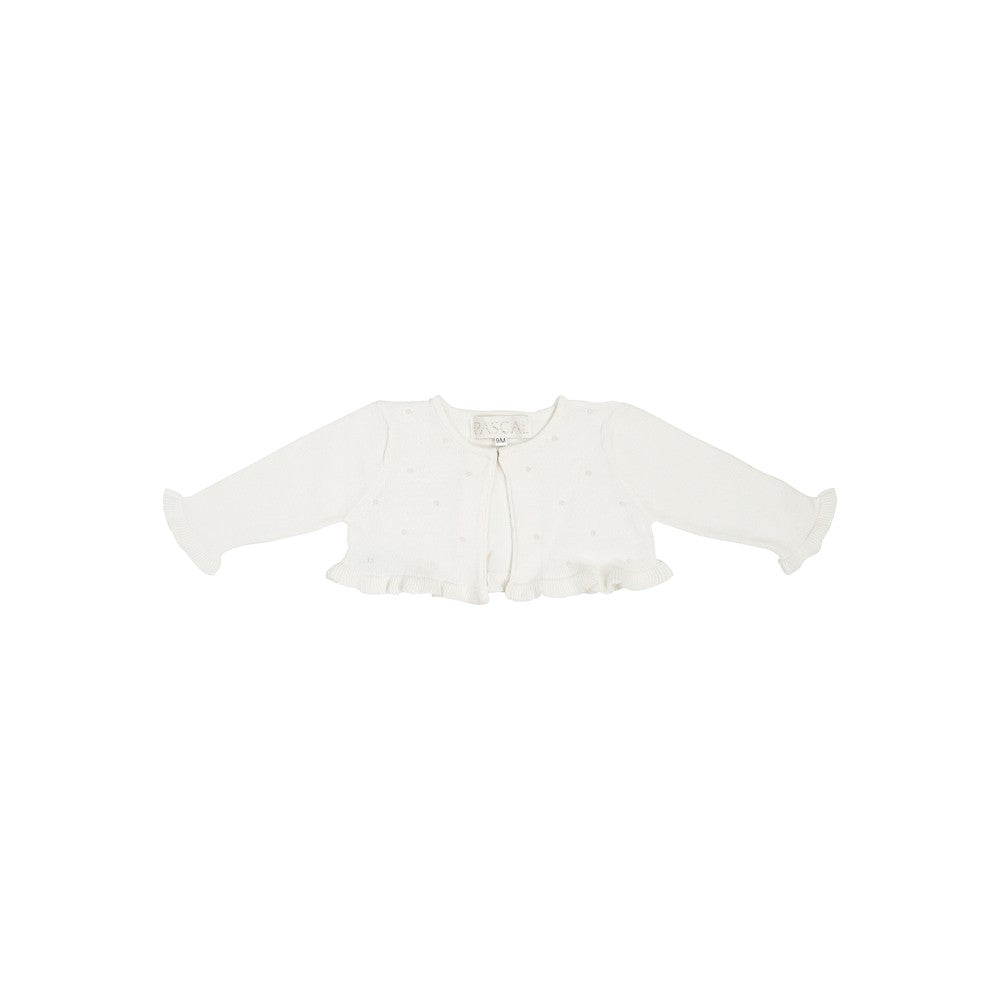 Boleroen har rysjedetaljer og små perler som gjør den ekstra fin og passer perfekt til penklær.